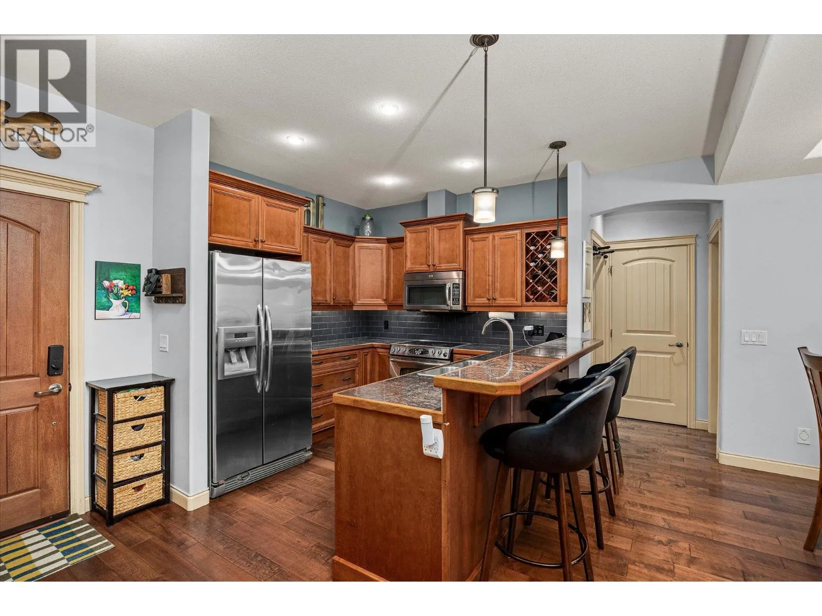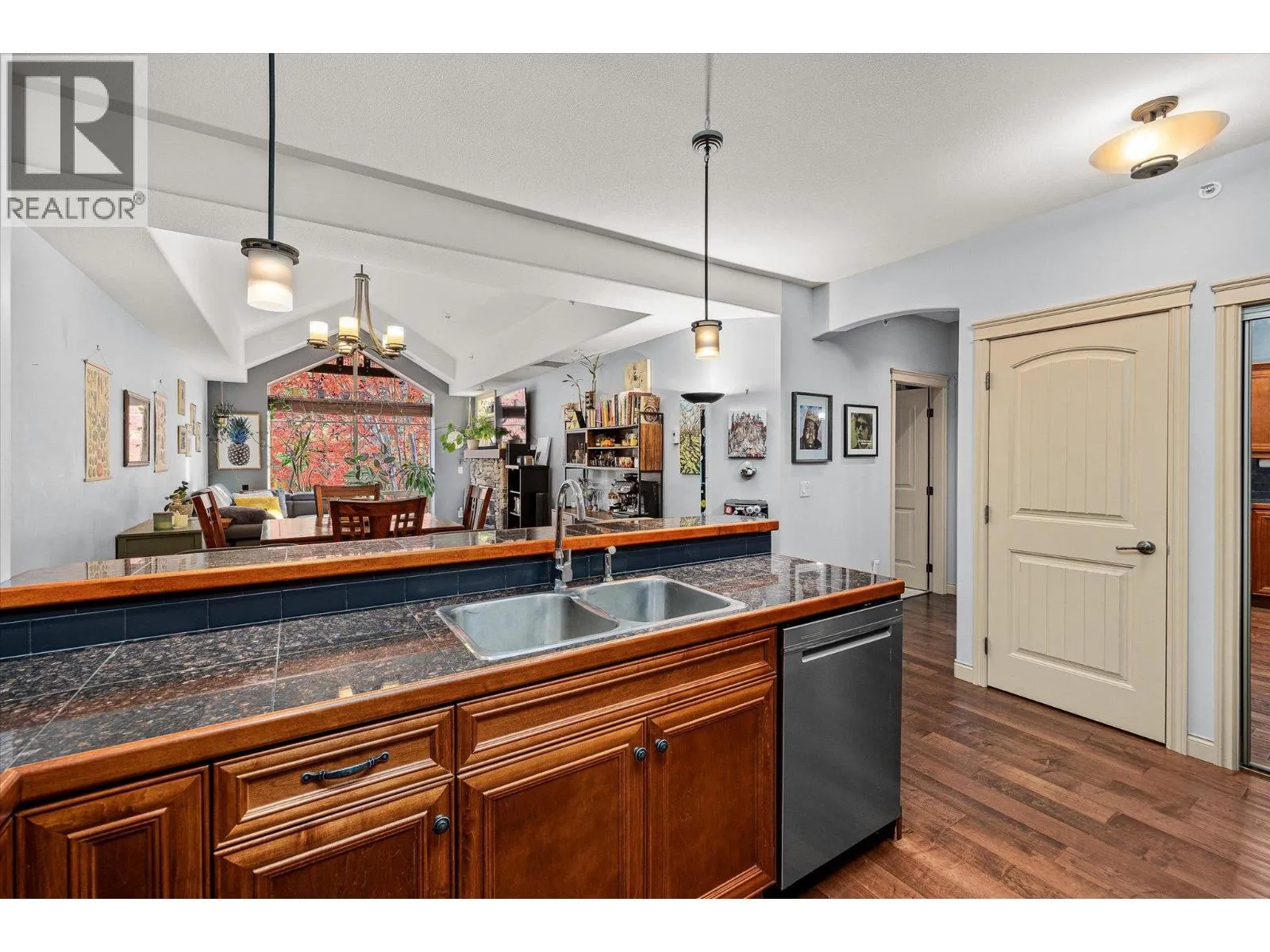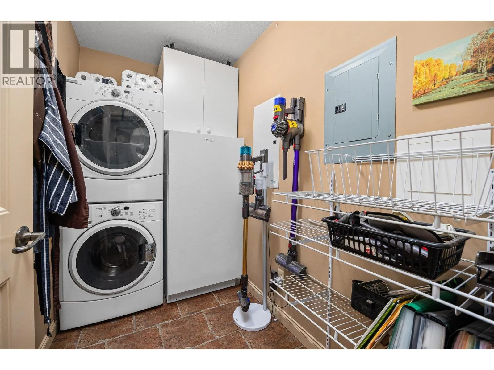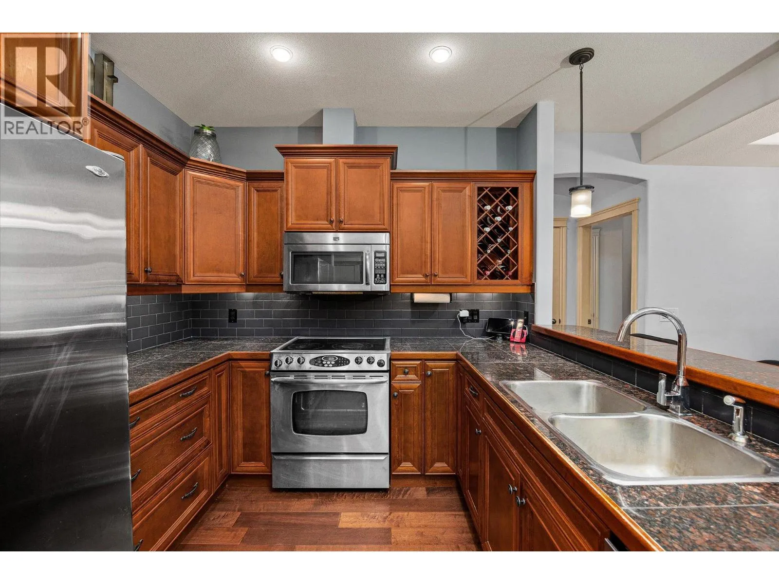 Welcome to Terravita, a gated community backing onto Shannon Lake Golf Course. This bright top-floor 2-bedroom, 2-bath home offers vaulted ceilings, a spacious open-concept layout, and abundant natural light throughout. The kitchen is well-appointed with stainless steel appliances, maple cabinetry, granite countertops, and a convenient eat-in bar, perfect for everyday living and entertaining. Relax by the rock-faced fireplace or step out onto your private deck, where youâll enjoy peaceful views of the maple tree and nearby hiking trails. With no neighbouring units looking in, this elevated location offers exceptional privacy rarely found in condo living. One of the standout features of this home is the impressive amount of storage. In addition to generous in-unit storage and a dedicated in-suite laundry room, the unit includes a large private storage locker located in the parkade. The spacious primary bedroom comfortably accommodates a king-size bed and features a walk-in closet and a 3-piece ensuite. A second generously sized bedroom and a full main bathroom complete the thoughtful layout. This home also includes one underground parking stall, ample visitor parking, and beautiful golf course and mountain views. Ideally located just minutes from schools, shopping, restaurants, wineries, golf, and everything West Kelowna has to offer. Donât miss this opportunity to enjoy top-floor living in a quiet, private setting. (id:27476)