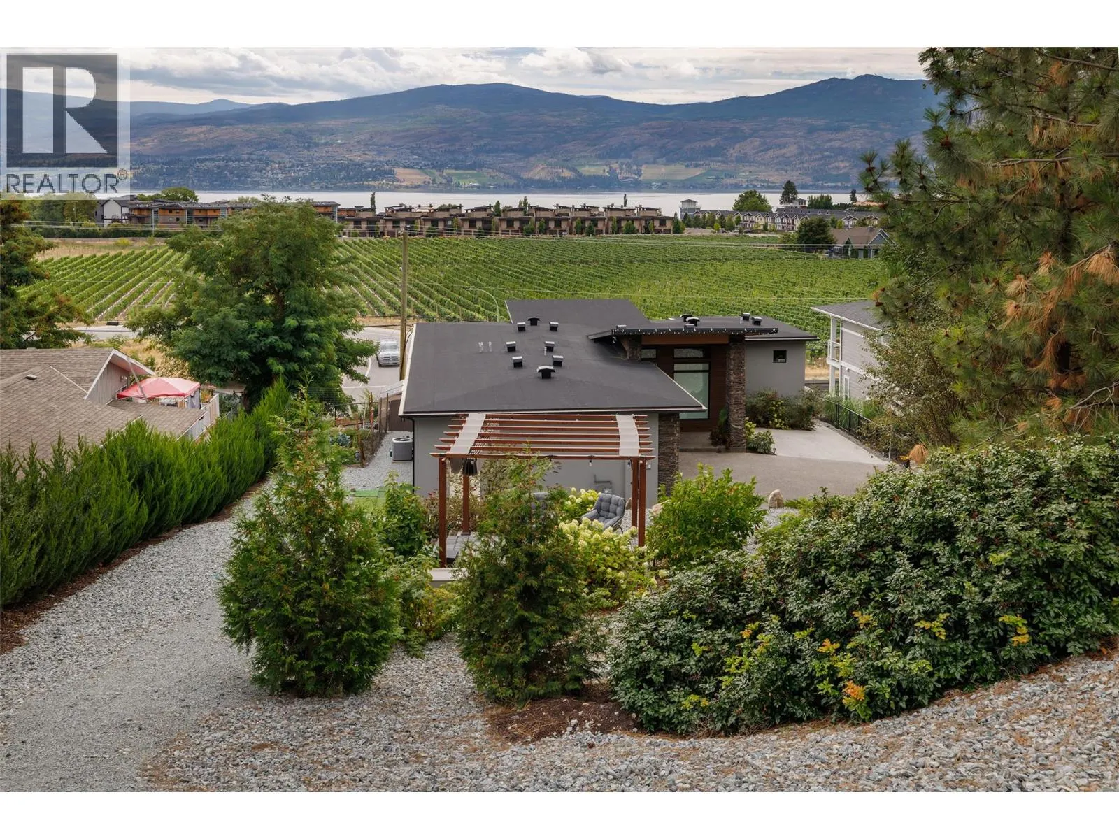 This impeccably built modern residence is designed for elevated main level living while offering the versatility of a lower level ideal for guests or a high earning AirBnB opportunity. Thoughtfully crafted to maximize light, flow, and functionality, the home delivers a rare blend of luxury, comfort, and investment potential. The main floor features a bright open concept kitchen with high end finishes and oversized windows that flood the home with natural light. The primary suite is conveniently located on the main level and offers a spa inspired ensuite with generous proportions. An office, laundry room, and covered deck complete the main floor and enjoy peaceful morning sunrises. The walk out lower level is perfectly suited for extended family or short term rental use, offering two large bedrooms each with its own ensuite, including one that rivals the primary suite. A dining and prep area with a large island and seating creates a welcoming space. Step outside to the private backyard, where a juniper hedge provides privacy and a tranquil hot tub setting. Multiple outdoor living spaces include a stone patio with pergola and additional seating areas with breathtaking vineyard and valley views. Ideally located within walking distance to the beach, vineyards, and the renowned Frind Winery, North Americaâs only waterfront winery, offering dining, live music, yoga, events, and a boat up experience. A rare opportunity for luxury living with exceptional income potential. (id:27476)