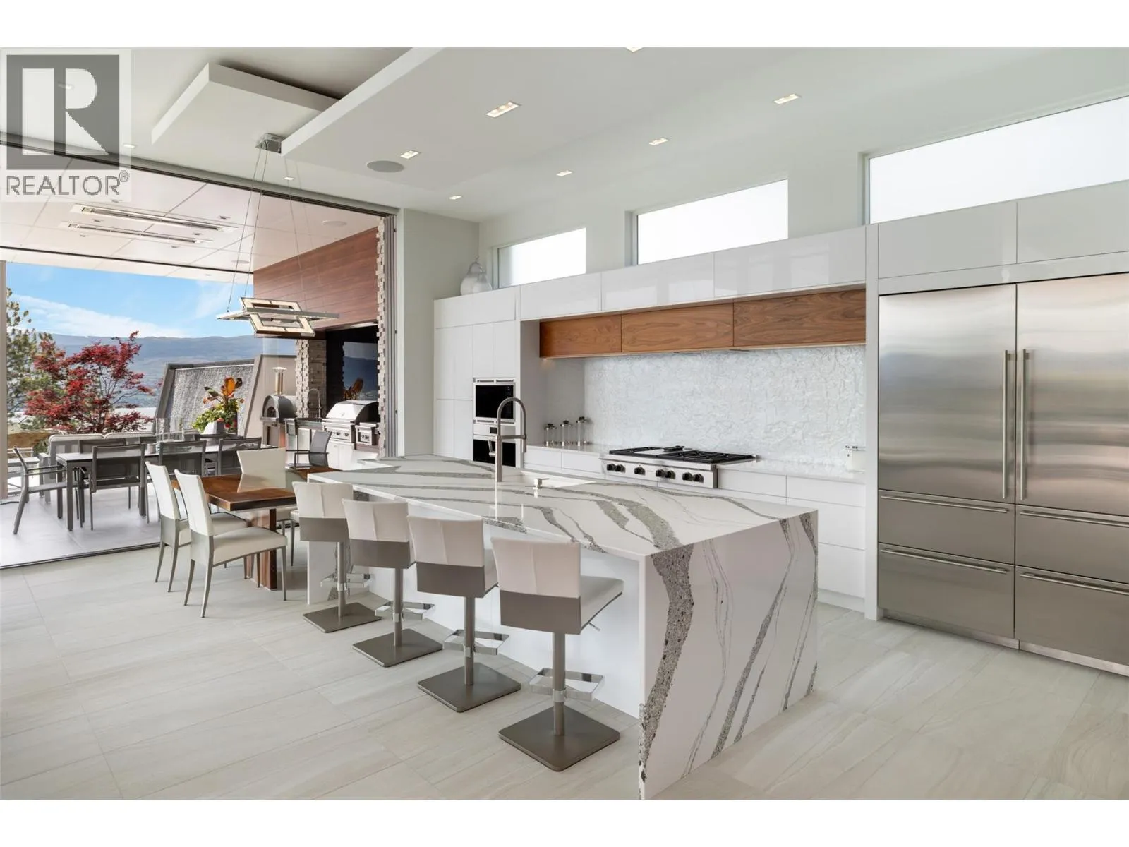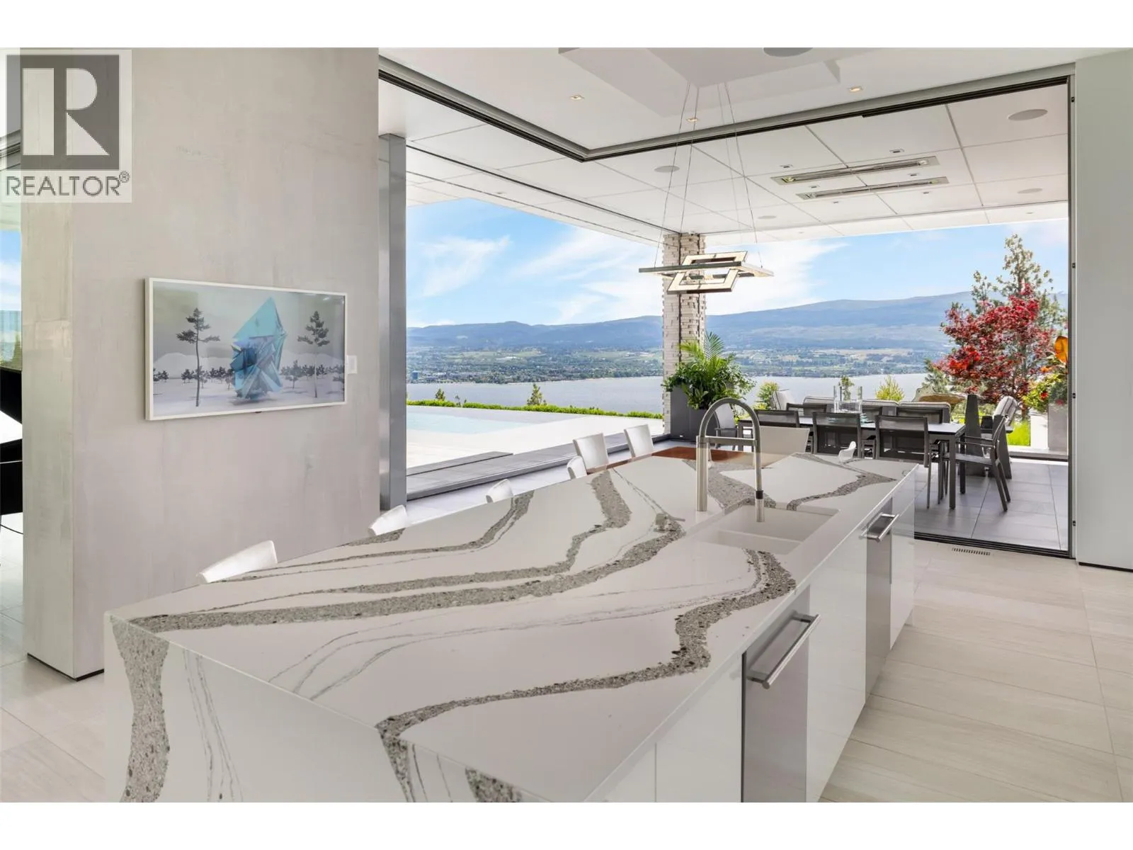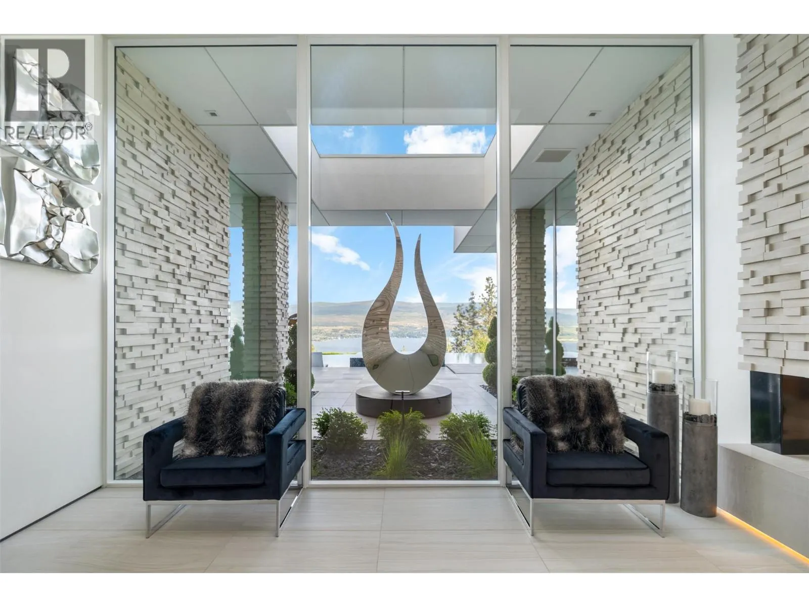 Discover unparalleled luxury at this magnificent custom Okanagan home. As you pass through the gate, you'll immediately be captivated by its design. The modern aesthetic seamlessly integrates the home with its landscaping, creating a harmonious experience. The entry features a mesmerizing floating roof design inspired by a museum in Spain, and light filled courtyard to display custom artwork Inside, entertain at the custom bar, enjoy a cinematic experience in the state-of-the-art home theatre, and store your prized vintages in the 1,500-bottle wine room. For seamless indoor to outdoor living all the sliding doors open to a completely private backyard offering a sensational living experience: prepare a culinary feast in the outdoor kitchen, lounge by the expansive saltwater vanishing edge pool, or soak in the hot tub, all while enjoying the relaxing ambiance of the waterfall and 180-degree views of Okanagan Lake. Take the floating walnut staircase or the elevator upstairs. The primary bedroom is a retreat like no other, with a private patio, luxurious lake view en suite, and a stunning custom closet. Three additional bedrooms each have their own en suite. For the car enthusiast, this home boasts 2 levels of garages with parking for 7+ vehicles. Exquisite finishes include porcelain tile floors, Cambria quartz, &unmatched glass and walnut woodwork by Shawn Truit. This custom home stands as a masterpiece of design and engineering. (id:27476)