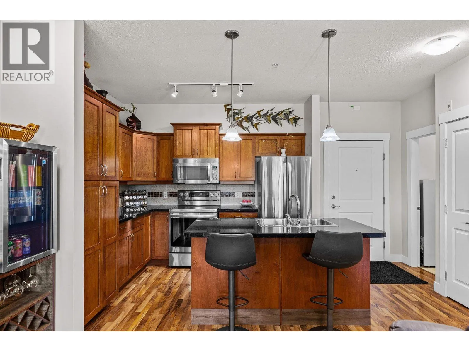 Stunning Views & Lifestyle at The Aria Wake up to breathtaking sunrises over the lake and the lush fairway of the first hole from this immaculate 2-bedroom, 2-bathroom condo in West Kelownaâs prestigious Aria development. This stylish home offers an unparalleled Okanagan living experience with nothing left to do but move in. The bright, open-concept layout features massive east-facing windows and a chefâs kitchen equipped with brand-new stainless appliances, granite counters, and timeless maple cabinetry. The oversized master suite offers private deck access and a spa-like ensuite with a double vanity and soaker tub. Relax on your huge glass-railing deck as you overlook the Two Eagles Golf Course and the evening lights of Mission Hill Winery. Key Features & Unbeatable Value: Rare Parking: Two side-by-side stalls in the heated parkade right by the entrance. Use both or rent one! Financial Ease: Prepaid Lease and No Property Transfer Tax. Low Costs: Fees include hot water, water, and garbage. Electricity averages only $30â$40/month. Flexibility: Pet and rental-friendly! Whether youâre a golf enthusiast or seeking a serene retreat, this piece of paradise offers security, convenience, and world-class views. (id:27476)