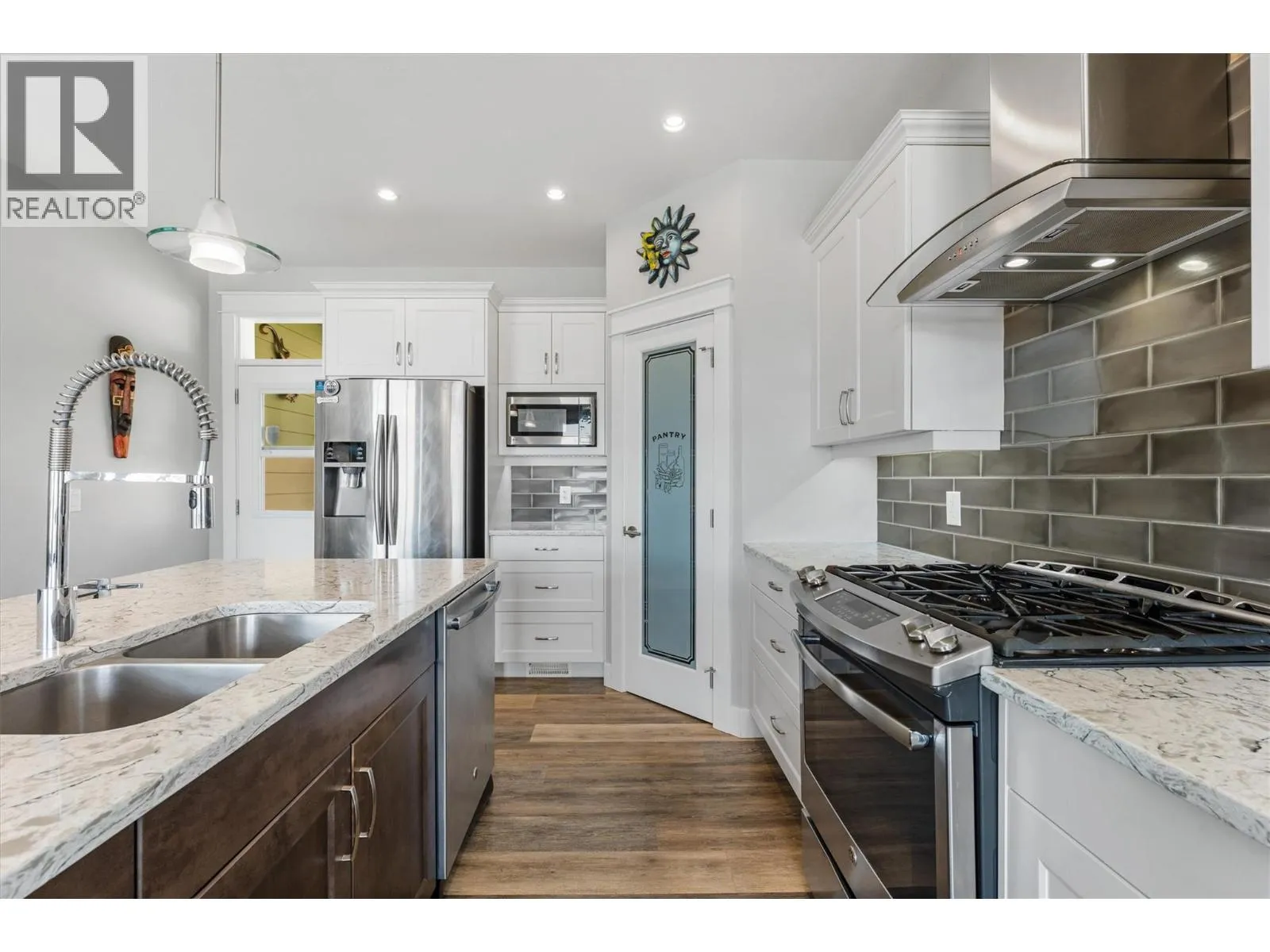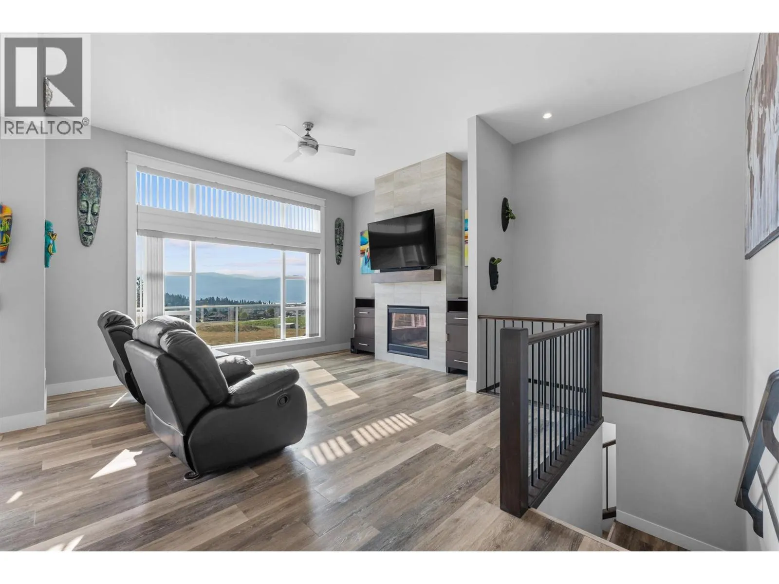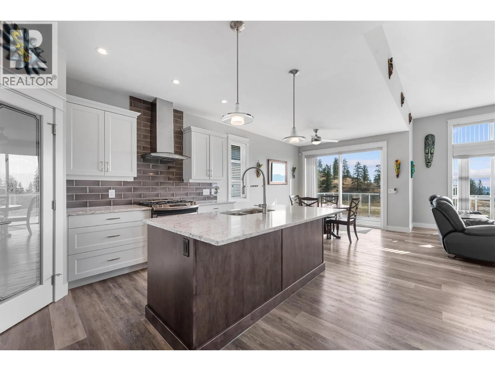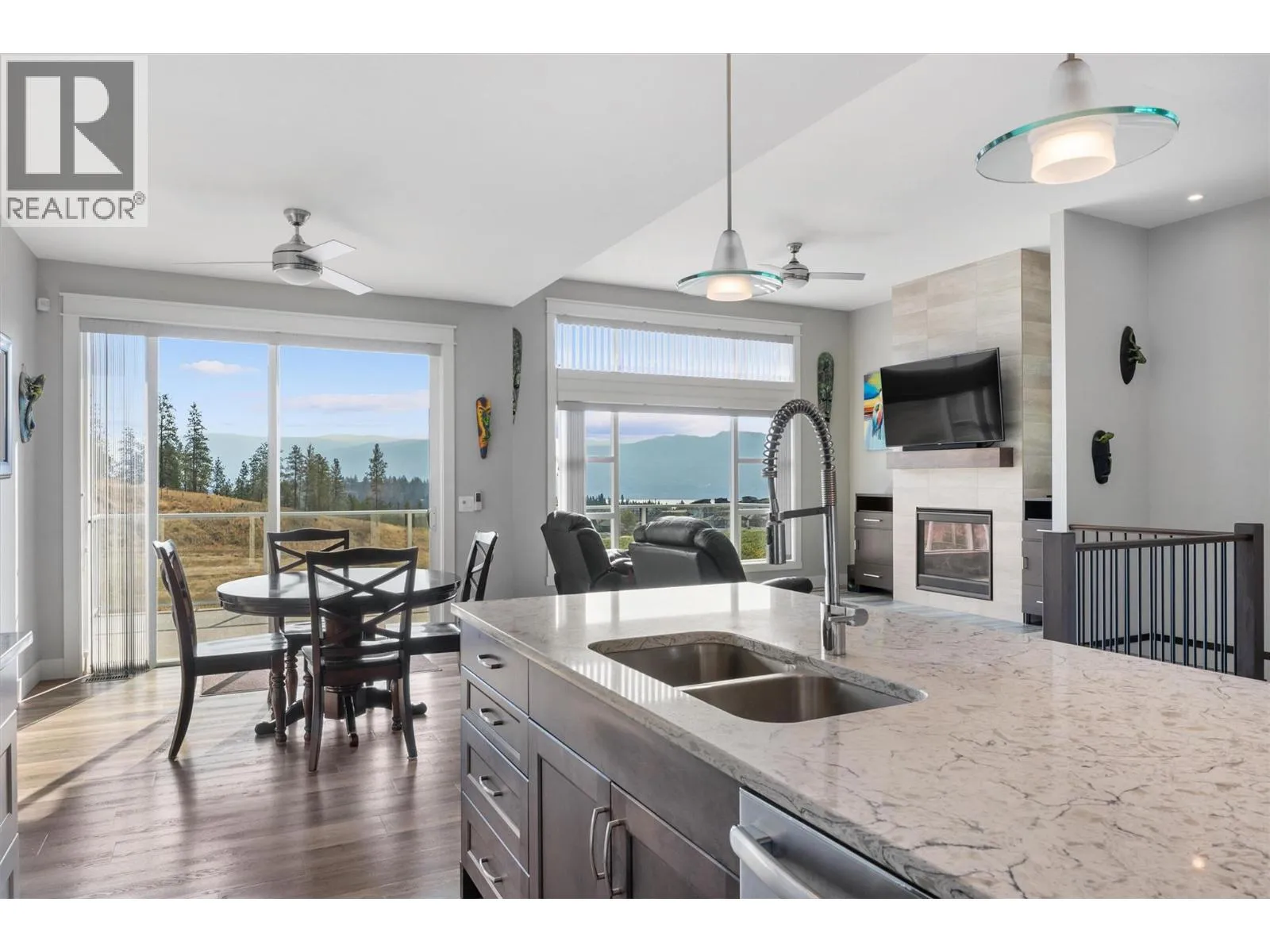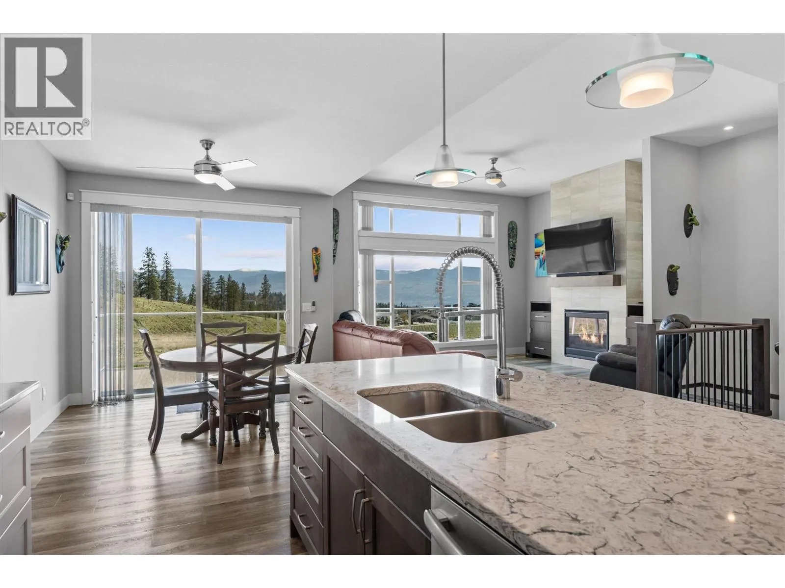 Perched above the vineyards in one of West Kelownaâs most desirable neighborhoods, this thoughtfully designed home captures sweeping lake and mountain views. Expansive windows fill the open concept main level with natural light, while vaulted ceilings and a gas fireplace add warmth and a sense of scale. The kitchen balances everyday function with polished style, featuring quartz countertops, a large island, a gas range, stainless steel appliances, and a walk in pantry. The dining area opens seamlessly to a covered patio wired for a hot tub, while low maintenance landscaping and astronomical timed lighting create an inviting setting into the evening. The primary suite is positioned to take in the view and includes a private ensuite, while a self contained one bedroom suite on the lower level, complete with its own entrance and laundry, offers flexibility for extended family, guests, or mortgage helping rental income. The oversized heated garage accommodates a full size truck and includes a workbench and added storage. There is also dedicated RV parking, along with practical features such as built in vacuum and a BreathRite fresh air exchange system. Just minutes from golf courses, wineries, hiking trails, and shopping, this well maintained home brings together peaceful surroundings, everyday convenience, and thoughtful design. (id:27476)