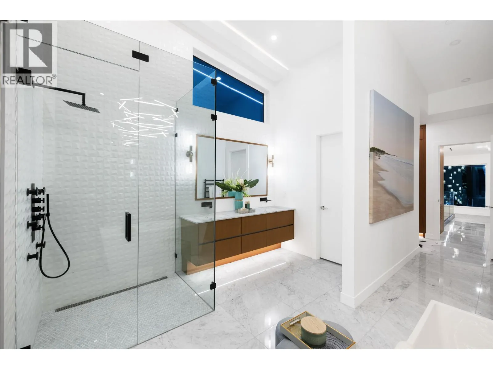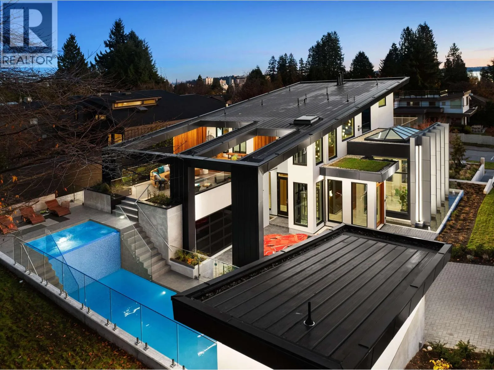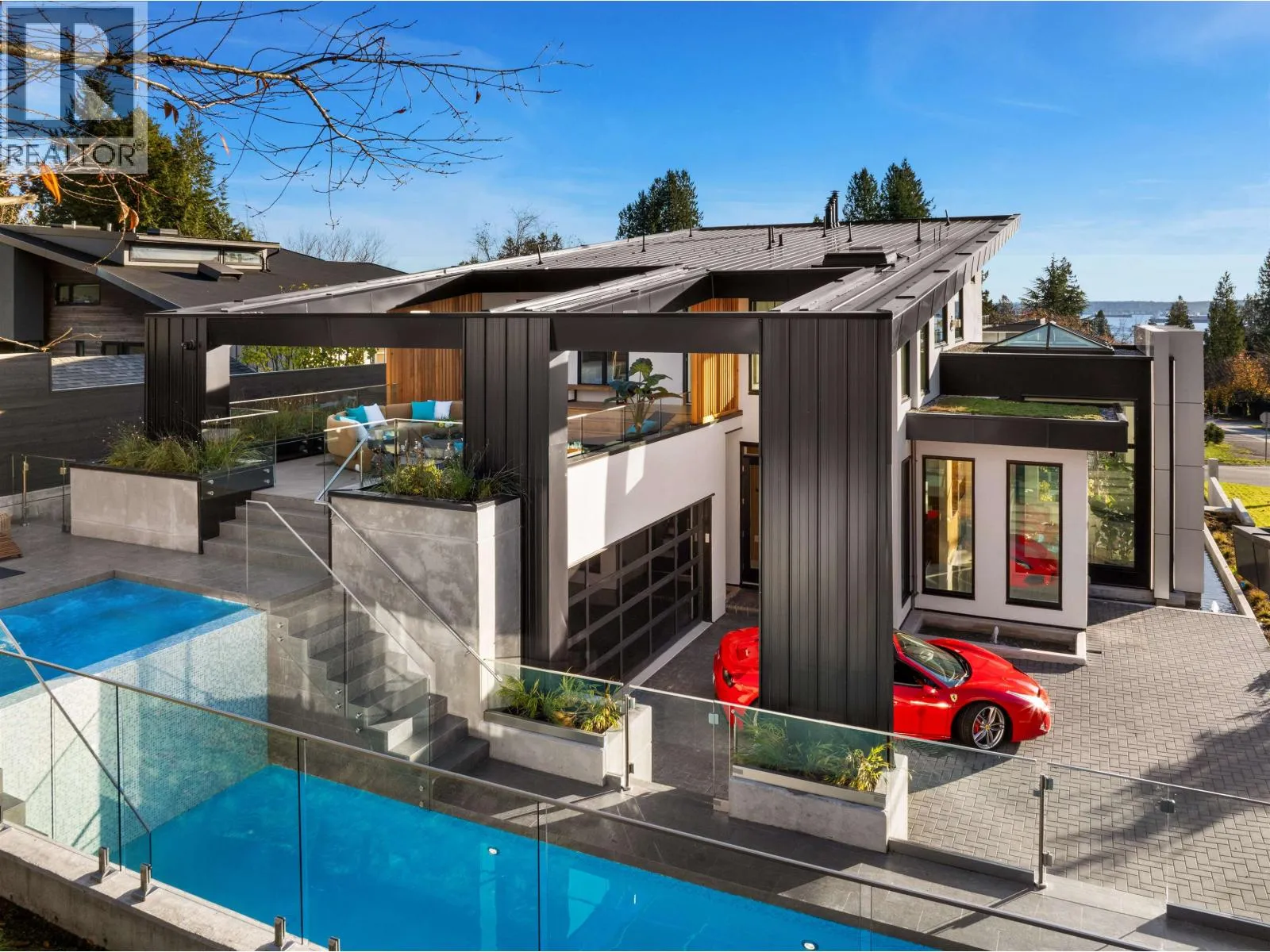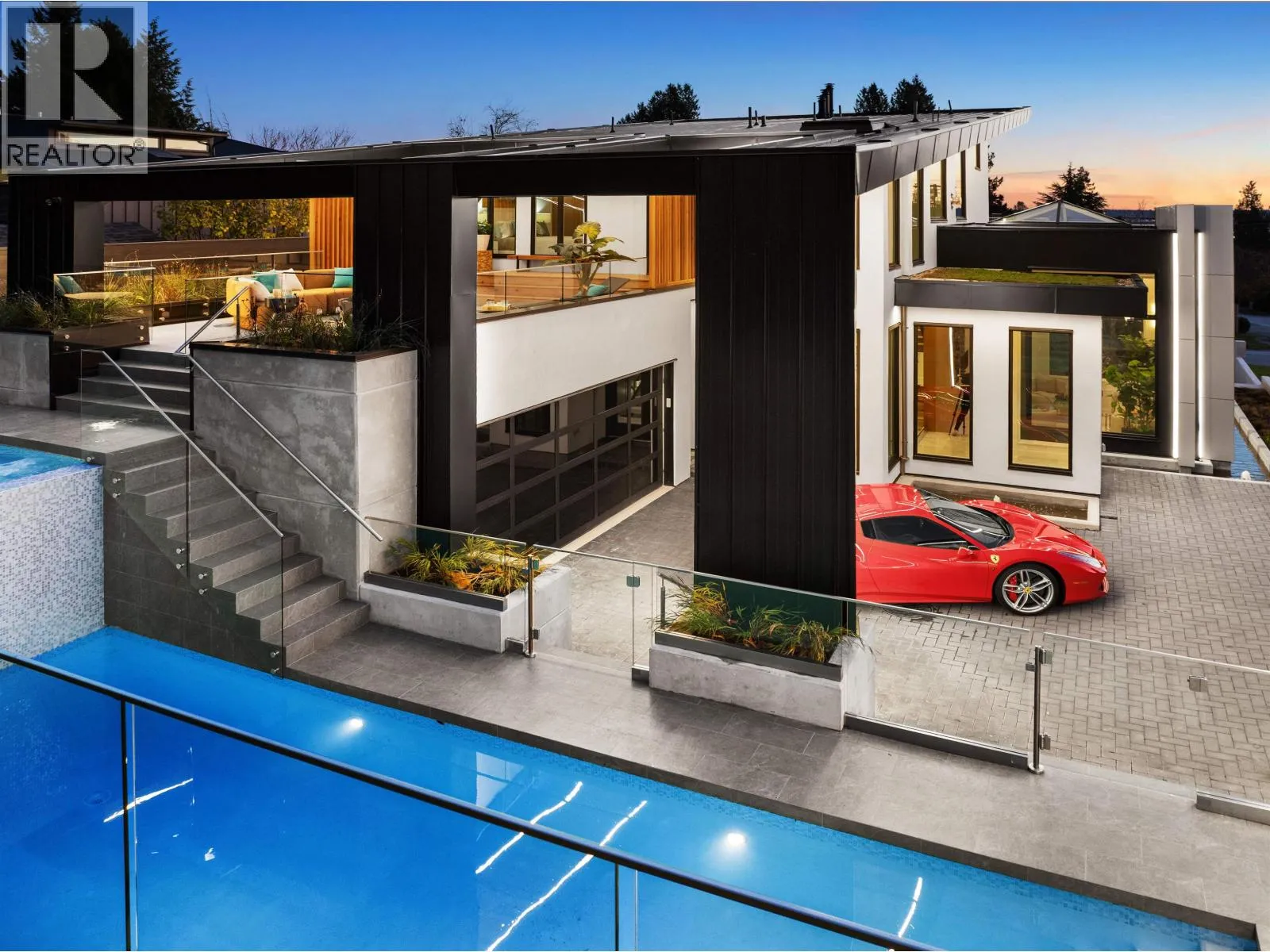 A Prestigious Dundarave Landmark! This luxurious David Christopher-designed residence offers over 5,200 sq. ft. of refined living space on a prominent 8,580 sq. ft. corner lot. Defined by architectural elegance, the home features LED-lit archways, expansive walls of glass. The main level showcases exquisite marble flooring, a grand living room with soaring double-height ceilings, and a gourmet kitchen fully outfitted with MIELE appliances. Upstairs features three ensuite bedrooms with a stunning primary suite. The lower level provides two additional ensuites, a theatre, fitness studio, and rec room opening to a waterfall retreat. Resort-style outdoor living is complete with a two-tier hot tub, swimming pool, and expansive sundecks. Additional highlights include an elevator, A/C, double laundry, motorized shades, and more. (id:27476)