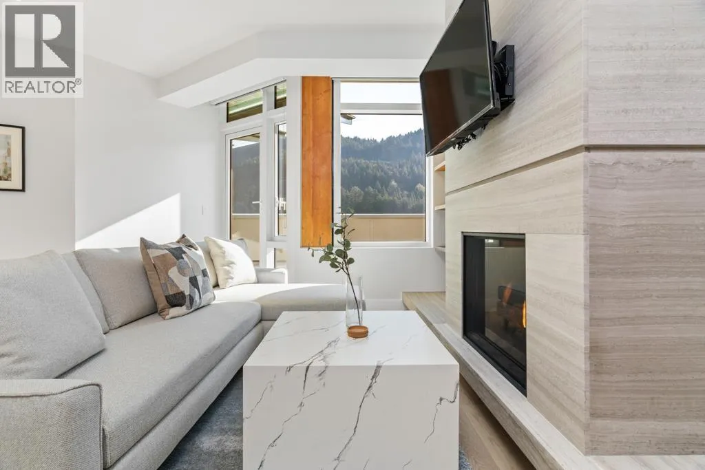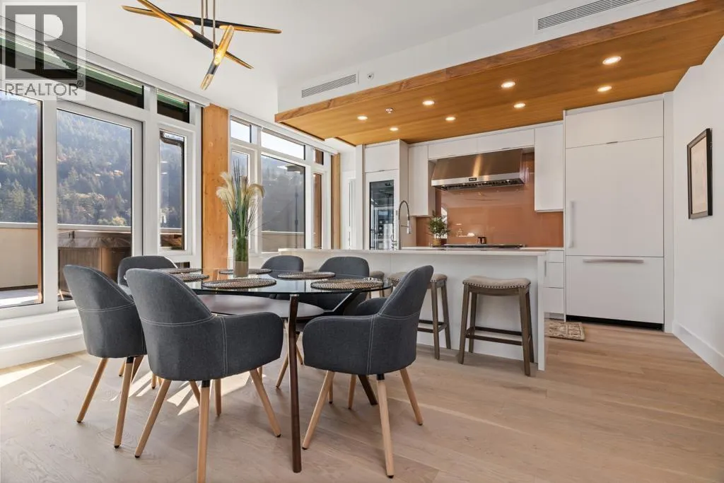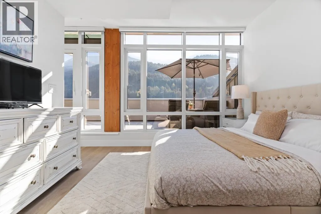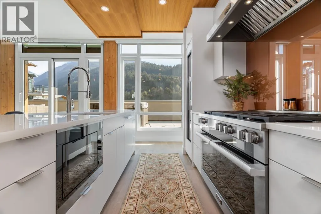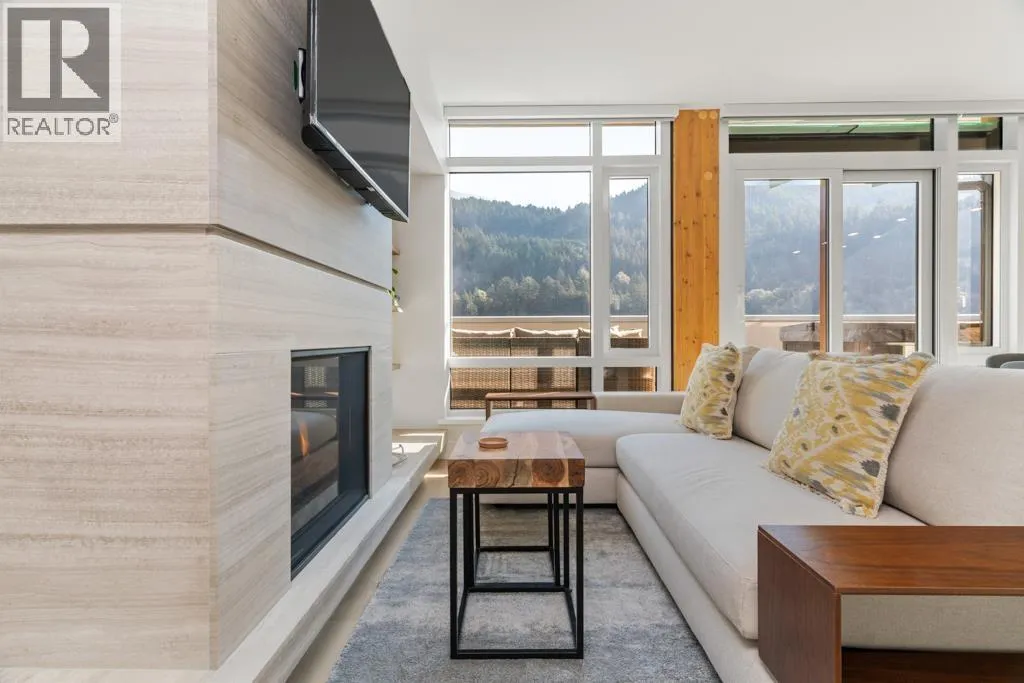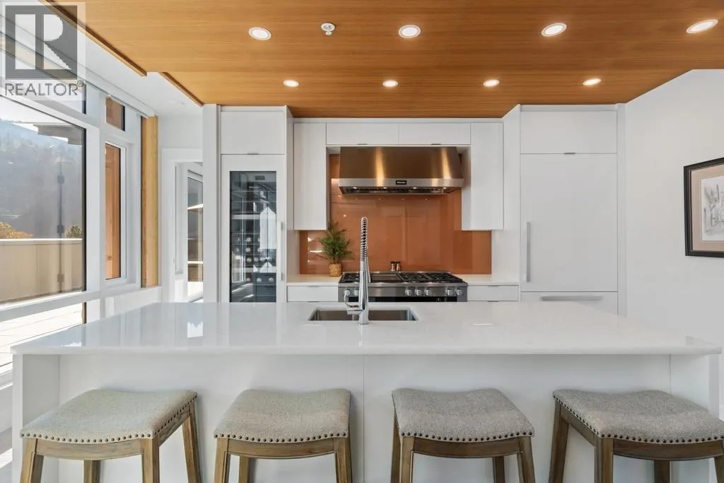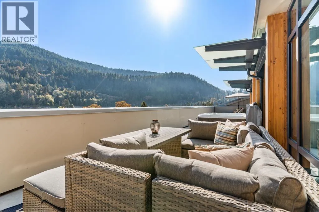 SPECTACULAR, FURNISHED 4-BEDROOM (plus office), 4-BATHROOM DELUXE SUB-PENTHOUSE at the exclusive Sanctuary! This 3,000-square-foot, single-level suite features over-height ceilings and is nestled into the mountainside with breathtaking views over the oceanside of Horseshoe Bay, Sewell's Marina, and BC Ferries. Enjoy the scenery from a massive furnished deck, complete with a hot tub and BBQ. The kitchen boasts high-end Miele appliances, including a dual-fuel range with speed oven, large fridge/freezer, wine fridge, built-in microwave, dishwasher, and a 9-foot kitchen island with stunning glass counters and comfortable seating. The layout includes two primary bedrooms with ensuites, three additional bedrooms, and an office. (id:27476)