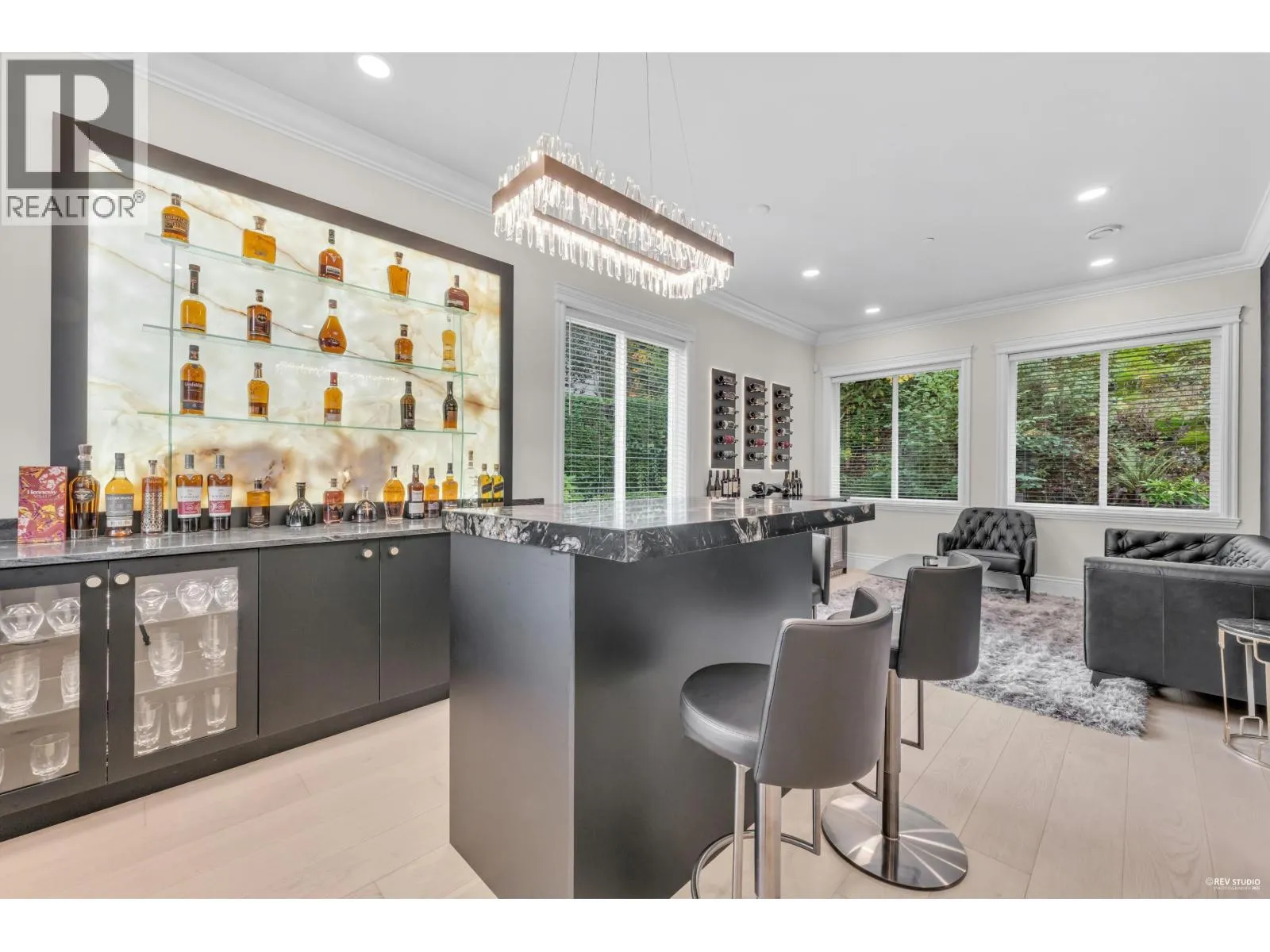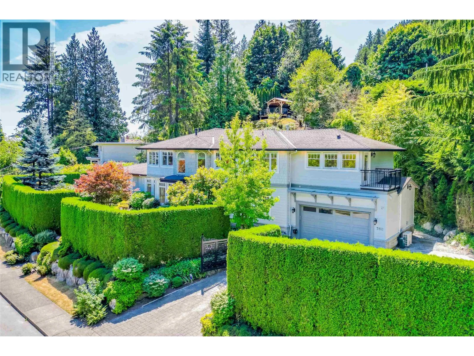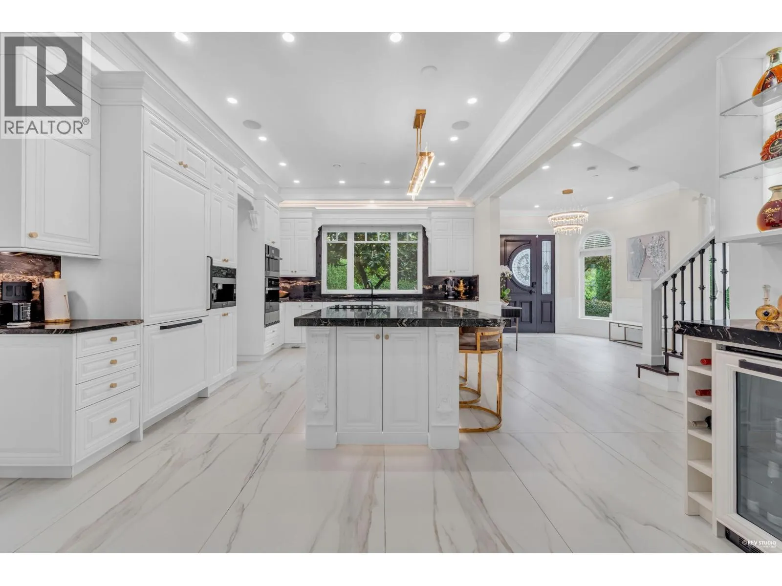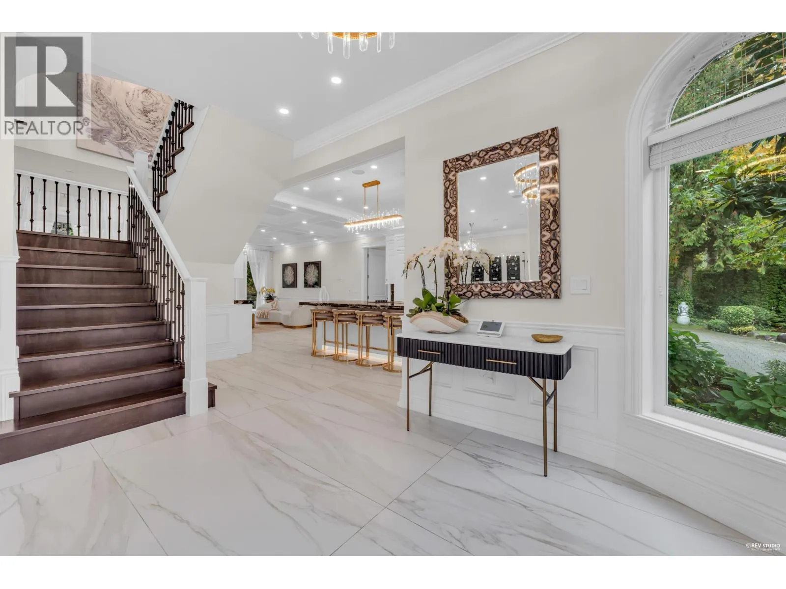Experience refined luxury and modern elegance in this beautifully crafted residence. The main level features Italian-imported marble flooring. The open-concept kitchen showcases a striking central island, Miele and Gaggenau appliances, complemented by a fully equipped wok kitchen for added convenience. Upstairs offers four spacious bedrooms, including a lavish primary suite with a spa-inspired ensuite, a walk-in closet with clothing sterilizer, and direct access to a heated sunroom balcony. Additional highlights include custom LED lighting system, waterfall landscaping, and a mountain-view gazebo, four fireplaces, A/C, radiant heating, EV charging etc. The entertainment area on the main floor features a private entrance, providing excellent suite potential for rental or guests. This home perfectly blends modern luxury with thoughtful functionality. Conveniently located near top-ranked public schools, Park Royal shopping centre, and all essential amenities. (id:27476)