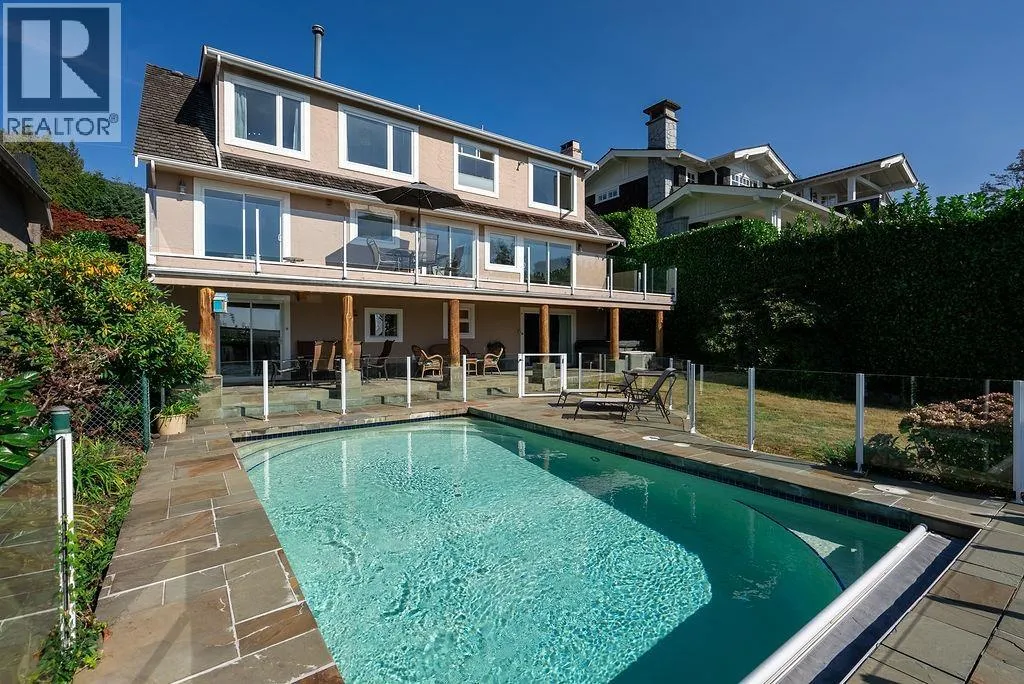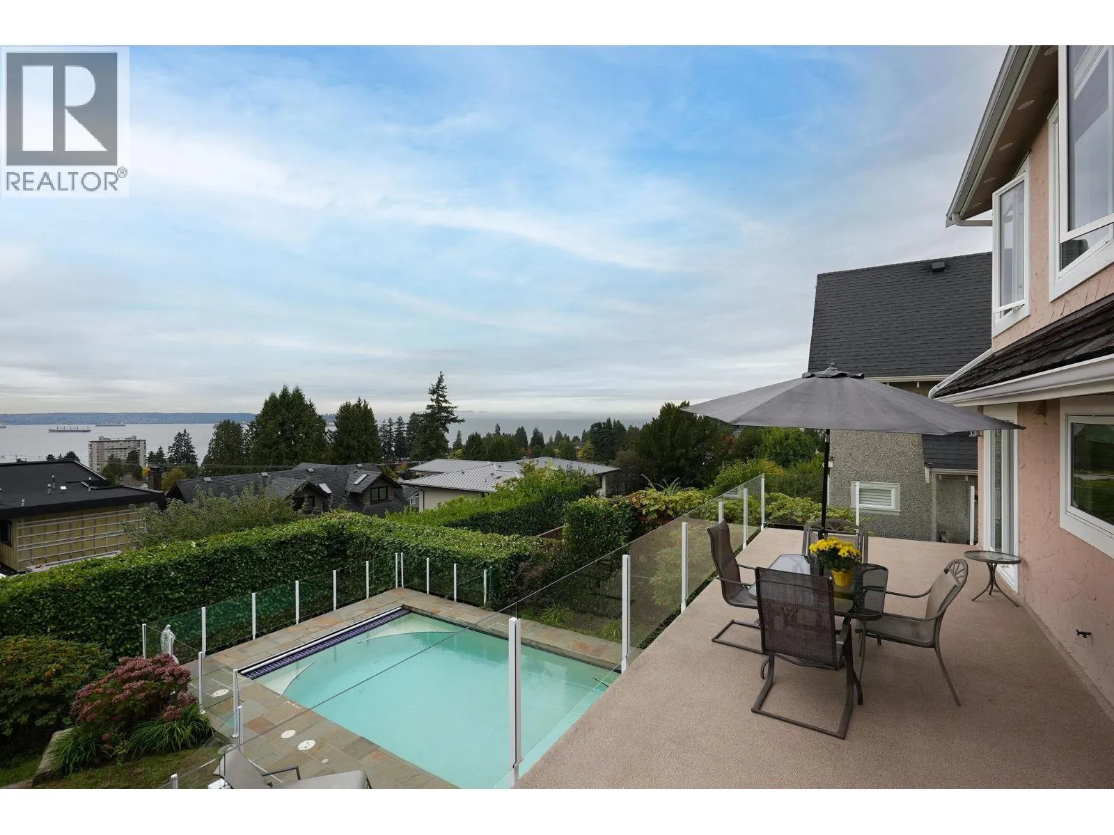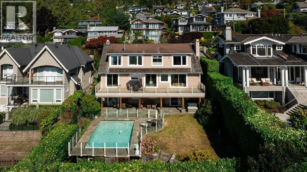 Live every day like a vacation in this sun-drenched Dundarave 5 bdrm 3.5 bth home with panoramic ocean views from every level. Over 4,000 sq. ft. of beautifully updated living space features a gourmet island kitchen, elegant entertaining areas, & a 48-ft balcony for unforgettable sunsets. The luxurious primary suite boasts a walk-in closet, solarium, & spa-like ensuite. The walk-out lower level is an entertainer´s dream with rec room, covered deck, hot tub, & a resort-style self-cleaning Trasolini heated pool w/motorized cover. With 1,600+ sq. ft. of outdoor living, 2-car garage, and walkability to the Seawall, Village, beaches, and top schools-this is West Coast living at its finest. 60' Frontage. OPEN HOUSE SUNDAY Feb 15 2PM-4PM (id:27476)