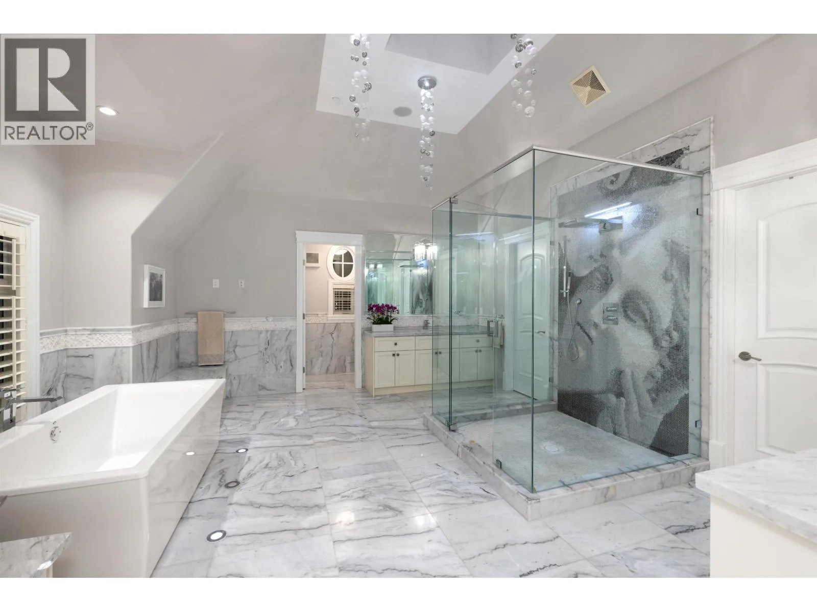 Magnificent European Chateau in Prestigious Altamont. A Marque Thompson-designed gated estate, this 6-bedroom, 8-bath residence blends European elegance with modern sophistication. A sweeping driveway, grand entry & handcrafted marble staircase set an unforgettable tone. The chef´s kitchen, with Sub-Zero, Wolf & Miele appliances plus a WOK kitchen, flows into formal rooms & bright entertaining spaces. Walls of glass open to a resort-style backyard with swimming pool, Jacuzzi, firepit & pavilion, all framed by lush landscaped gardens. Upstairs, the primary suite is a spa retreat, with marble bath, rain shower, freestanding tub & boutique-style walk-in. Three additional ensuites provide comfort for family & guests. The lower level features a theatre, wine cellar, gym, sauna, steam & nanny quarters. Smart automation, radiant heating, Murano fixtures & biometric security complete this residence. In one of West Vancouver´s most prestigious enclaves, it offers unmatched beauty, privacy & sophistication. (id:27476)