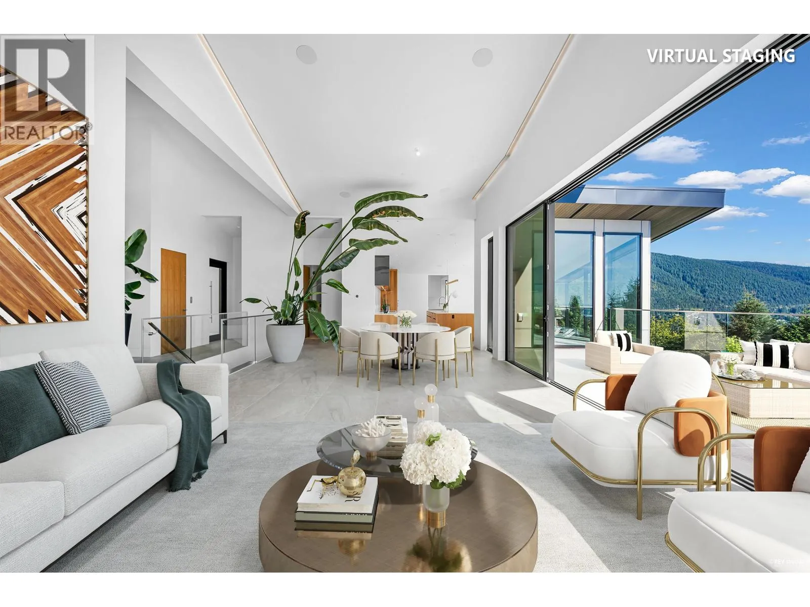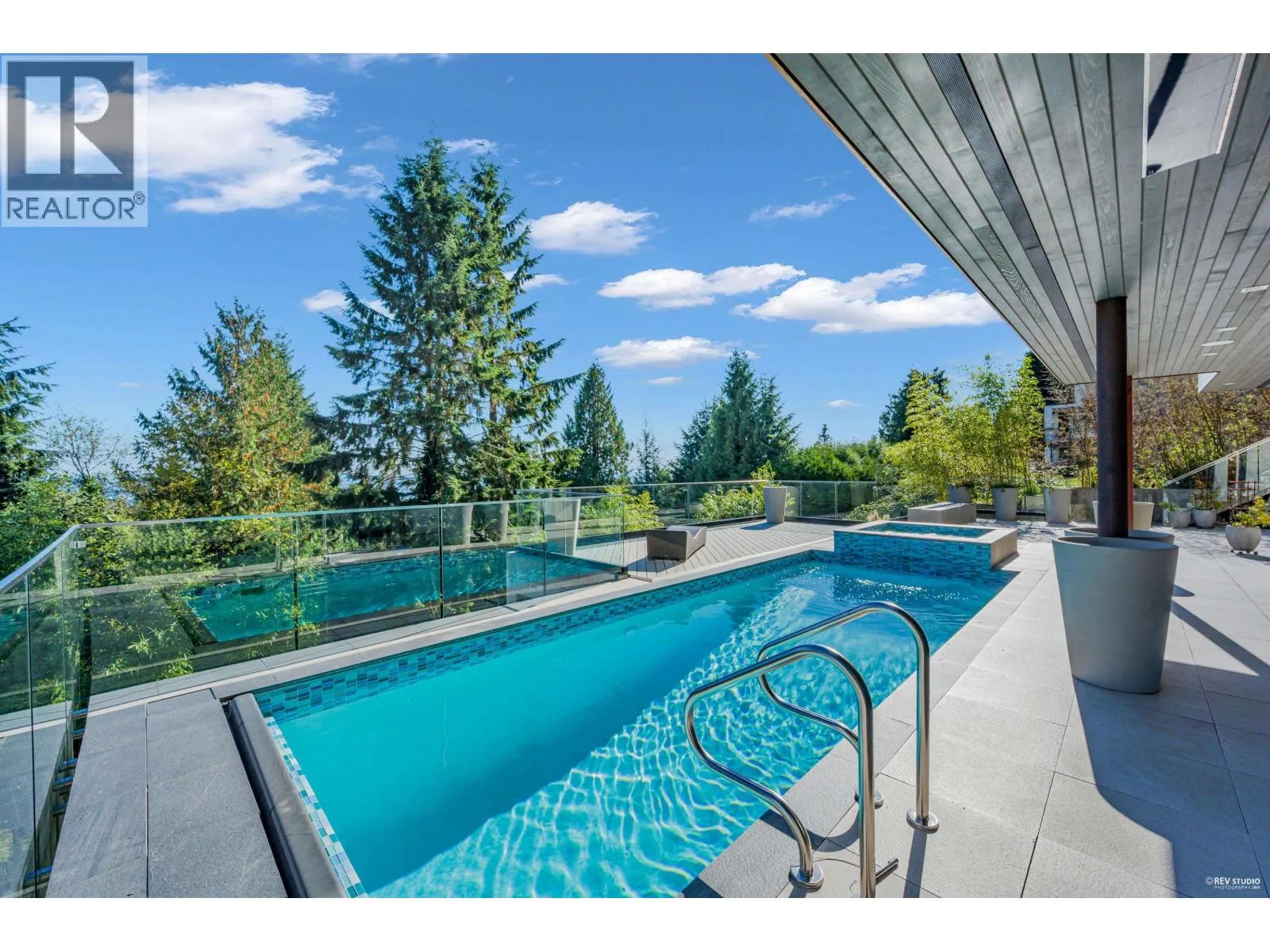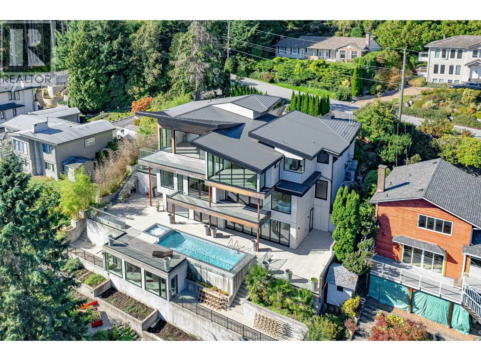 This modern masterpiece showcases clean architectural lines, expansive glass, and natural materials, offering panoramic ocean and city views. The main floor features bright open living spaces with high ceilings, floor-to-ceiling windows, and seamless flow to a large terrace. Gourmet and wok kitchens are equipped with high-end appliances and custom cabinetry. A rare dual primary suite layout provides ideal flexibility for families or multigenerational living, each with spa-inspired ensuites, walk-in closets, and private balconies. The lower level includes a spacious recreation room, home theatre, and direct access to the outdoor oasis with pool, hot tub, generous patio and the pool house. Thoughtfully designed for refined luxury and effortless modern living. (id:27476)