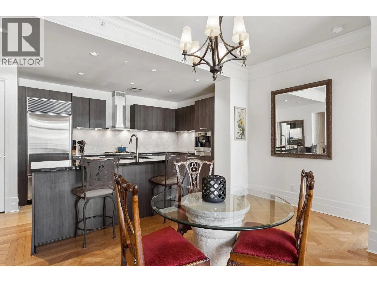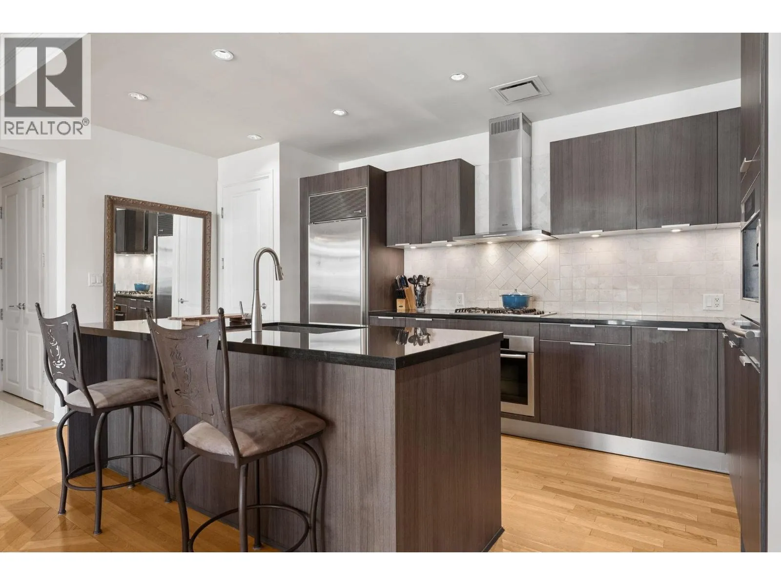 Timeless beauty at this Waters Edge 2 bed | 2 bath condo located in the amenities building where you can enjoy the gym, a lovely library and sauna and steam rooms without stepping outdoors. Fantastic open floor plan with an entertainer´s kitchen, including a built-in Miele coffee maker, 10´ ceilings throughout, herringbone hardwood floors in the living room, electric fireplace, and wonderful primary bedroom with a bright spa-like ensuite. Corner west facing suite with loads of windows and a covered balcony for your BBQ. Huge private double garage near building entry that includes a concrete storage room + an additional large storage room that could be a workshop. On-site Concierge, steps to shopping, restaurants and transit. Book your private viewing today. (id:27476)