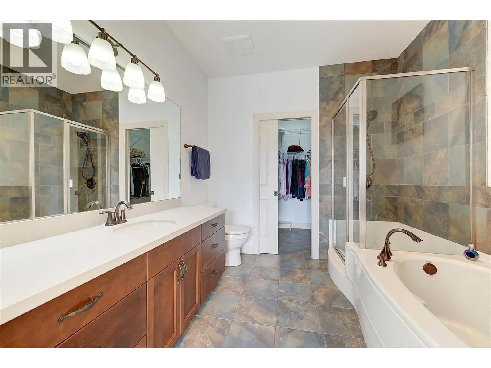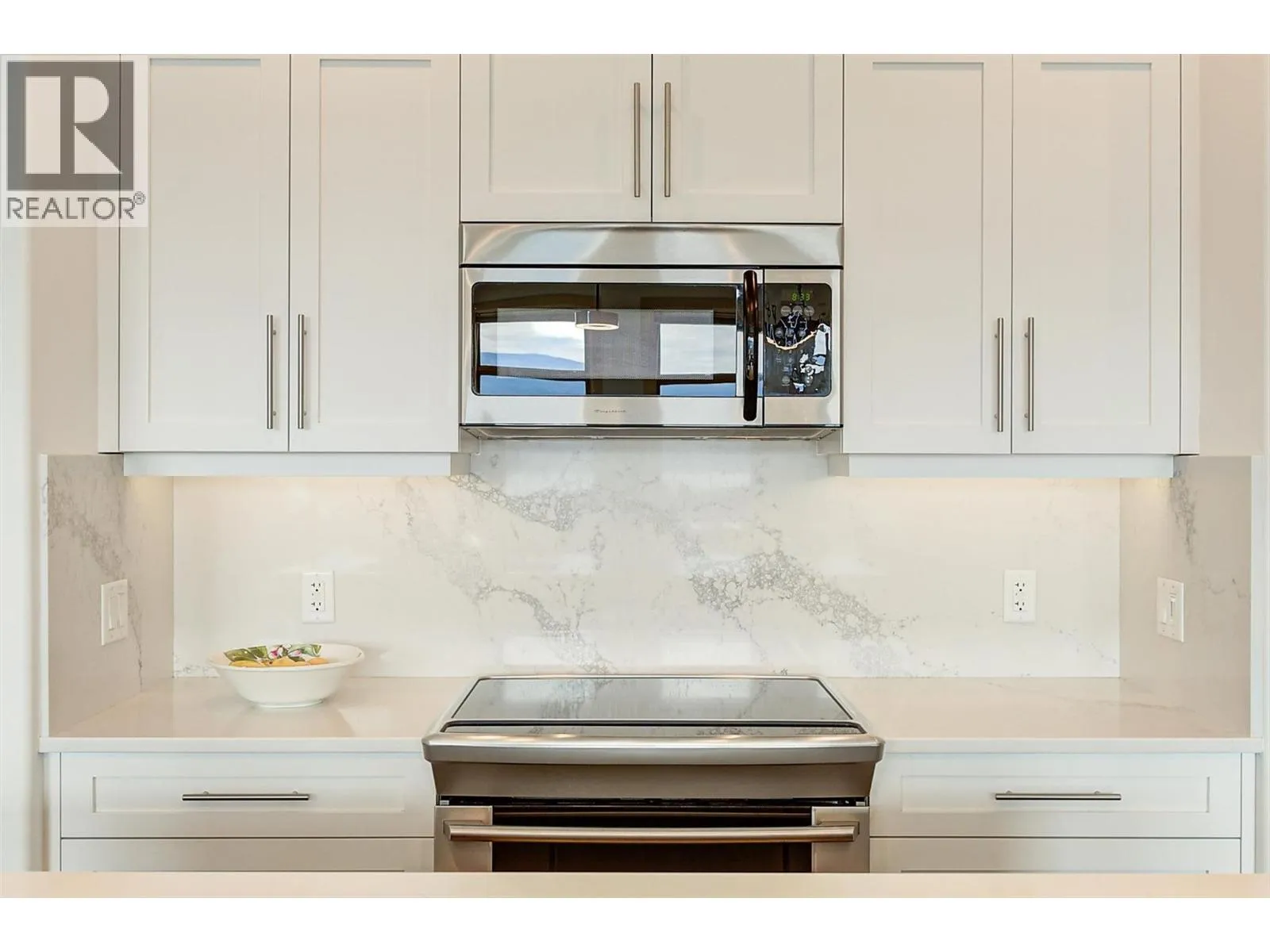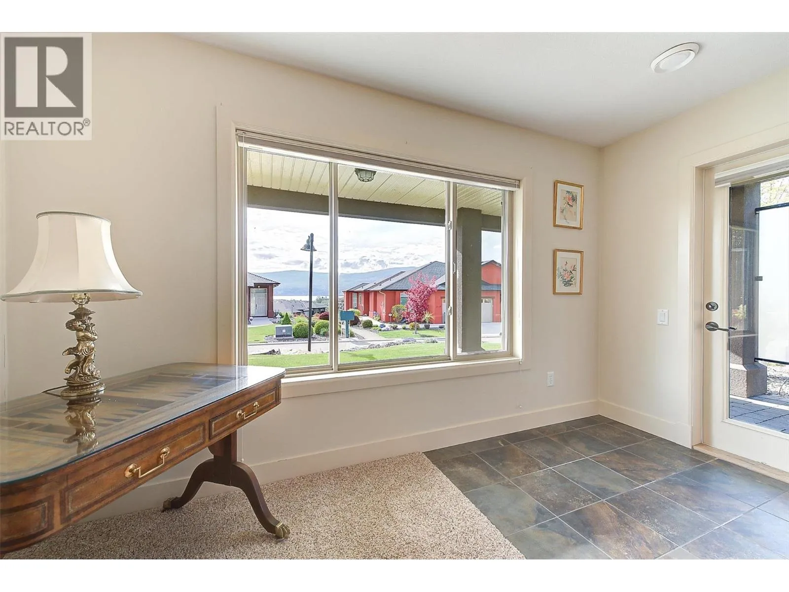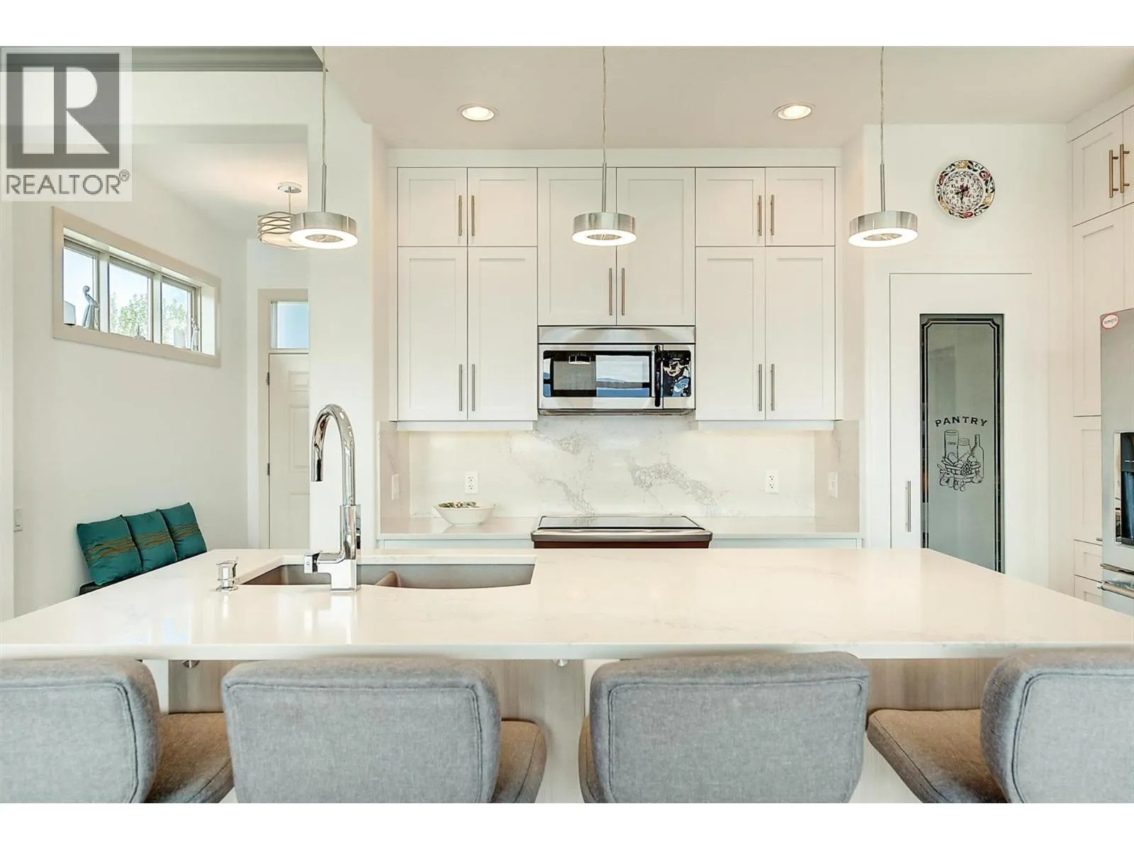 Welcome to this beautifully updated semi-detached townhome in the highly desirable Sonoma Pines community! Step into the stylish, modern custom kitchen featuring white shaker-style soft-close cabinets extended to the ceiling, sleek quartz countertops, stainless steel appliances, a convenient coffee station, a wave-activated Moen kitchen faucet, and updated lighting. The open-concept living room boasts newer laminate flooring, a cozy gas fireplace, and stunning lake views. Adjacent, the dining room includes custom built-in cabinetry and opens onto a spacious deck with topless glass railingsâperfect for soaking in the panoramic lake views. The deck also comes equipped with gas hookups for BBQ. The bright and inviting primary bedroom features lake views, newer carpet, a walk-in closet, and a 4-piece ensuite with Corian counters. A second bedroom, full bathroom, and convenient laundry area complete the main floor layout. Downstairs, you'll find a spacious family room with an electric fireplace, a flex room ideal for a home office or gym, a third bedroom, another full bathroom, a large storage room, and access to a lower covered patio with hot tub hookupâperfect for year-round enjoyment. Additional highlights include a double garage, flat driveway, and low-maintenance living in a fantastic location close to golf, shopping, and Okanagan Lake. Sonoma Pines amenities include a clubhouse with gym, library, billiard room, and sizeable social room with a full kitchen available to rent. Secure RV parking is also available on-site. This is the perfect blend of comfort, style, and breathtaking viewsâdonât miss it. NO PTT, PREPAID LEASE. (id:27476)