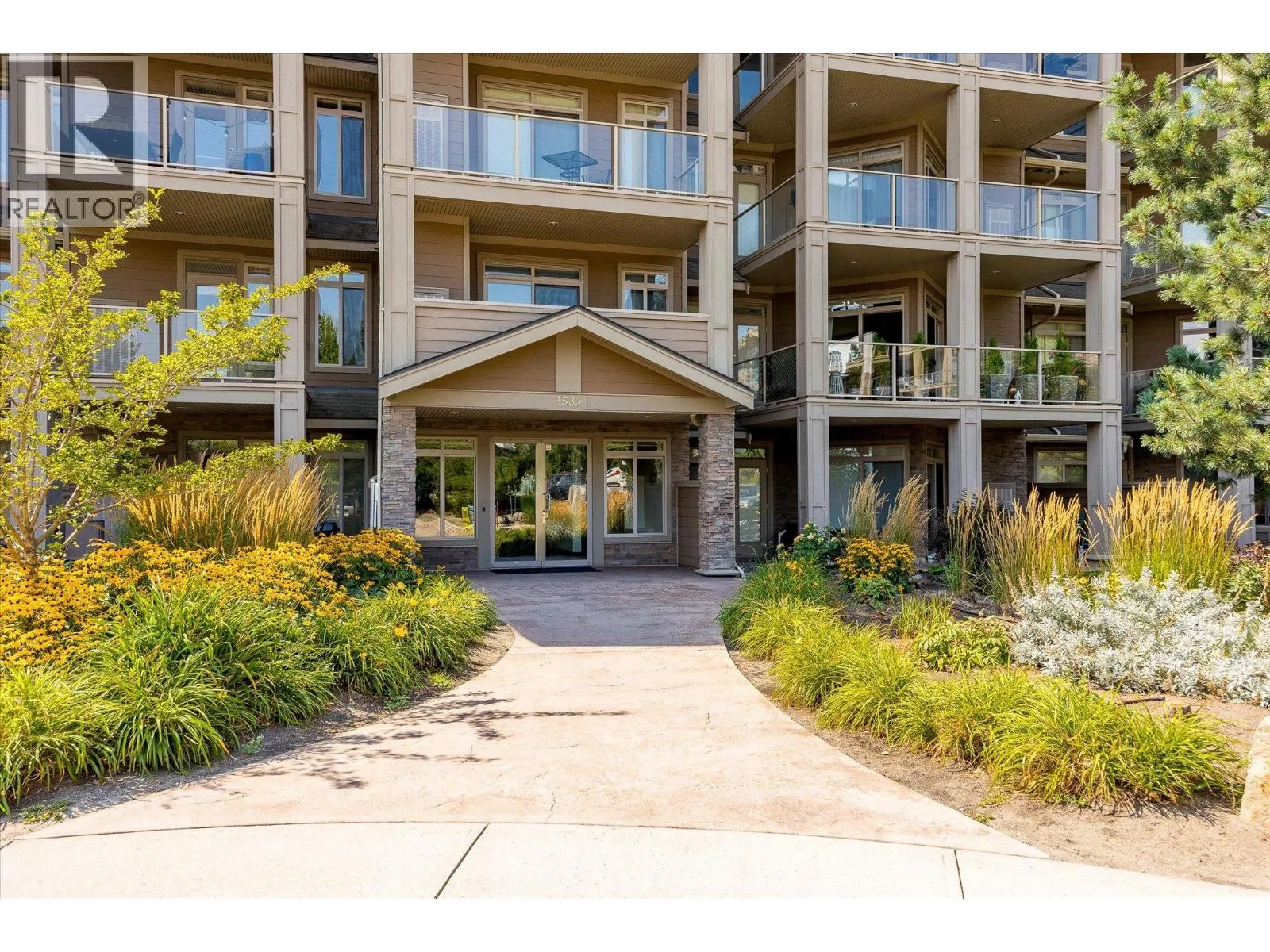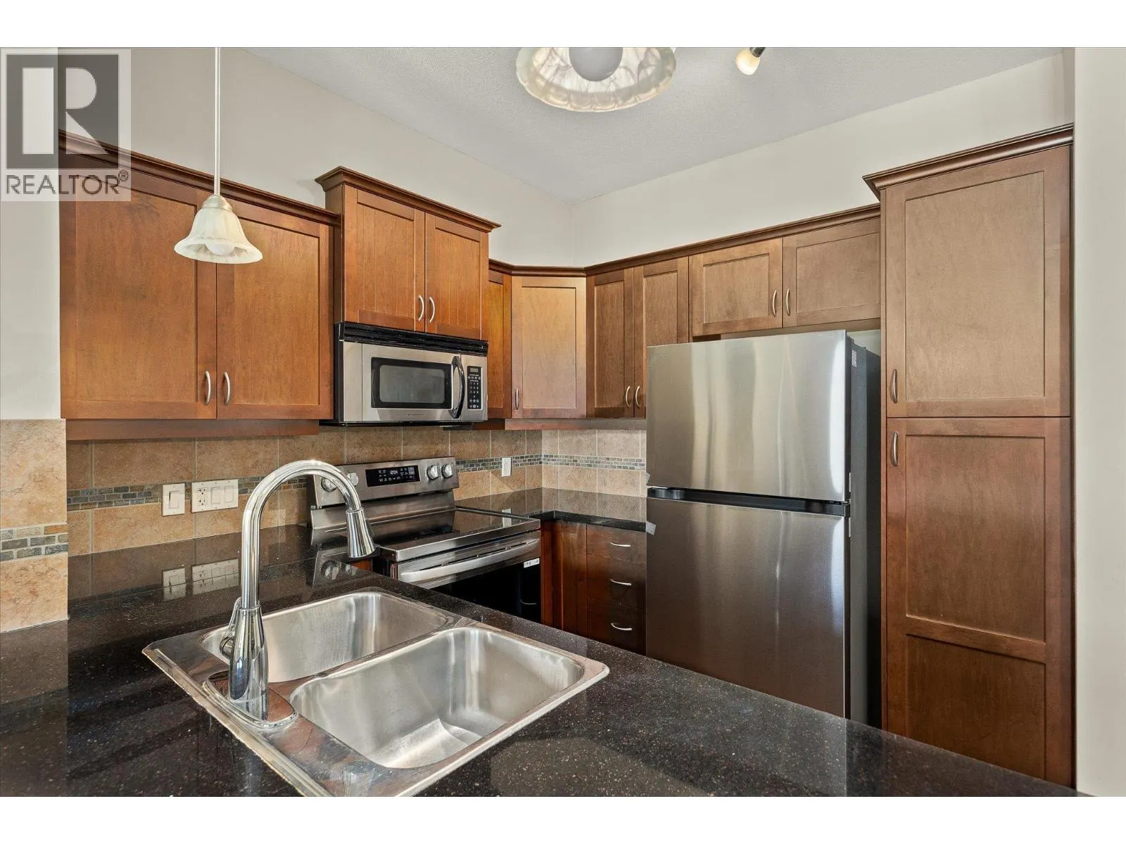 TOP FLOOR LIVING: Indulge in the epitome of West Kelowna living in this stunning 2 bedroom, 2 bath top floor condo at the prestigious Aria. The kitchen features granite counter tops, sitting bar and stainless-steel appliances with a newer stove and fridge. The living space offers a split bedroom floor plan with high ceilings and lots of natural light. There is access to the oversize deck from the living room and primary bedroom. Immerse yourself in breathtaking panoramas of the Twin Eagles Golf Course and Mission Hill Winery from your private balcony. Enjoy the ultimate in comfort and convenience with easy access to world-class golf, shopping, dining, and outdoor recreation. Don't miss this opportunity to experience the Okanagan lifestyle! Aria is a pet and rental-friendly building, with no speculation tax or PTT and the LEASE IS PREPAID. The unit comes with one parking spot and one secured storage locker, low strata fees. PLEASE NOTE: Photos were taken prior to the current tenant moving in (id:27476)