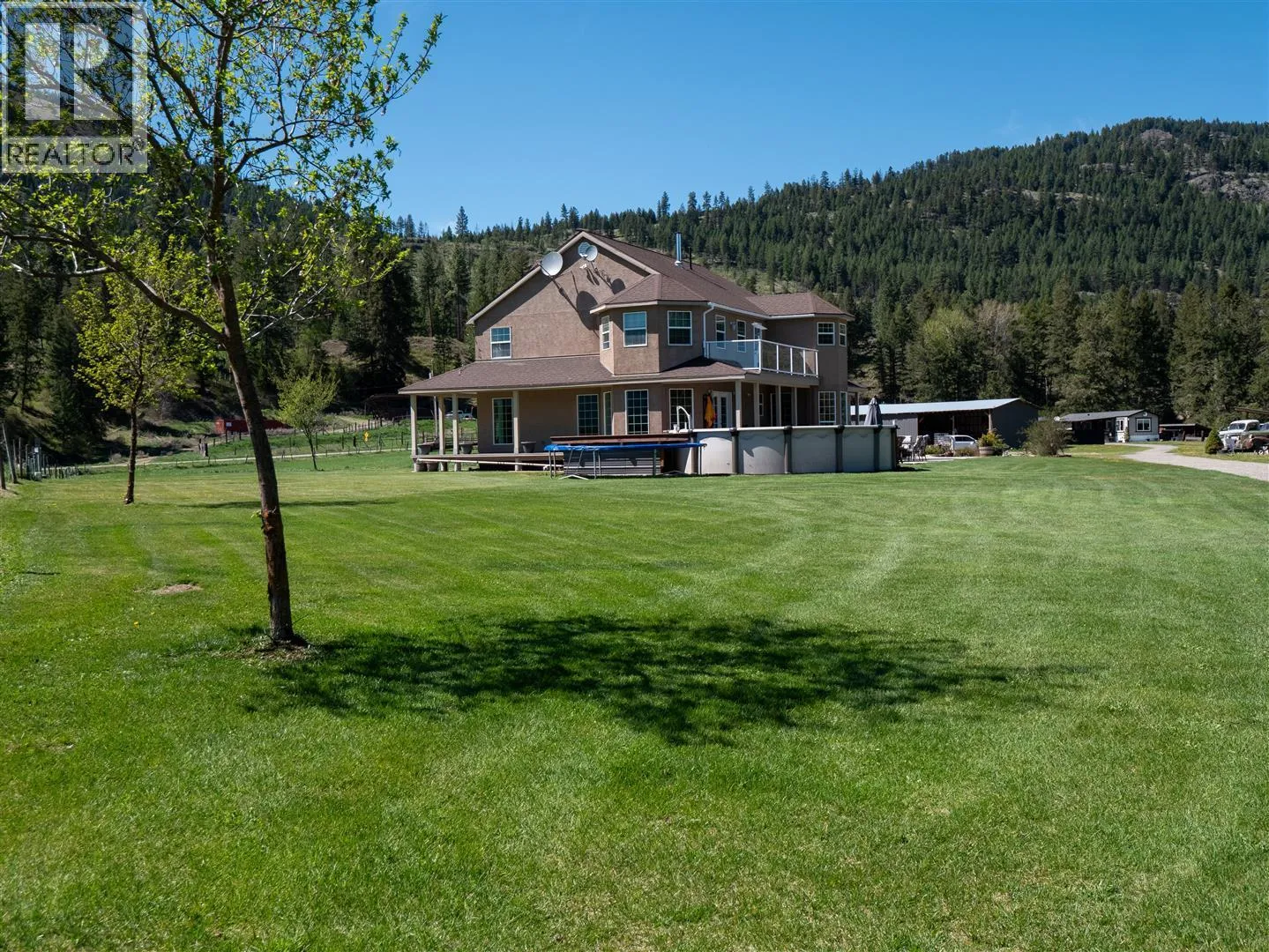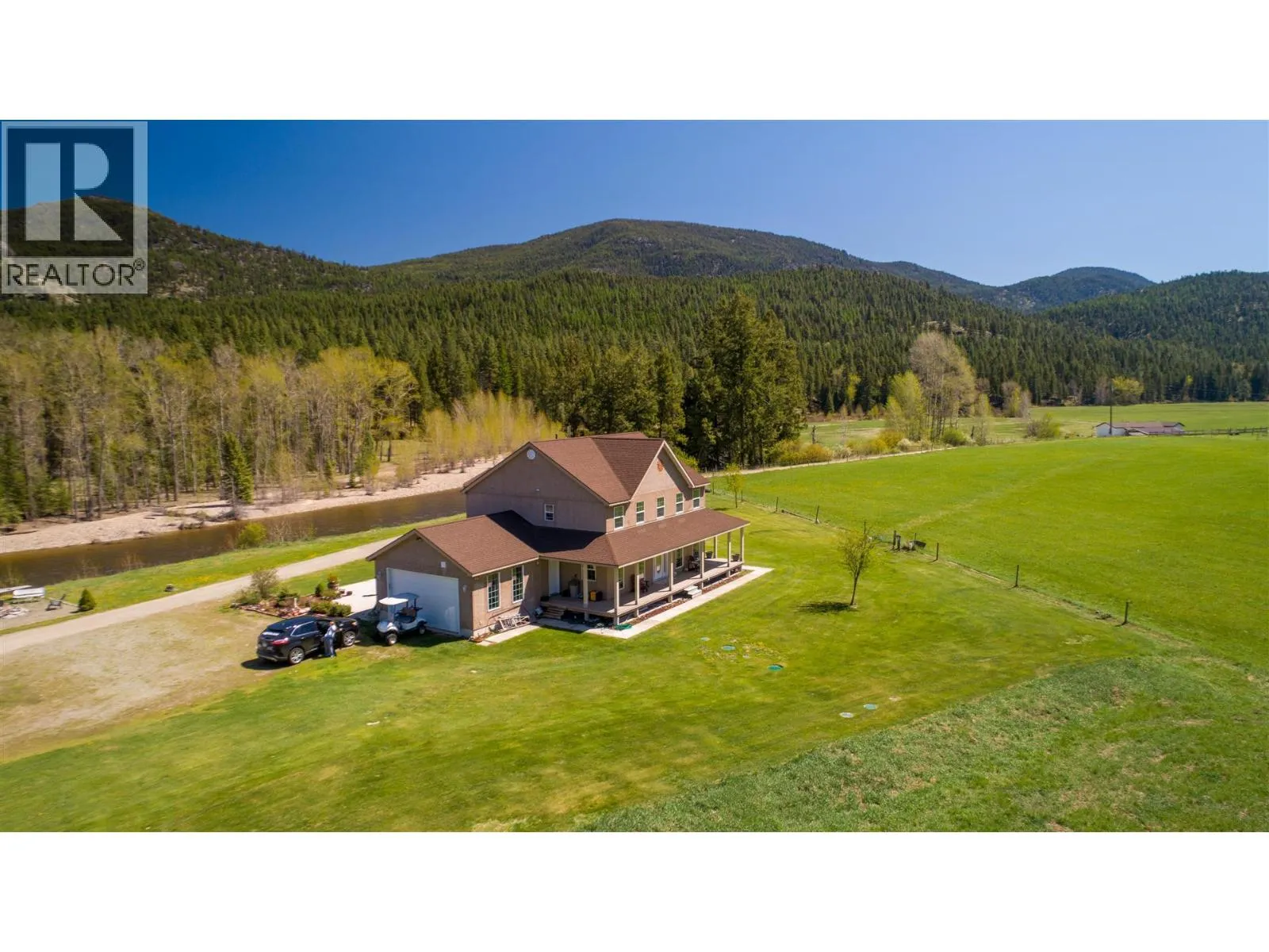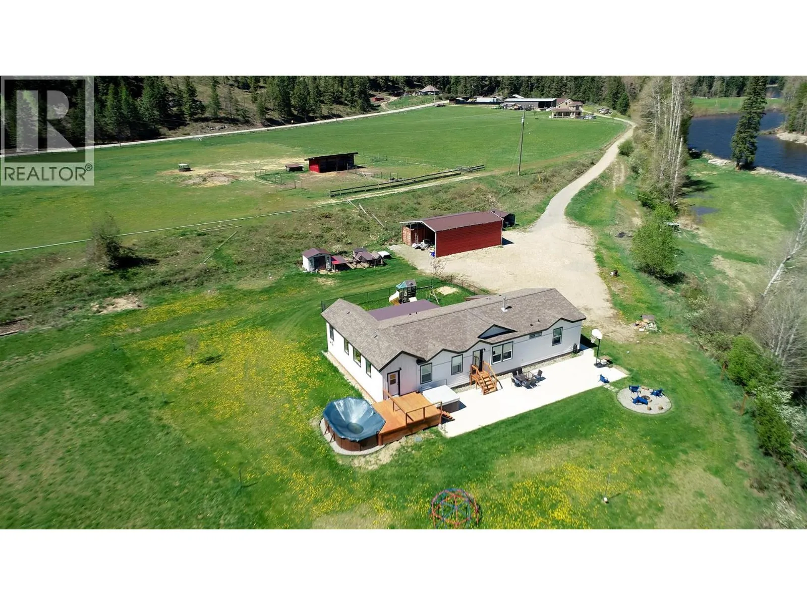 This exceptional property offers two homes, a large garage/workshop, multiple outbuildings, expansive pastures, hay-producing fields, and over a mile of breathtaking Kettle River frontage. Ideal for a multi-family homestead, equestrian retreat, or farming operation, this ALR property has been organic for over 30 years, with 85 acres currently in hay production. The irrigation system includes gravity-fed water and high-volume wells, distributed via wheel and hand lines. The custom 2,600 ft2 primary home features five bedrooms, three bathrooms, an open-concept layout with stunning views, a private balcony, and a basement roughed in for a suite. The second 2,000 ft2 modular home, renovated in 2023, includes four bedrooms, two bathrooms, a fenced yard, a screened deck, and an above-ground pool, generating strong Afrbnb rental income. Outdoor amenities abound, from decks, patios, and hot tubs to a deep swimming hole and prime fishing spots. Additional structures include a horse shelter, hay storage, a large open-air workshop, and chicken coops. The fully fenced agricultural land is divided into irrigated hay fields and pastures. (id:27476)