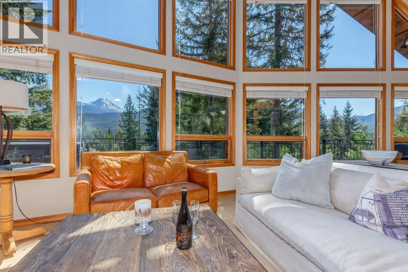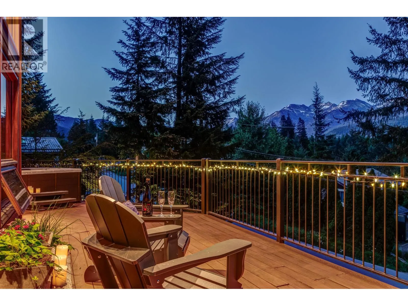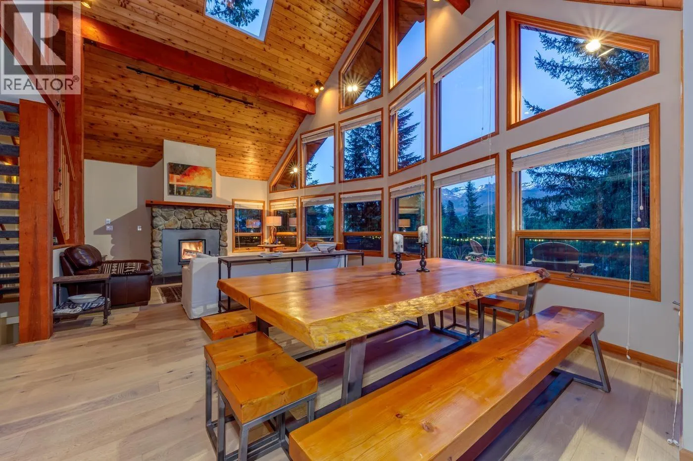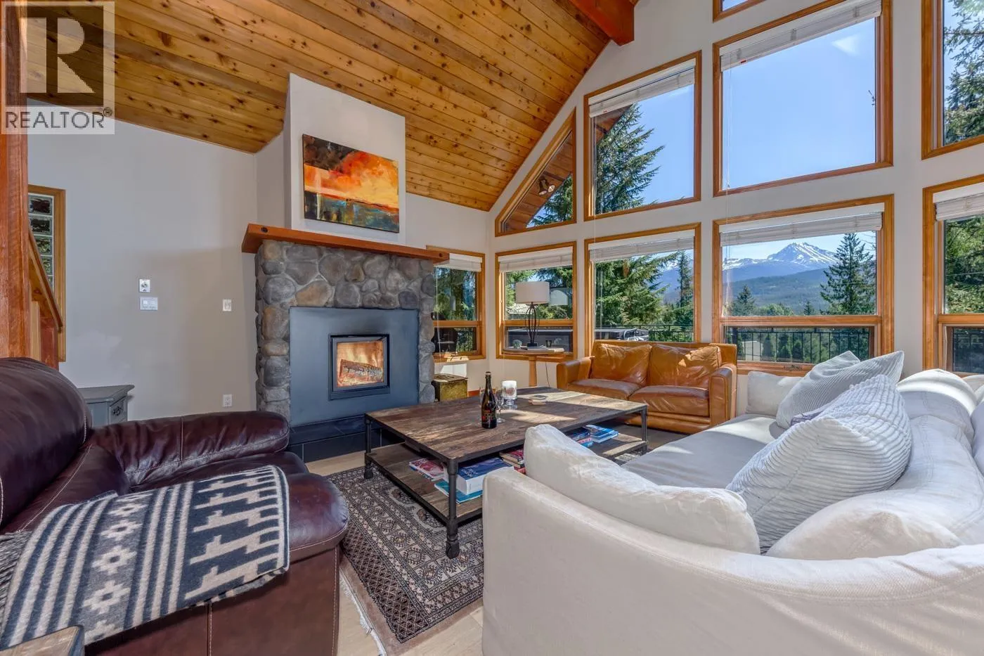Wake up daily to magnificent mountain views in this stunning, bright, open post & beam home. Soaring cathedral ceilings & floor-to-ceiling windows flood the space with natural light. The open concept main floor is an entertainer's delight, with a wood-burning fireplace, wood floors, & skylights. Step onto your private deck, where a hot tub awaits with sunrise and alpenglow views of Wedge Mtn, Armchair Glacier, & Blackcomb Mtn. The fully updated kitchen is a chef's dream, featuring a wall oven, cooktop, & granite countertops. Upstairs, the primary bedroom has a gas fireplace, private deck, & eagle totem pole to the vaulted ceiling. Luxurious primary ensuite pampers with a double vanity, deep soaker tub, heated floors & a separate shower. 2-bed suite for income or personal use. (id:27476)