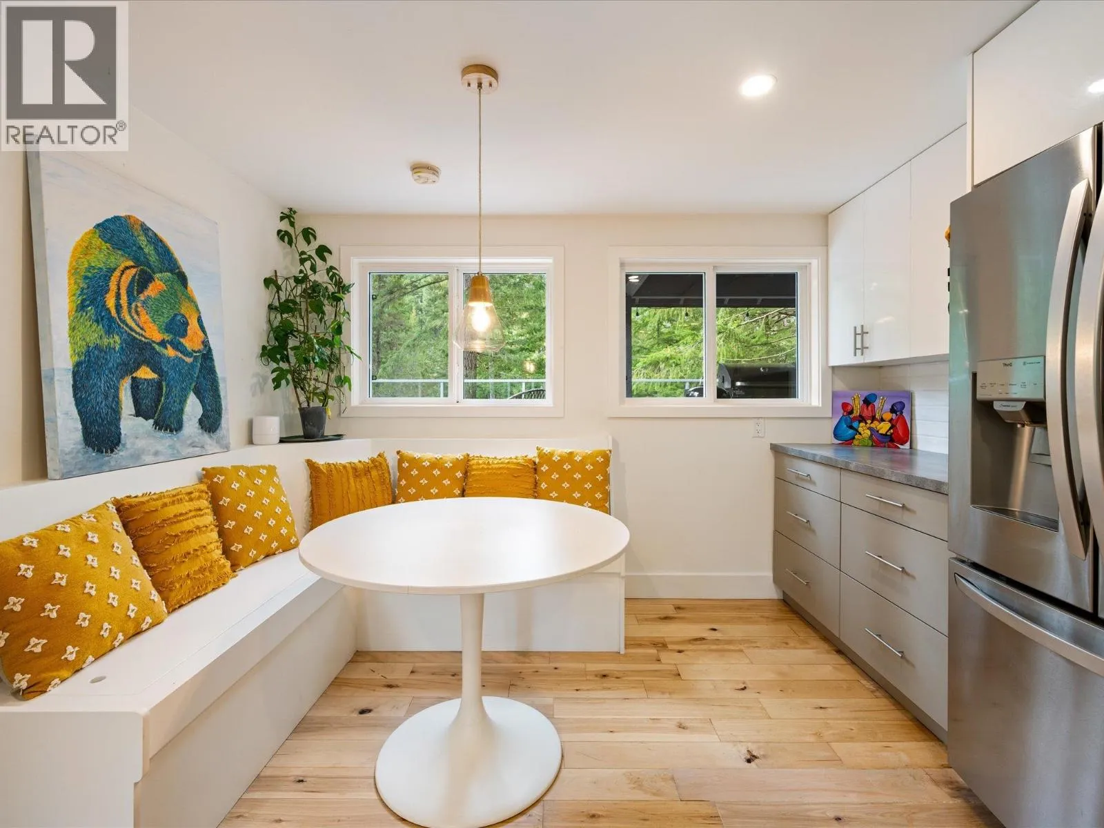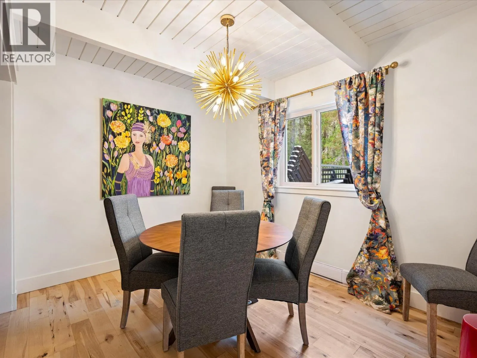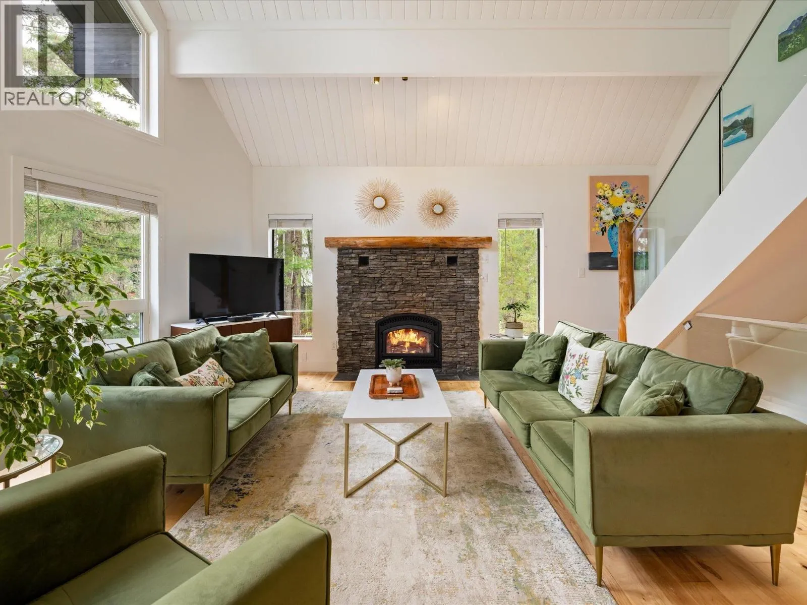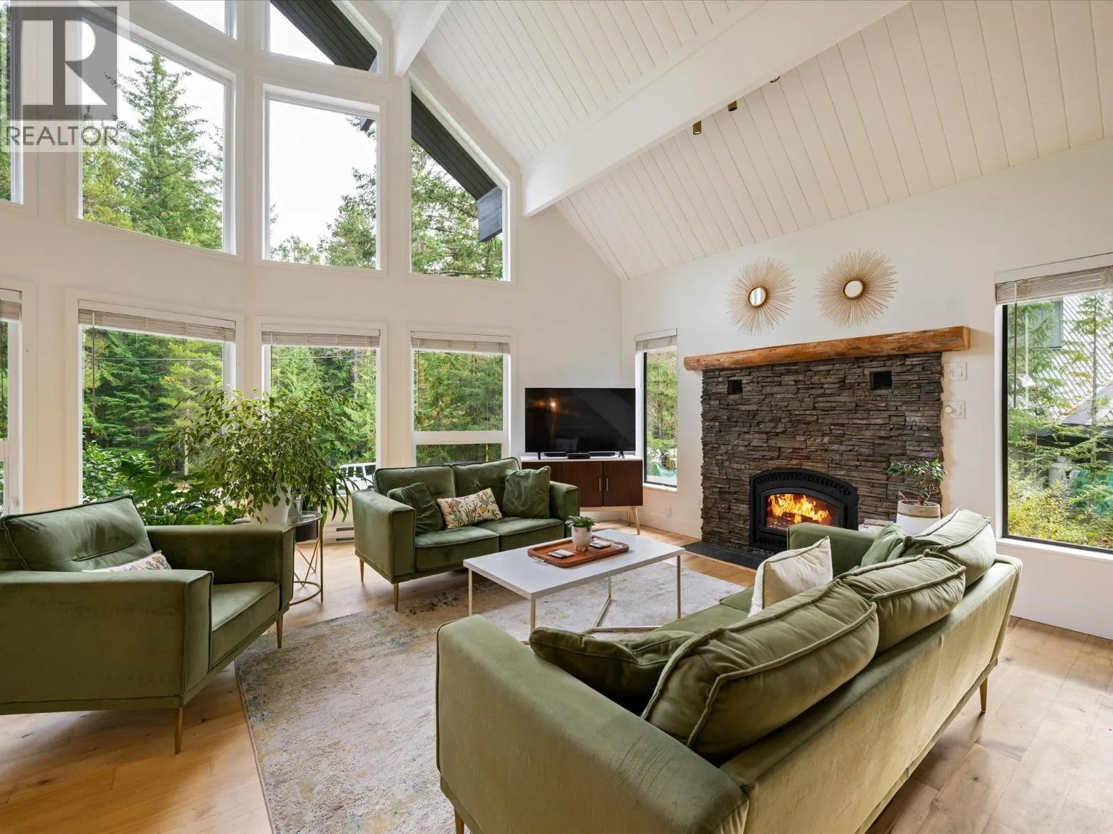 Private Black Tusk Village home blending contemporary comfort with a private treed setting, mountain views, and backing onto Pinecrest Lake with dock access. Vaulted ceilings and expansive windows fill the main level with light, featuring a wood-burning fireplace and a flexible bedroom/den/office space. Upstairs offers two bedrooms; the lower-level master retreat boasts a spa-inspired ensuite and heated floors. Recent upgrades include remodeled bathrooms, updated electrical with EV charging, LED lighting, and a deck with glass railings. Enjoy outdoor living with a covered deck, perennial garden, paved driveway with RV parking, and a two-room studio. Community amenities include private lake access, tennis courts, and trails-your turnkey Whistler escape. (id:27476)