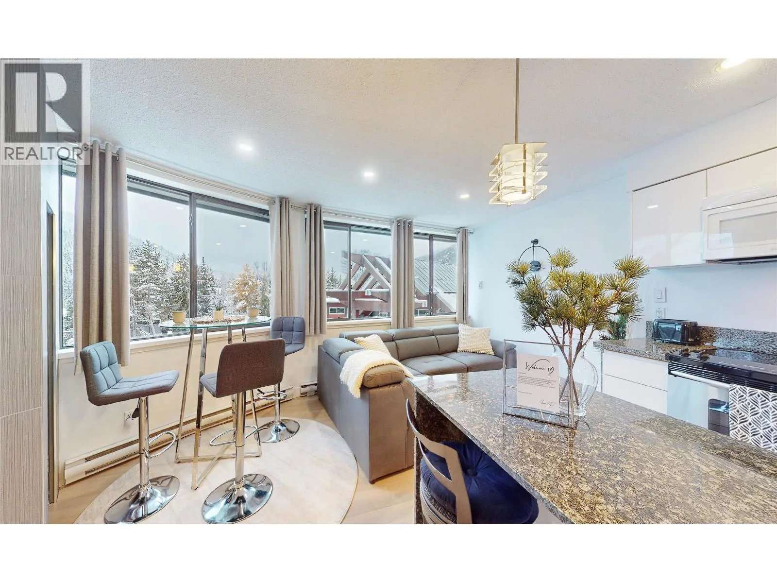This beautifully renovated, furnished & equipped, super spacious 850 square ft one bedroom apartment in Windwhistle offers a prime location in Whistler Village, just steps away from ski lifts, restaurants, shops. Its wraparound windows not only flood the interior with natural light but also provide picturesque views of the mountains. The modern kitchen features stainless steel appliances and sleek granite countertops, adding a touch of luxury to everyday living. Furthermore, this property presents a great investment opportunity, boasting Phase 1 nightly rental zoning. This means it has the potential to generate substantial rental income while still allowing for unlimited owner usage. Very well run building, renovated common areas and new roof approved & paid in full. (id:27476)