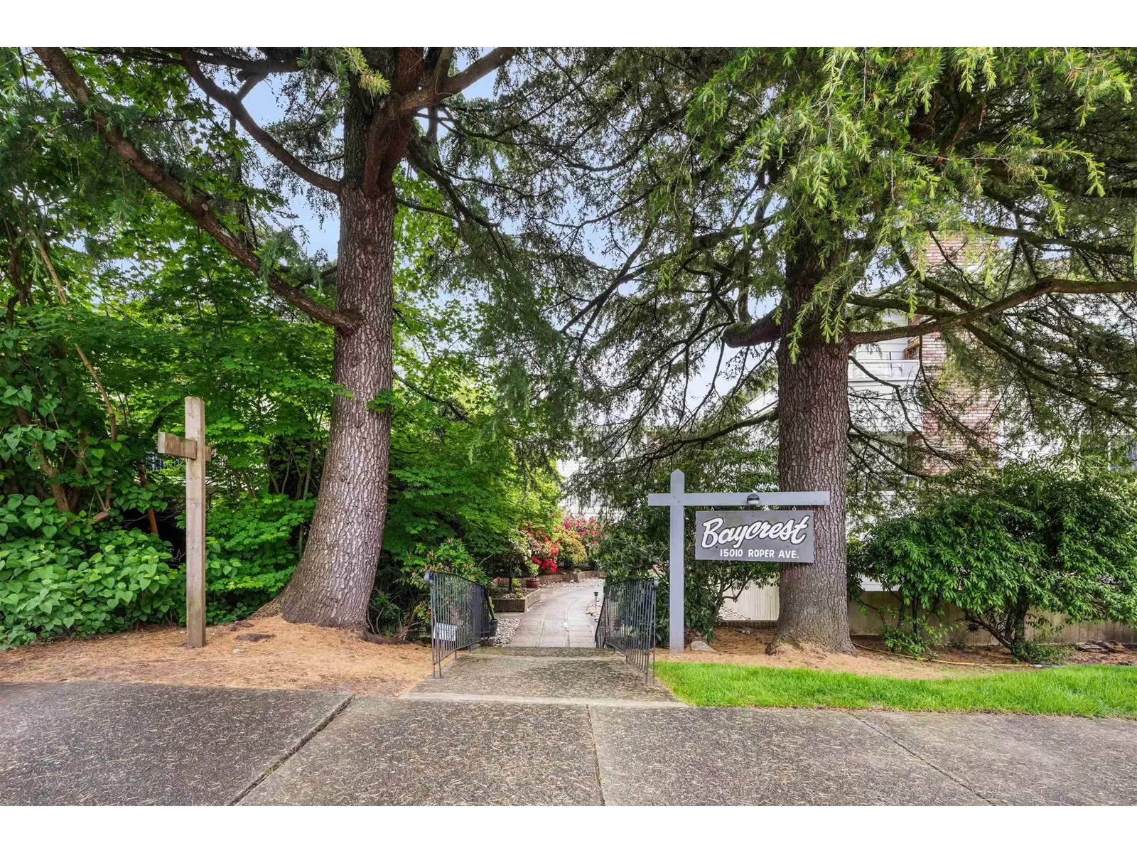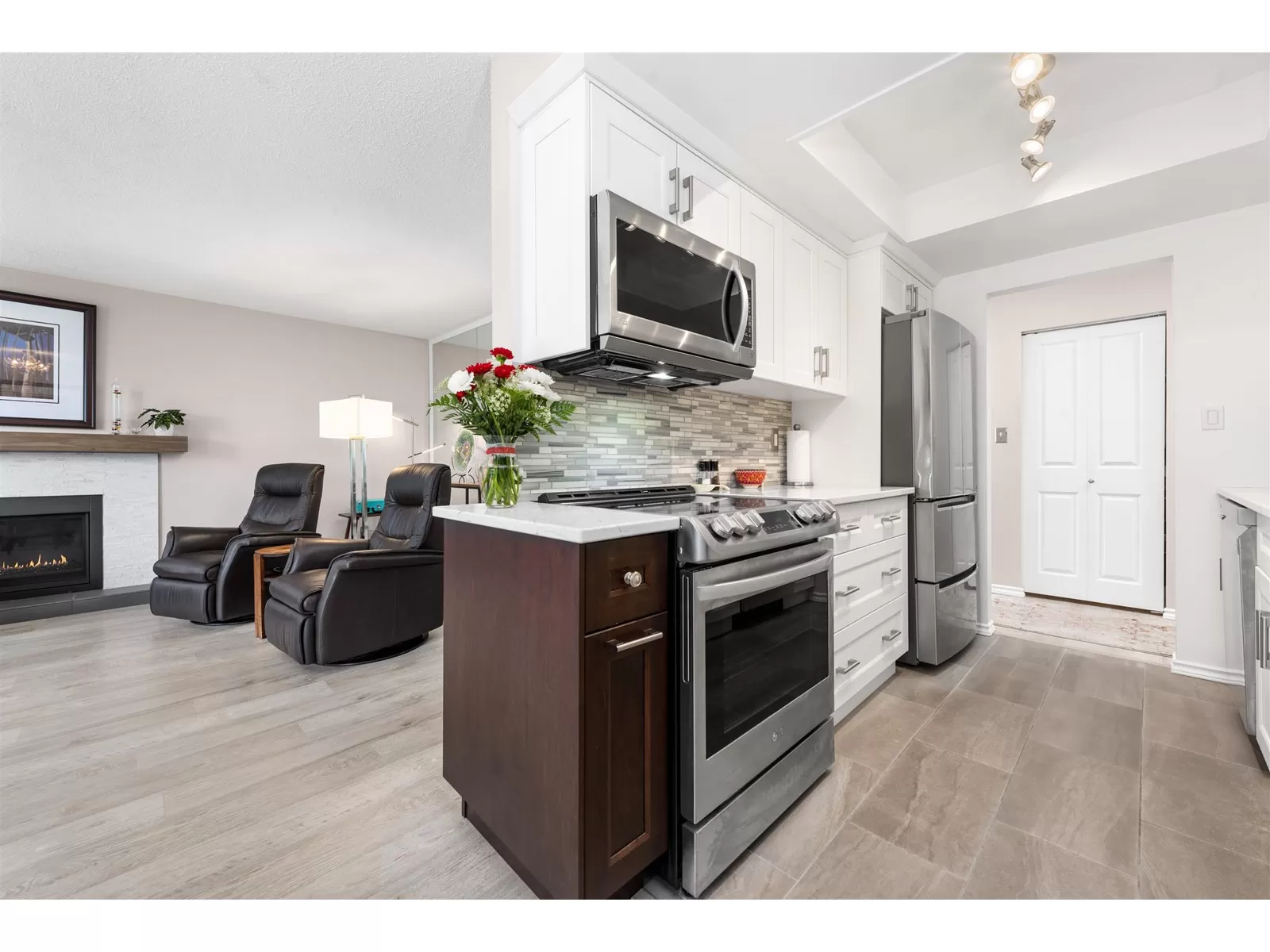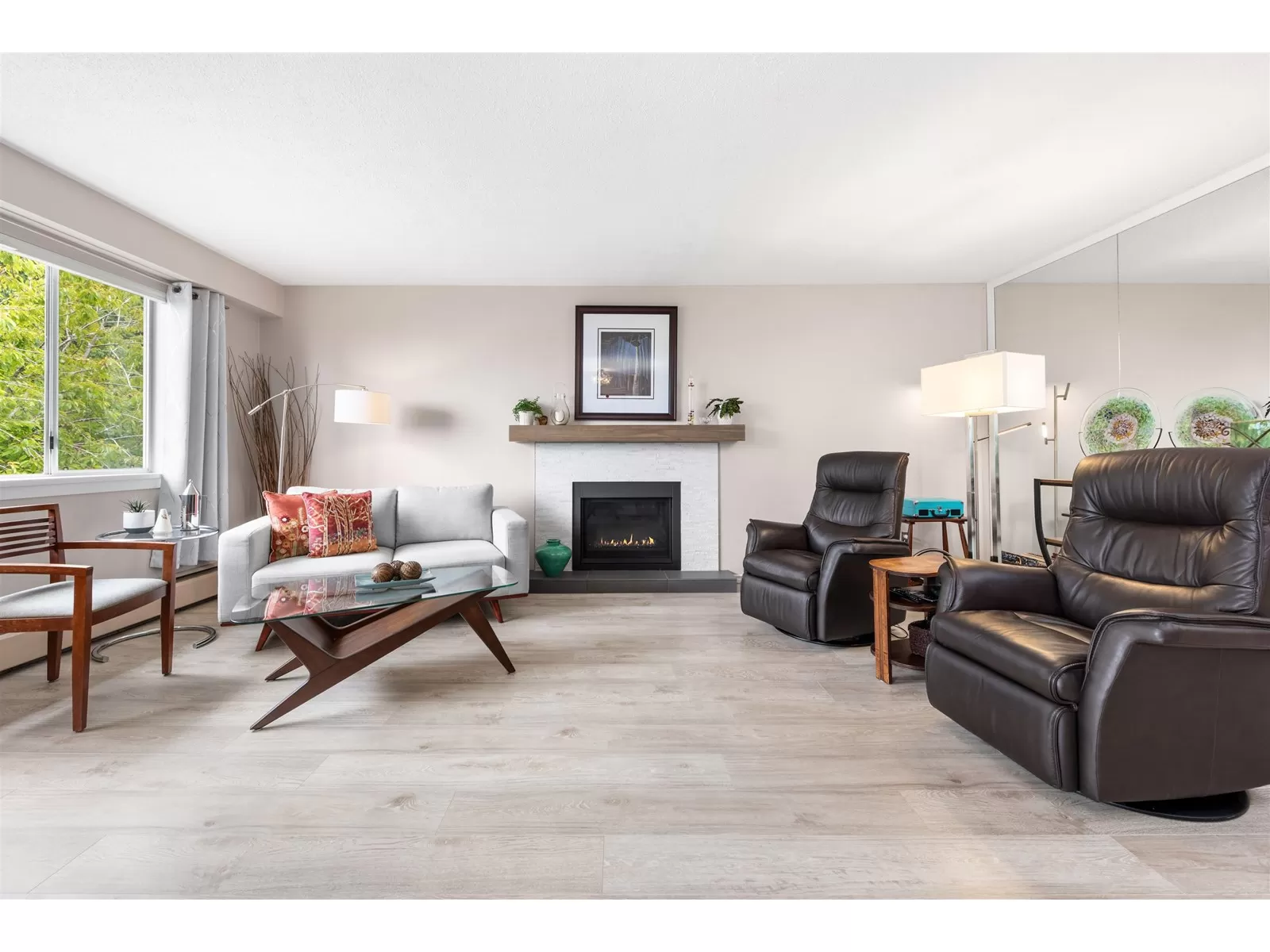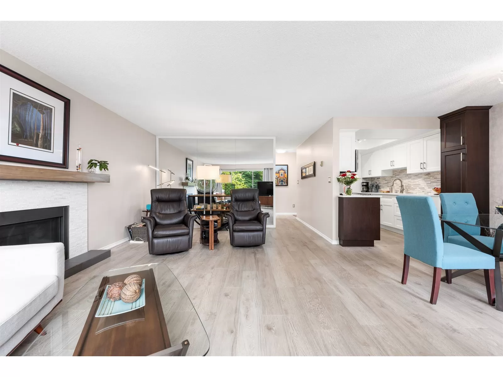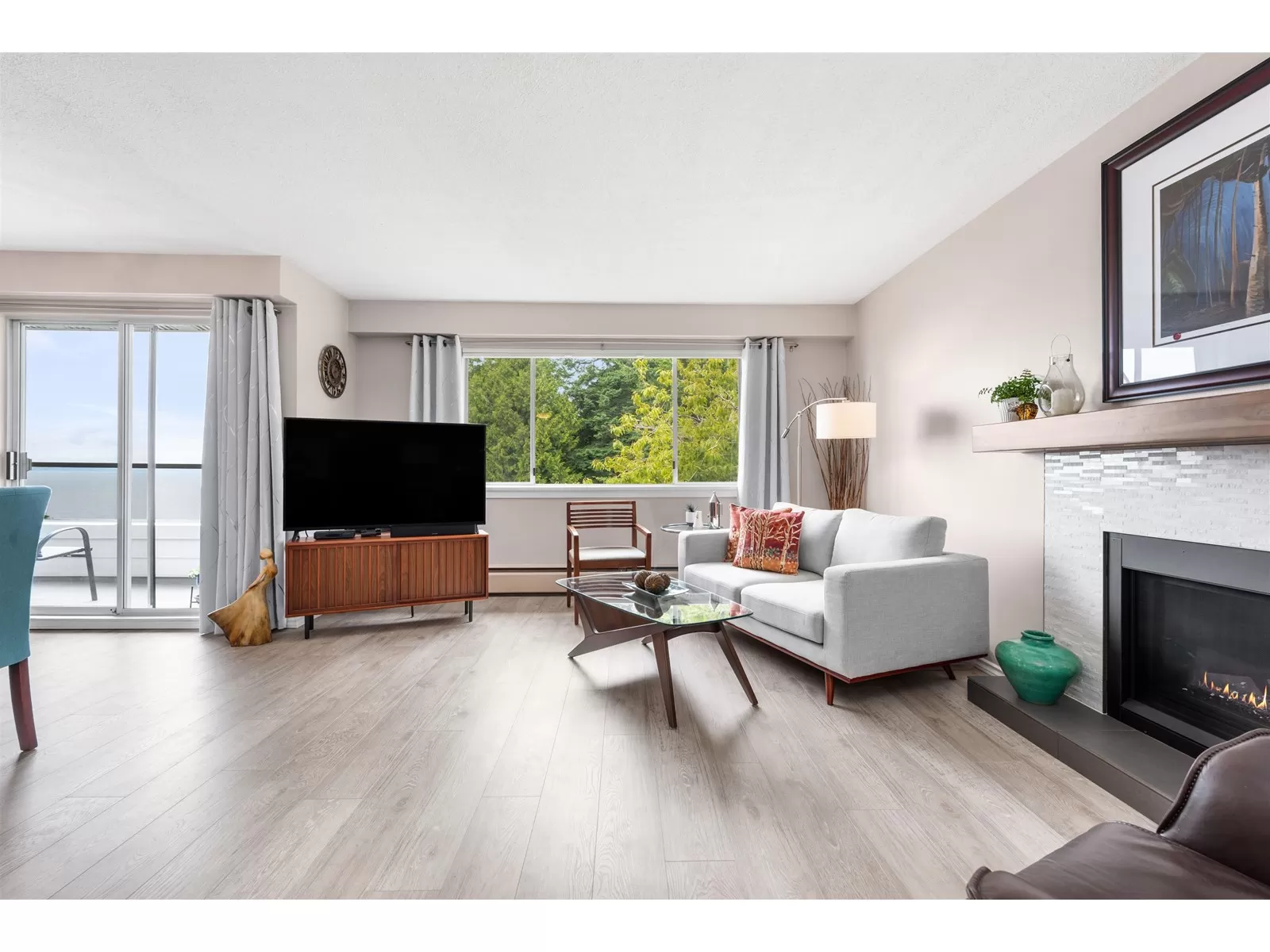 Enjoy breathtaking ocean views year-round from the West facing patio or while relaxing inside by the cozy gas fireplace in this beautifully updated 2 bed, 1.5 bath corner unit at the Baycrest. A private and quiet retreat, this home's serene, yet central location, faces White Rock's protected ravine, and with only a sundeck above it offers a true penthouse feel. Fully renovated throughout, featuring new flooring, updated bathrooms and kitchen with custom cabinetry and stylish modern finishes. Just a short stroll to shops, cafes, and restaurants, or take the beautifully landscaped stairs down to the beach. This is seaside living at its best-quiet, convenient, and move-in ready. Secure underground parking and heat incl. in strata fees. Book your appointment to catch the sunset here! (id:27476)