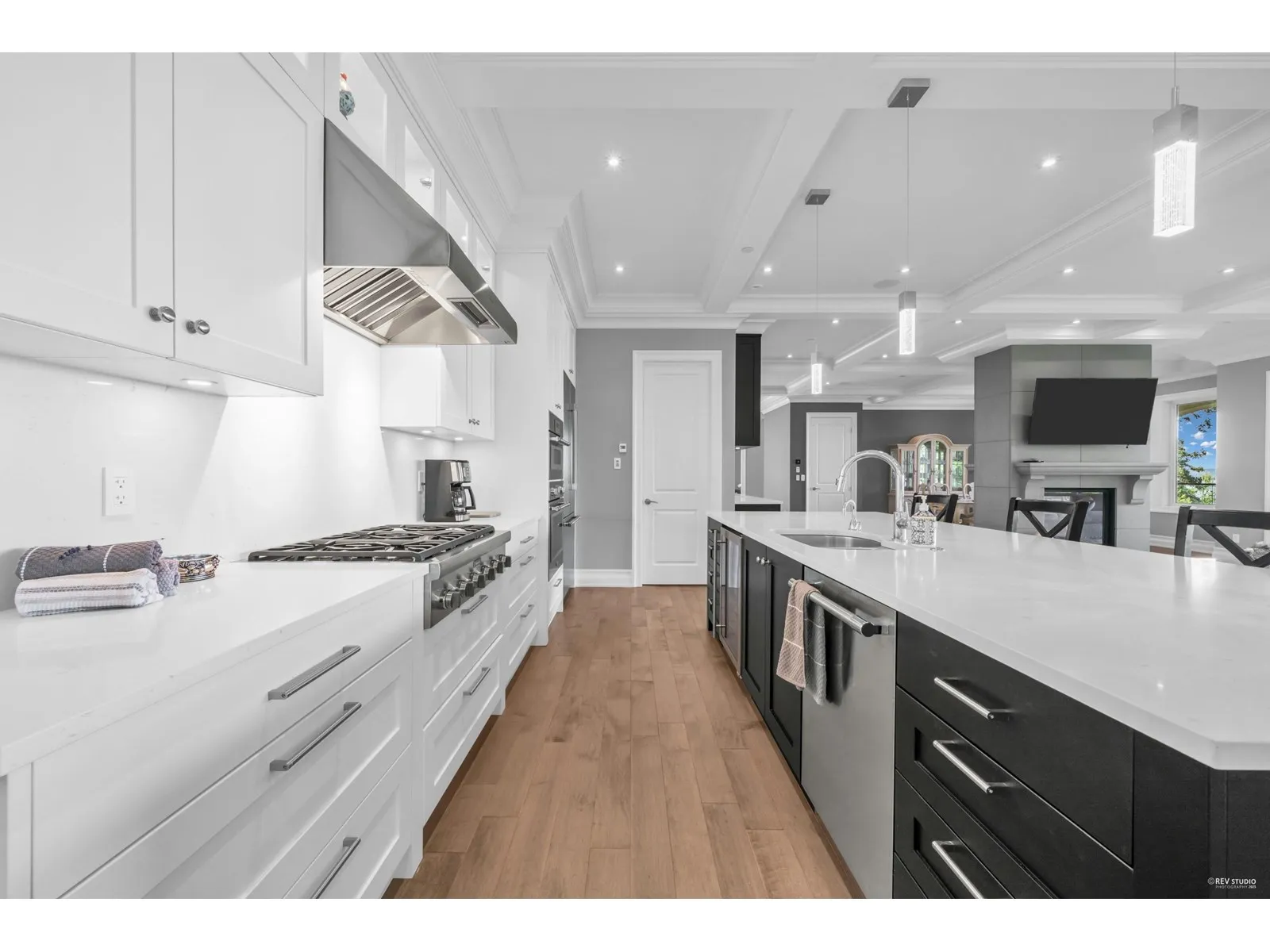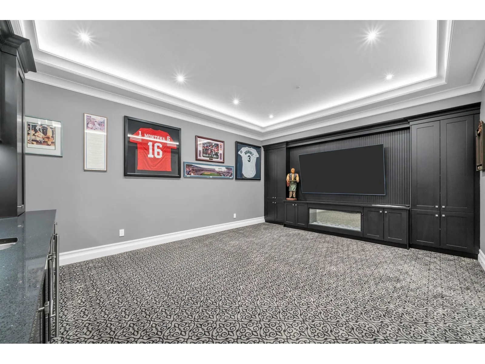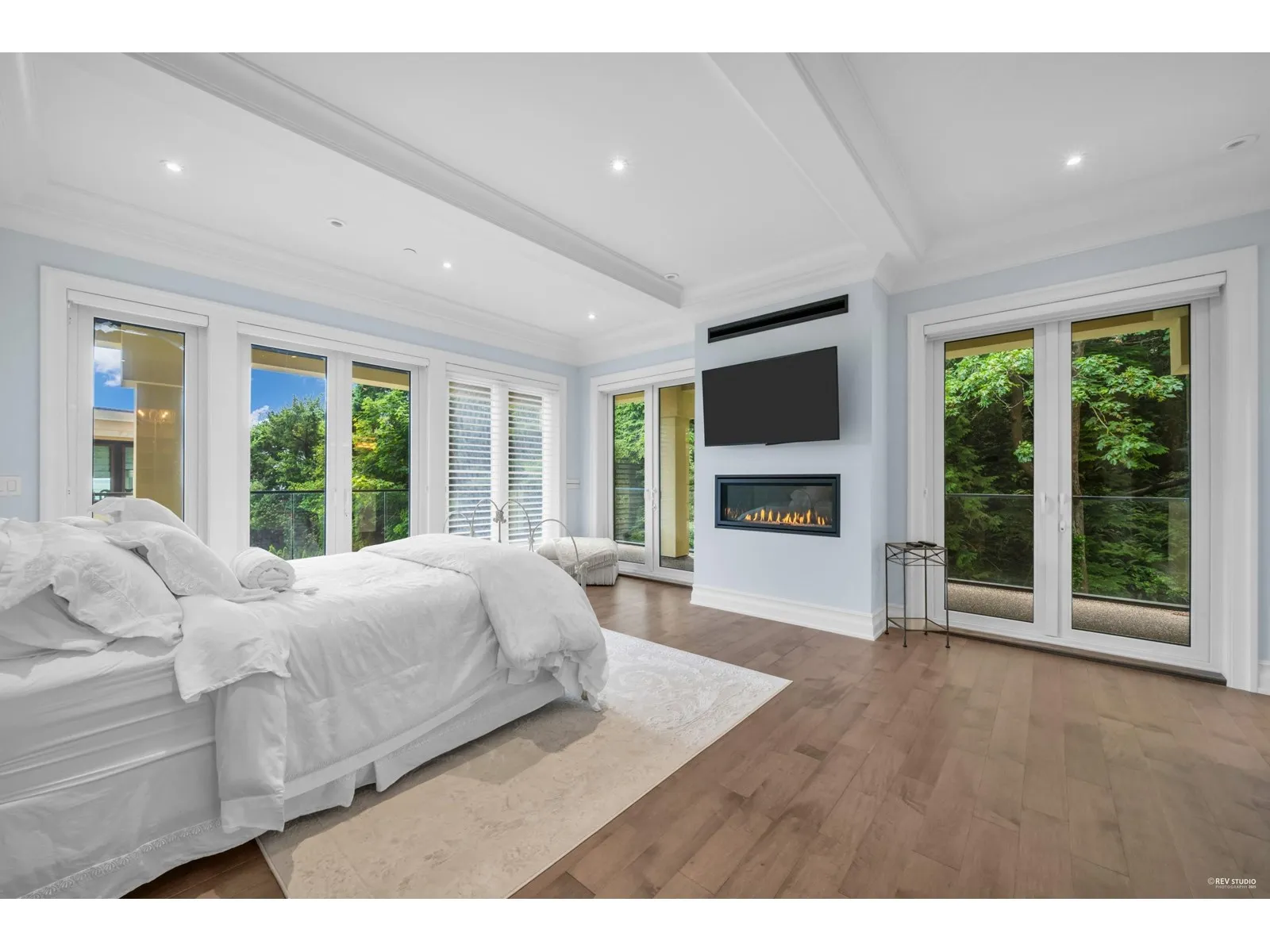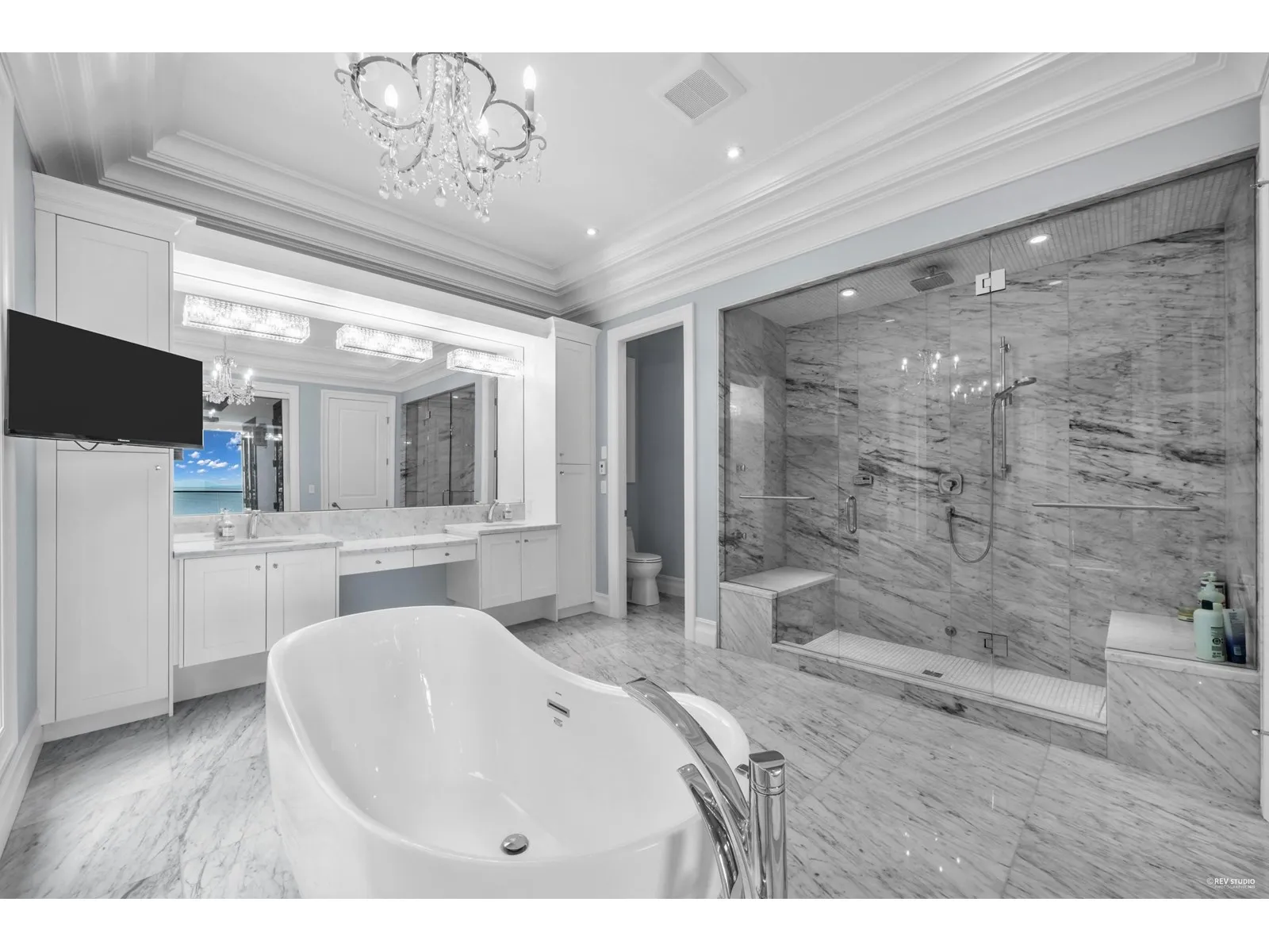 Must sell! Unobstructed panoramic ocean view. Pristine 5,734 sf executive home by renowned Ronco Construction on a S-facing 9,350 sf lot with 132.4' frontage, surrounded by mature trees and trail to Centennial Park. Main floor features open living/dining, Thermador gourmet kitchen, office/4th ensuite bdrm, and 1,080 sf wrap-around covered balcony plus 200+ sf private patio with built-in trellis-perfect for entertaining. Lower floor offers 4 spacious ensuite bdrms and 978 sf covered balcony. Luxurious primary ensuite with soaker tub, crystal chandelier, steam shower, marble finishes. Basement includes home theatre, 2-bdrm legal suite, wine cellar, and 5-car garage. 10' ceilings, Viessmann radiant heating, HRV, flood-warning system, elevator, cedar soffits, man-made stream, electric gate. (id:27476)