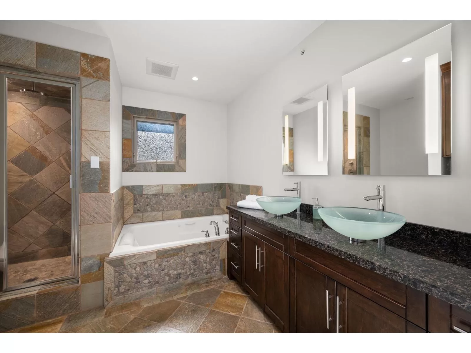 Beautiful gated estate home is like a luxurious resort. This stunning property spans over 5,000 sq. ft & has incredible living space & two suites! The upper level offers 3 full bedrooms (office could make 4) complete with ensuites & walk in closets! The master suite is a true retreat with a spacious walk-in closet, a gas fireplace & a spa-like ensuite bathroom. The giant open living room and oversized kitchen have high ceilings perfect for entertaining. Large dining room & media room! In-floor radiant heating, a/c, stone countertops, solid slate & hardwood flooring are some of the luxury features. Enjoy the lavish outdoor amenities, including a Monaco Design swimming pool & private backyard, perfect for friends & family to enjoy Summer days! Call realtor for full package. (id:27476)