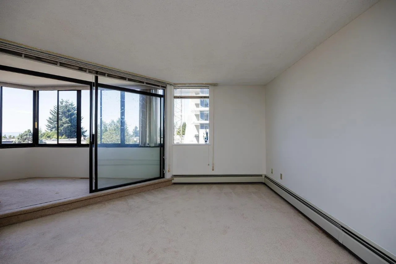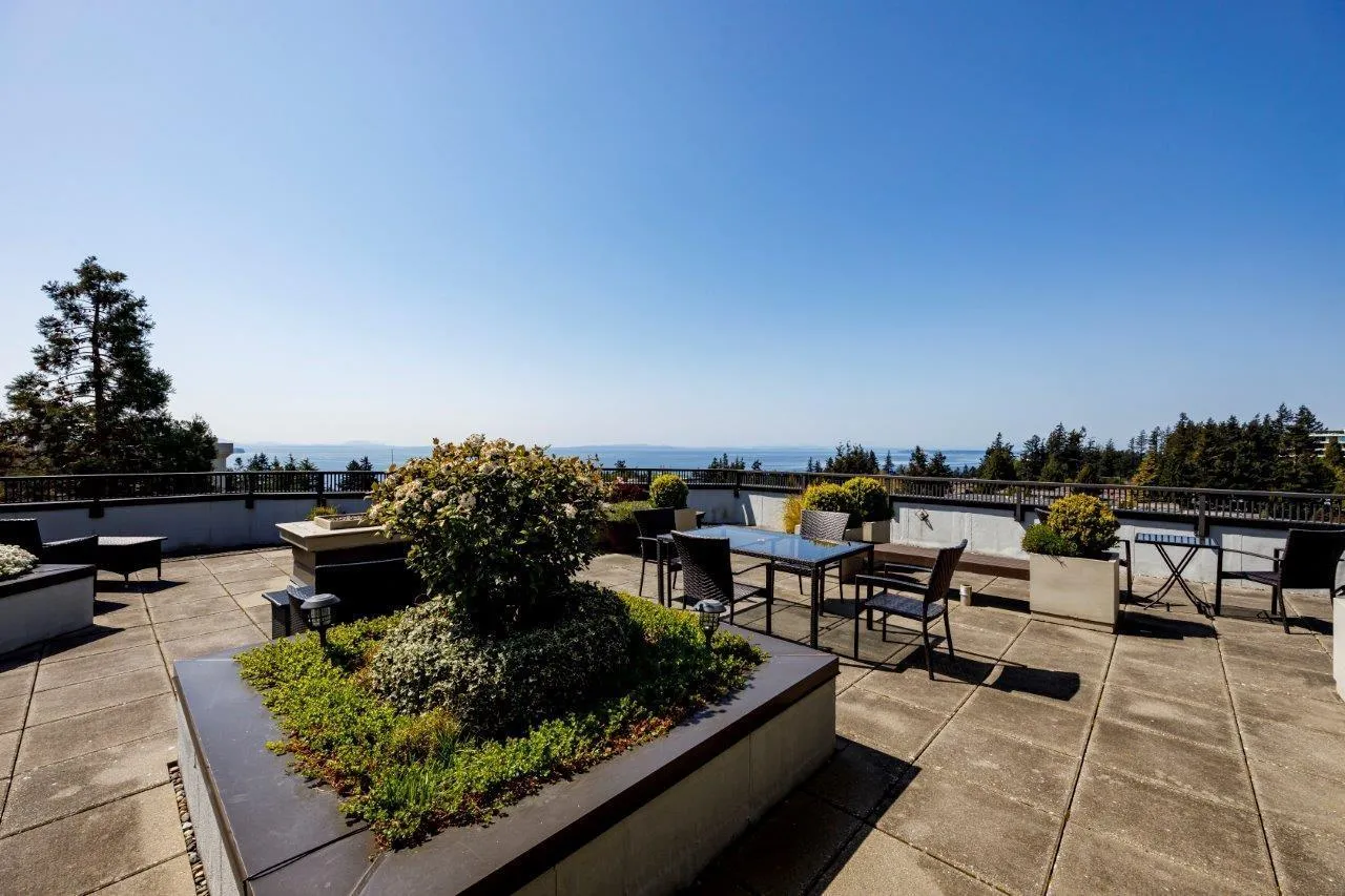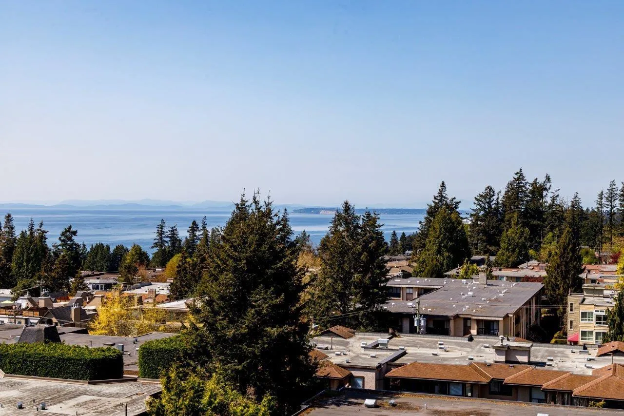 Large 1,054 sf 2 bedroom, 2 bathroom home with beautiful ocean views from the condo and the roof top common area that has a large terrace space, gardens, billiards room and sauna. White Rock Square I is a concrete building in Central White Rock with no age restrictions and includes heat and hot water. The enclosed balcony is additional space for year-round enjoyment. The condo has new paint throughout and professionally cleaned carpet. Walk to Peninsula mall, shopping, dining, transit and you'll love being so close to the beach! No pets allowed, rentals are allowed. (id:27476)