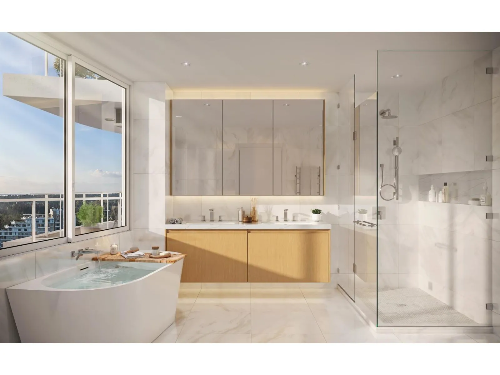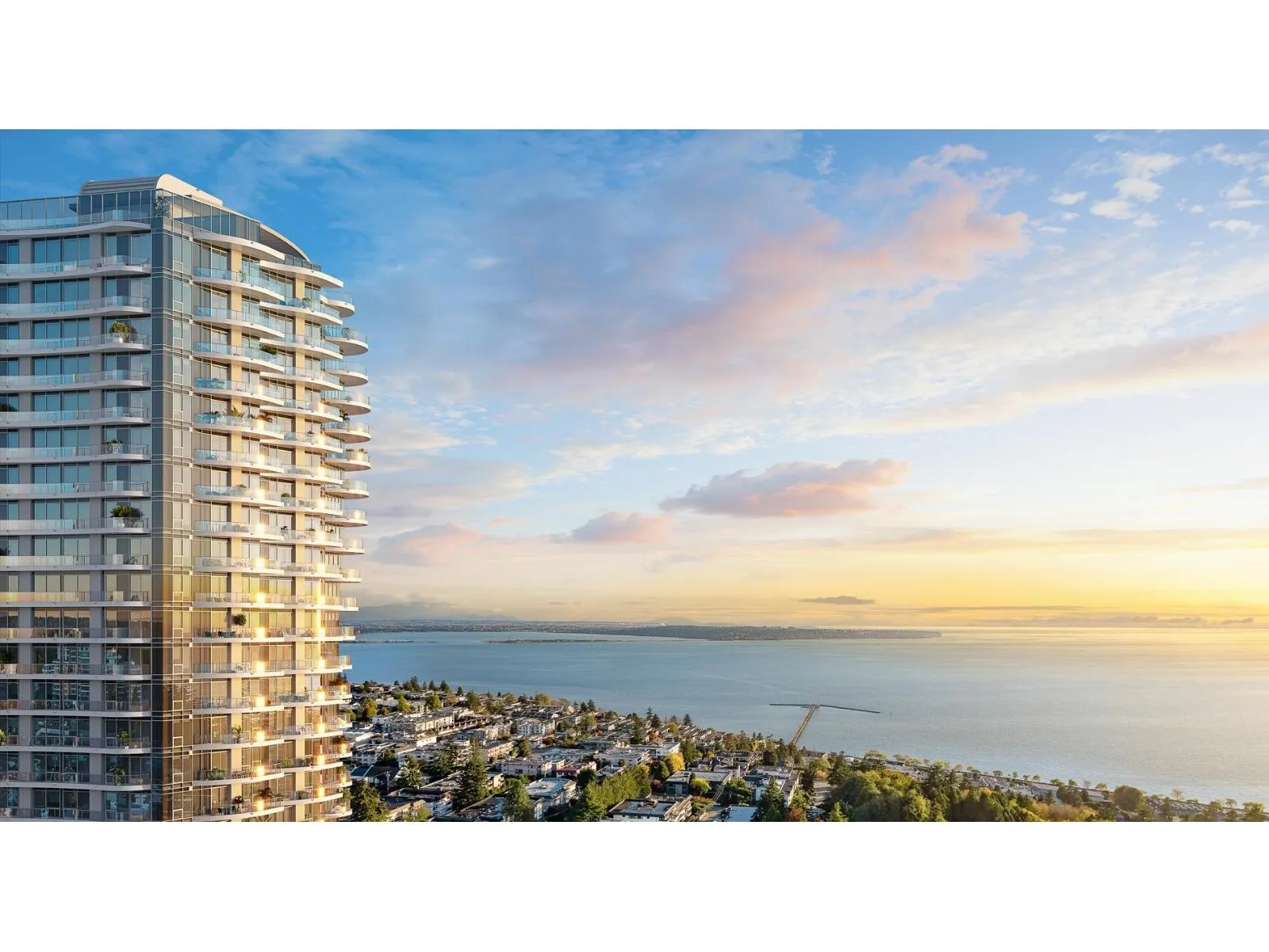 This is the concluding chapter of The Foster Martin Community - the third and final tower - Landmark Tower. Start living at the top of White Rock, amazing expansive Semiamoo Bay view with Mountain Baker as your living room decorating art piece, along with north shore mountain as the backdrop. Spacious 3 full bedroom open concept unit with 26 feet wide living and dining room, featuring two primary bedroom with ensuite bathroom and walk-in closet. The kitchen is fully equipped for a master chef with a full size Miele integrated appliance package. As a resident of Foster Martin, you will have access to 10,000 square feet of health and wellness amenities including an indoor/outdoor pool, a fully equipped gym and yoga room, full service concierge. Visit the sales center at 6-1493 Foster Street. Moving in March 2026 (id:27476)