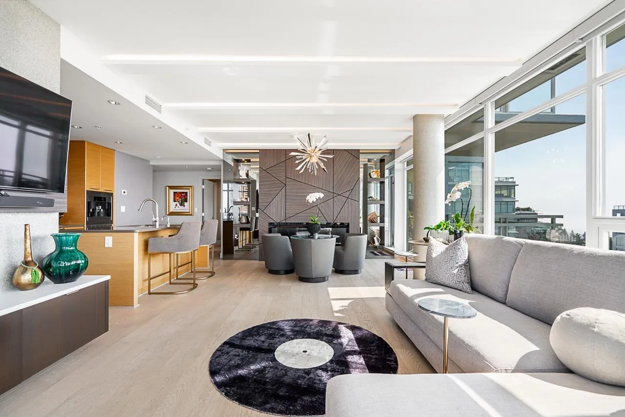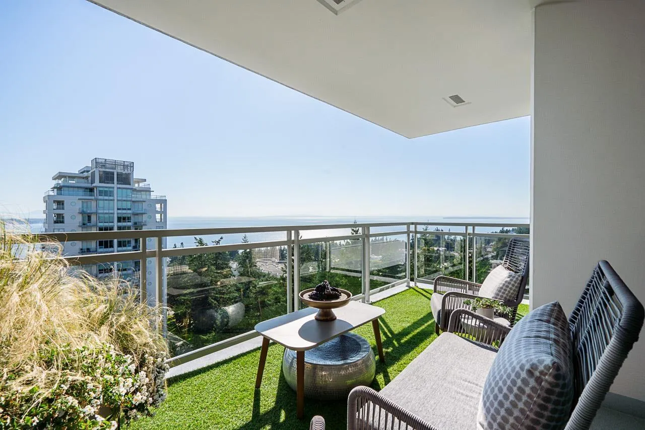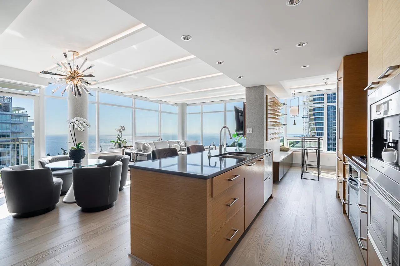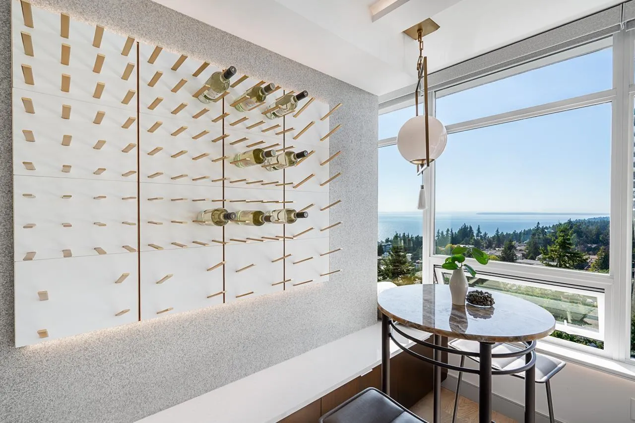 RARE SOUTH-WEST CORNER! Experience stunning views & luxury living in this beautifully renovated unit. Gorgeous primary + custom murphy-bed/office, 2 bathroom condo in Bosa Miramar, featuring breathtaking panoramic views of the ocean and mountains. High end designer updates & finishing. The open-concept layout offers a seamless flow between the gourmet kitchen, elegant dining area, and bright living spaces. The kitchen boasts premium appliances, custom cabinetry, and quartz countertops, with spa-inspired bathrooms providing a touch of sophistication. Expansive windows and a spacious balcony invite natural light and stunning sunsets. Situated in a highly sought-after community, this home offers exceptional amenities and is steps away from shops, restaurants, and the beach. (id:27476)