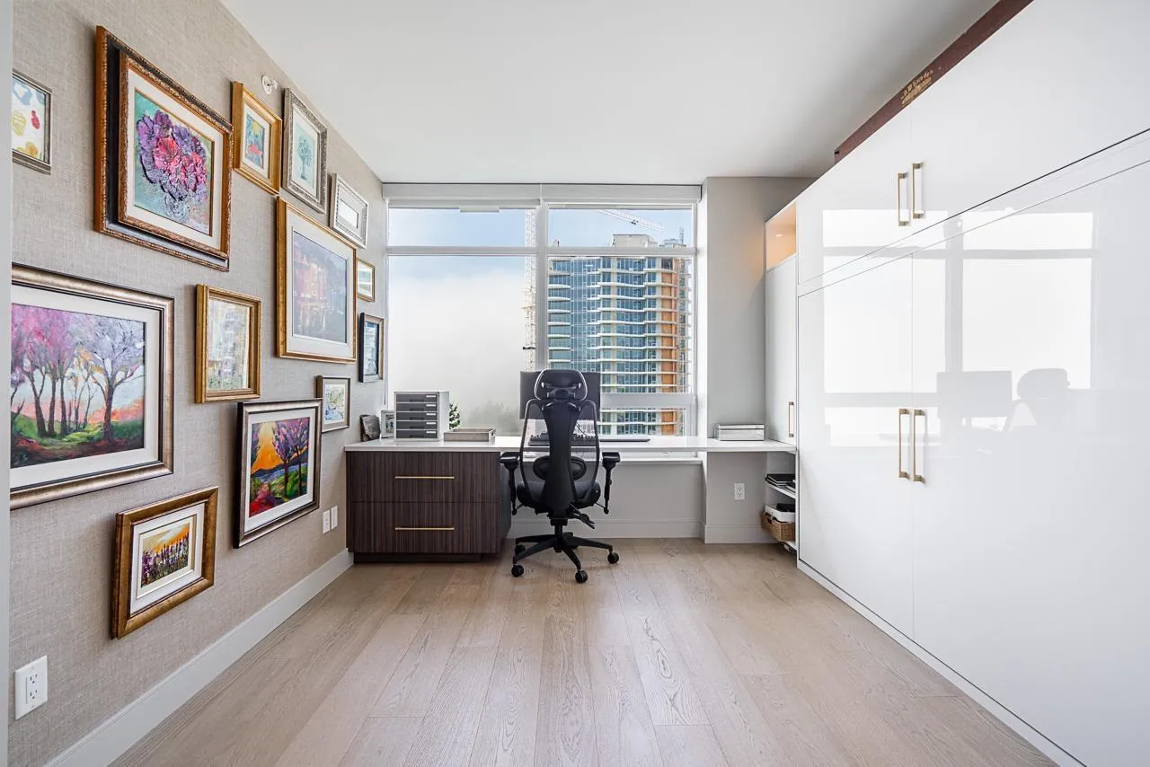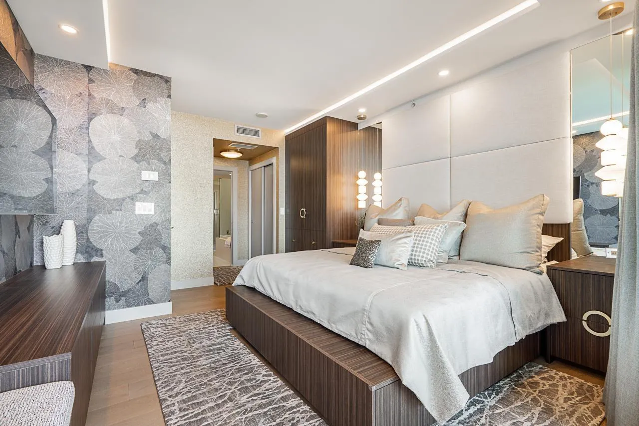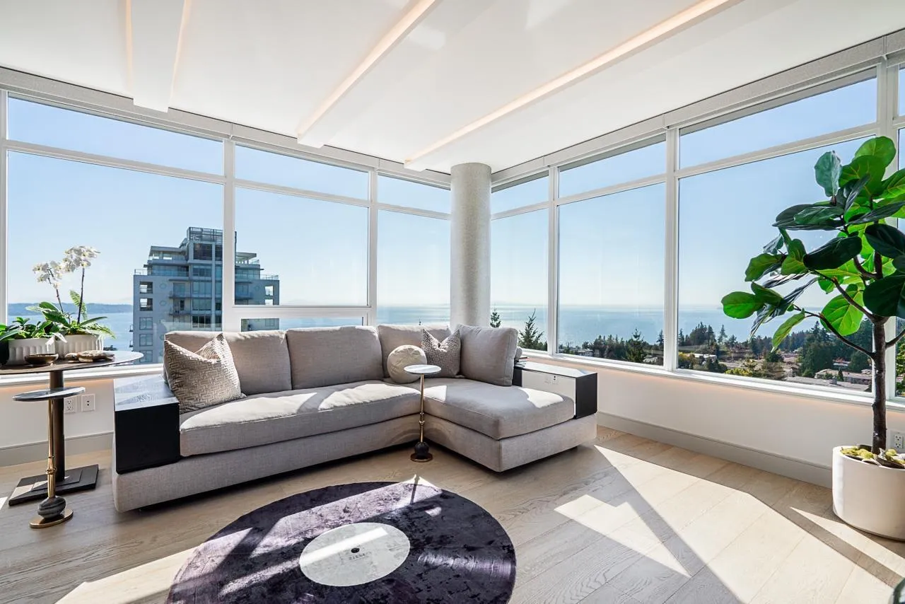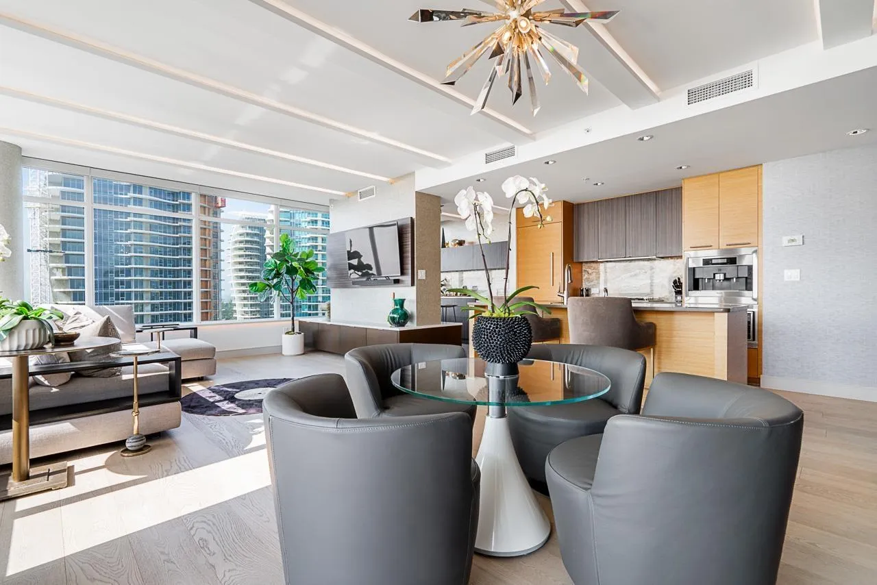 RARE SOUTH-WEST CORNER! Experience stunning views & luxury living in this beautifully renovated unit. Gorgeous primary + custom murphy-bed/office, 2 bathroom condo in Bosa Miramar, featuring breathtaking panoramic views of the ocean and mountains. High end designer updates & finishing. The open-concept layout offers a seamless flow between the gourmet kitchen, elegant dining area, and bright living spaces. The kitchen boasts premium appliances, custom cabinetry, and quartz countertops, with spa-inspired bathrooms providing a touch of sophistication. Expansive windows and a spacious balcony invite natural light and stunning sunsets. Situated in a highly sought-after community, this home offers exceptional amenities and is steps away from shops, restaurants, and the beach. (id:27476)