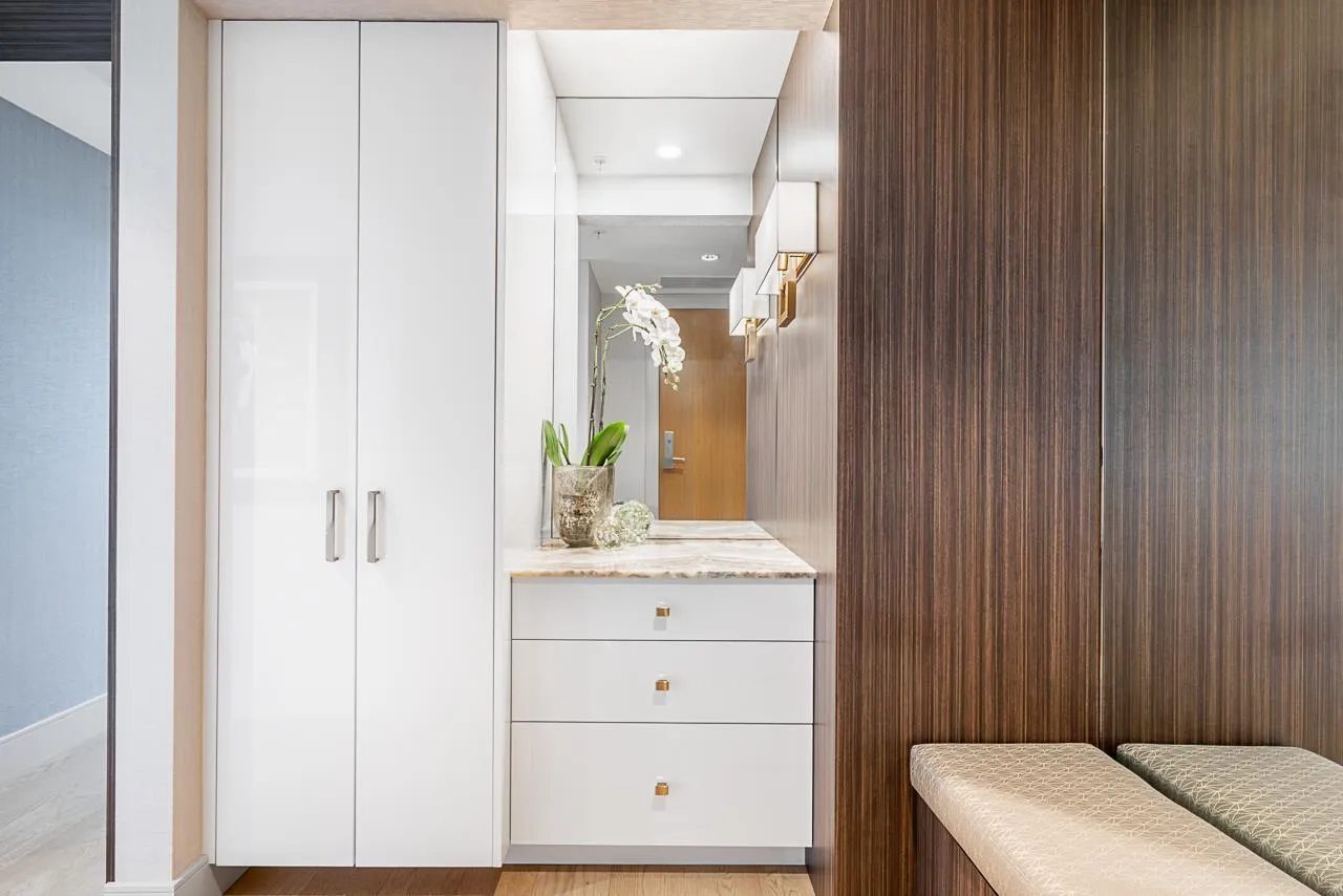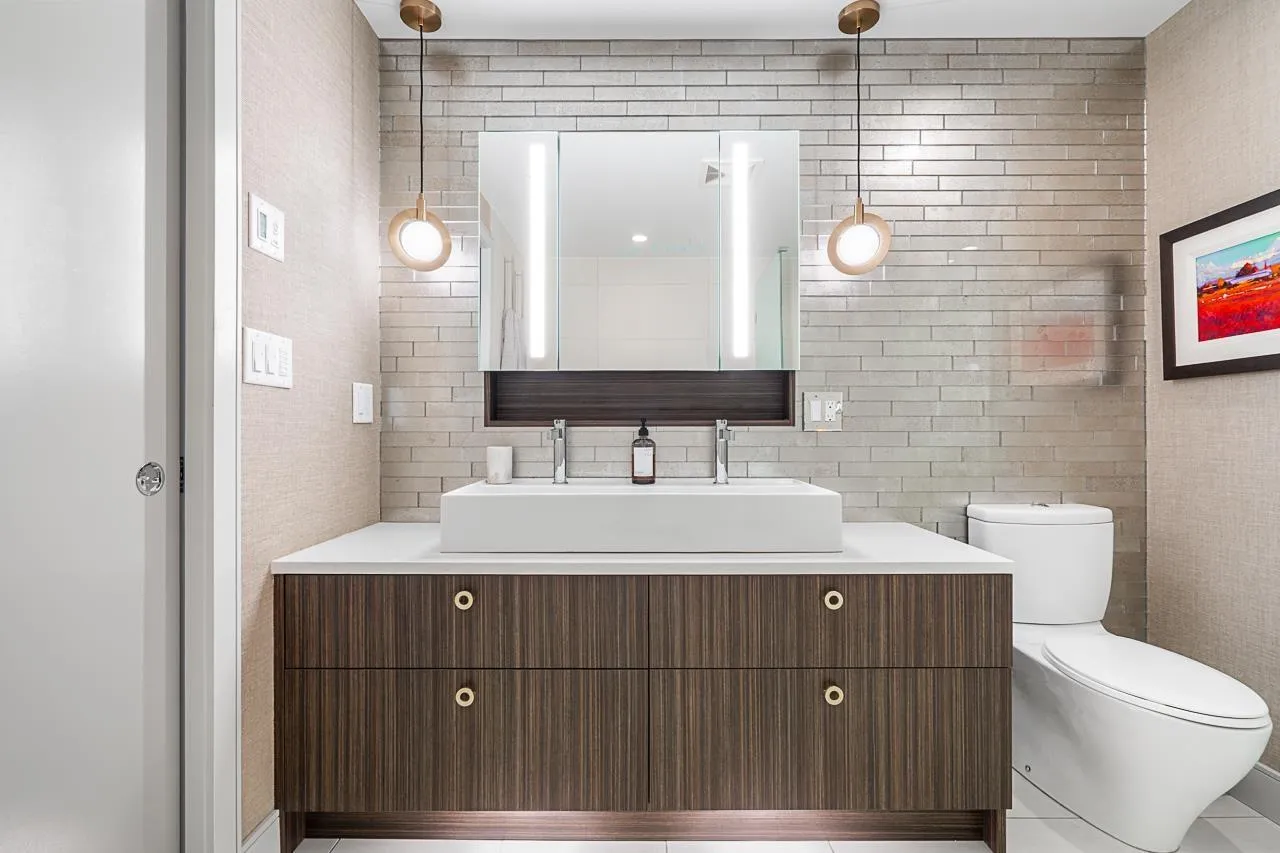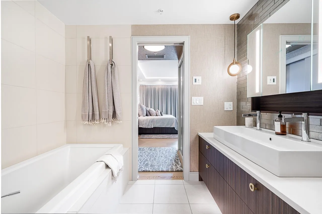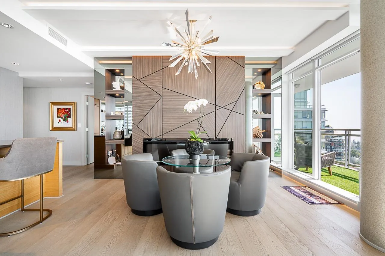 RARE SOUTH-WEST CORNER! Experience stunning views & luxury living in this beautifully renovated unit. Gorgeous primary + custom murphy-bed/office, 2 bathroom condo in Bosa Miramar, featuring breathtaking panoramic views of the ocean and mountains. High end designer updates & finishing. The open-concept layout offers a seamless flow between the gourmet kitchen, elegant dining area, and bright living spaces. The kitchen boasts premium appliances, custom cabinetry, and quartz countertops, with spa-inspired bathrooms providing a touch of sophistication. Expansive windows and a spacious balcony invite natural light and stunning sunsets. Situated in a highly sought-after community, this home offers exceptional amenities and is steps away from shops, restaurants, and the beach. (id:27476)