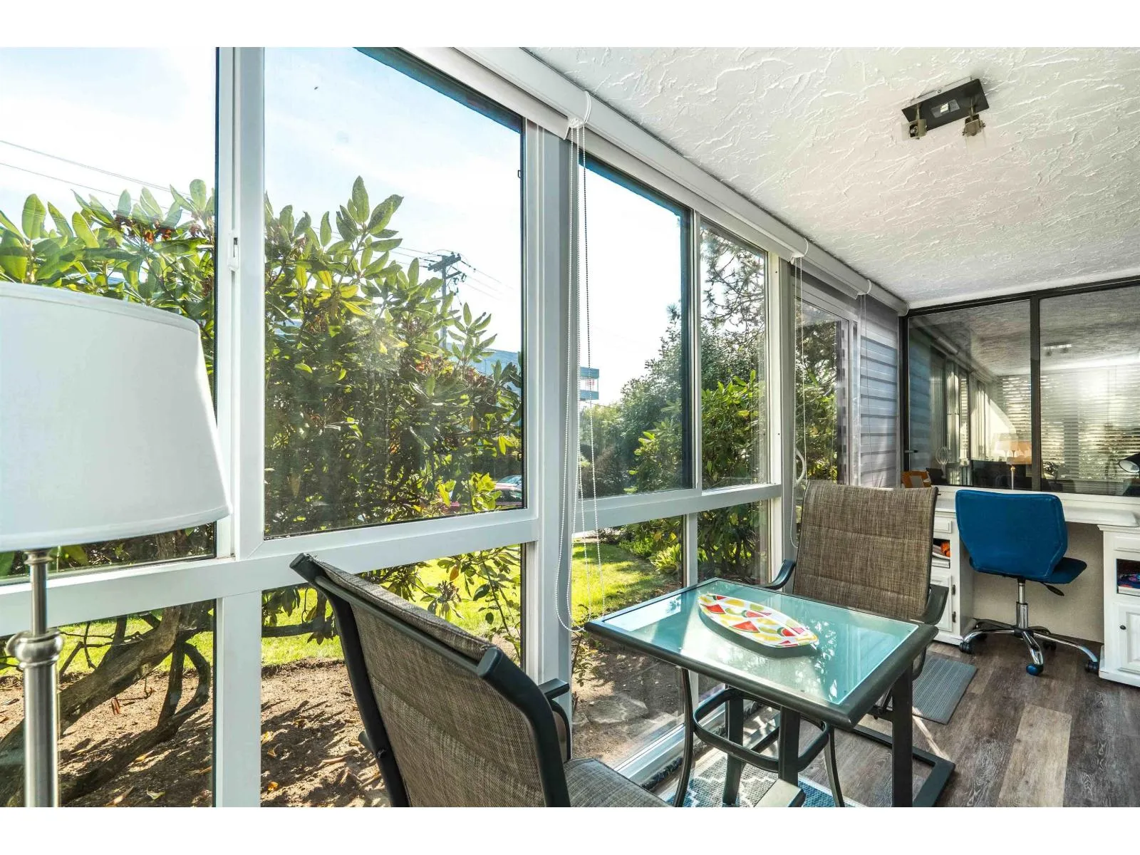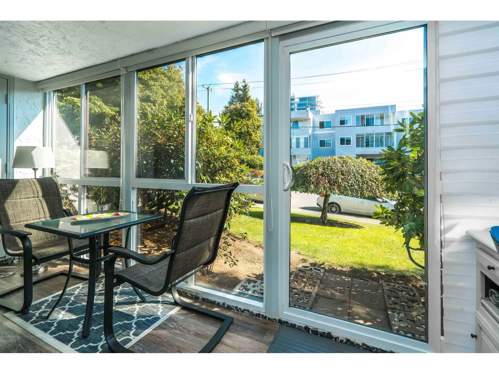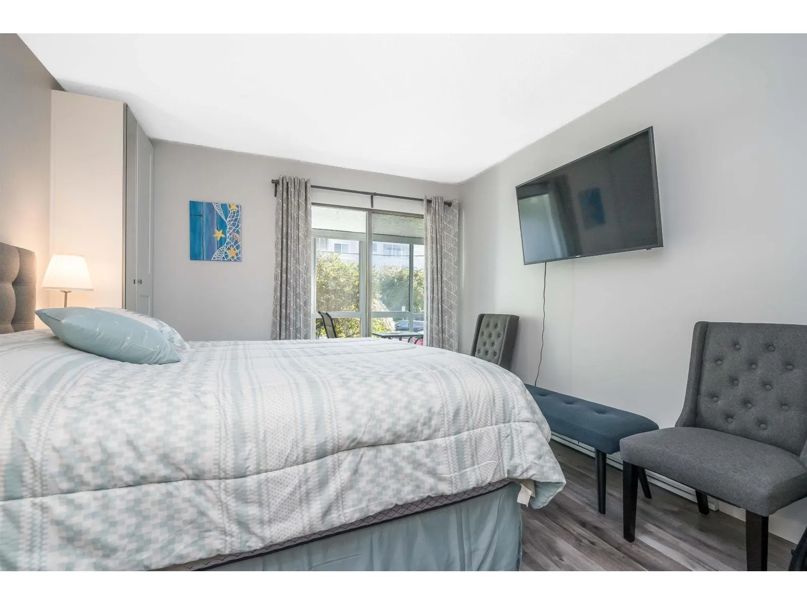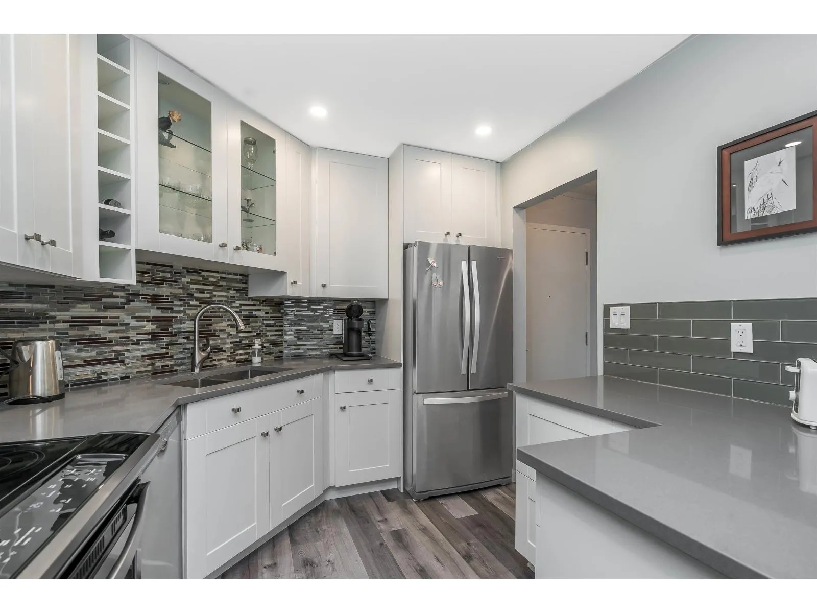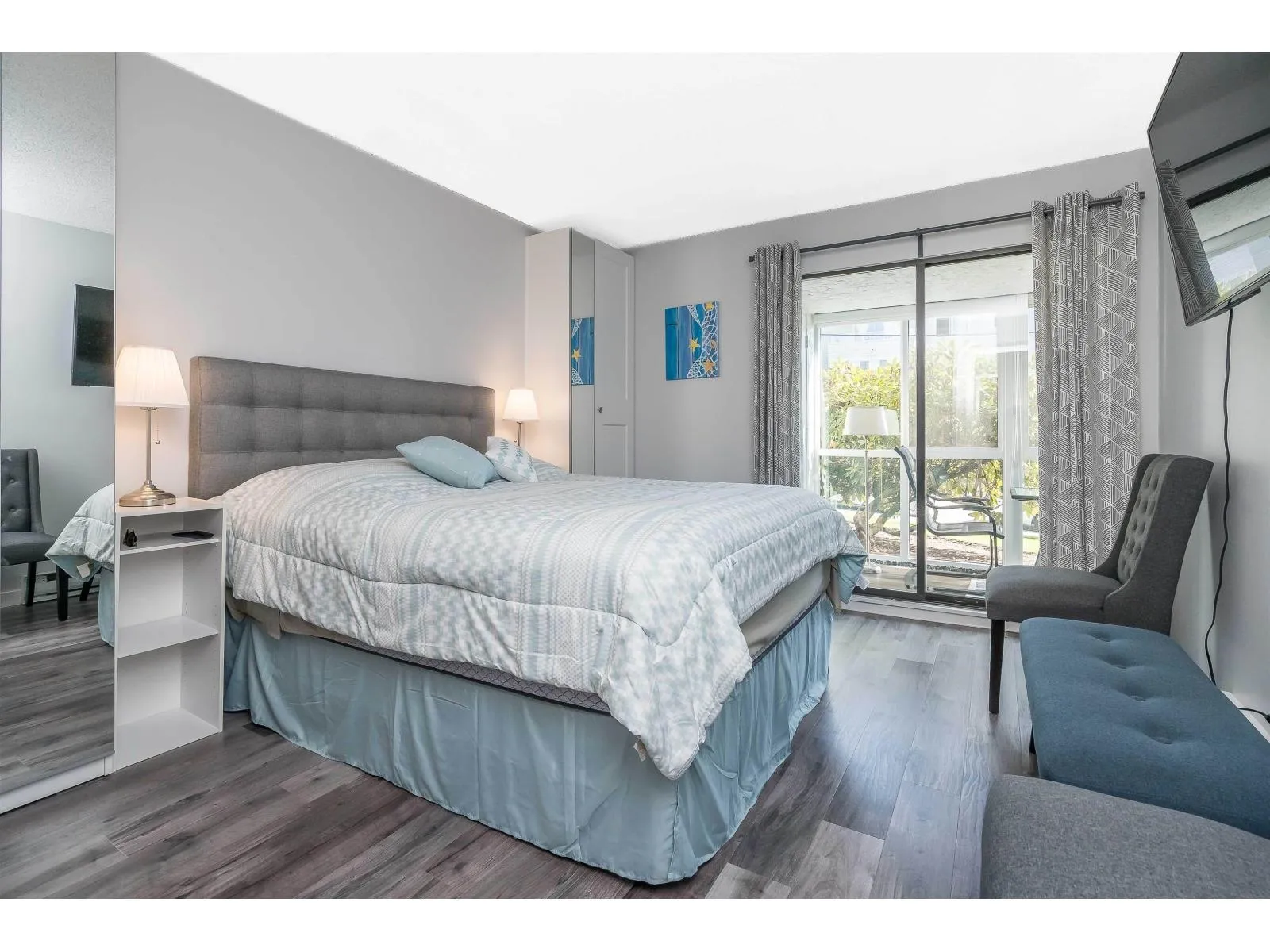 Summerhill. MOVE-IN READY! Furnished & beautifully updated 2 bed, 2 bath home in the heart of White Rock. Immaculate and well designed condo offers a modern kitchen with quartz countertops, white cabinetry, stainless steel appliances (new fridge) & double sinks. Designer colour scheme, stylish laminate flooring throughout with a bright spacious living room offering unique sliding barn doors leading into the 2nd bedroom. Primary bedroom has walk thru his/her closets & extra built in storages beside the bed. Enclosed sunroom (included in sq.ft.) with sliding glass doors & bonus storage! 1 parking stall & storage locker underground. Condo includes furniture. Centrally located within walking distance to White Rock town centre with its many shops & restaurants. 55+ age restriction & 1 cat ok. (id:27476)