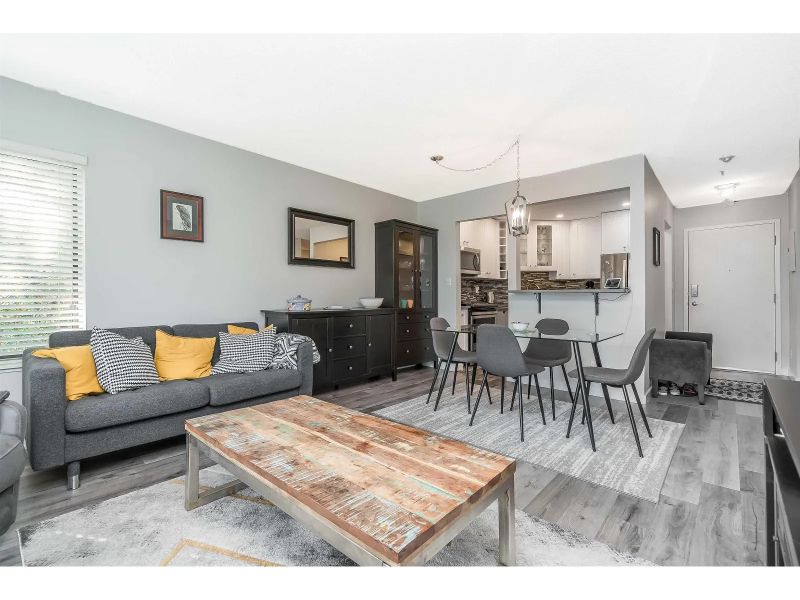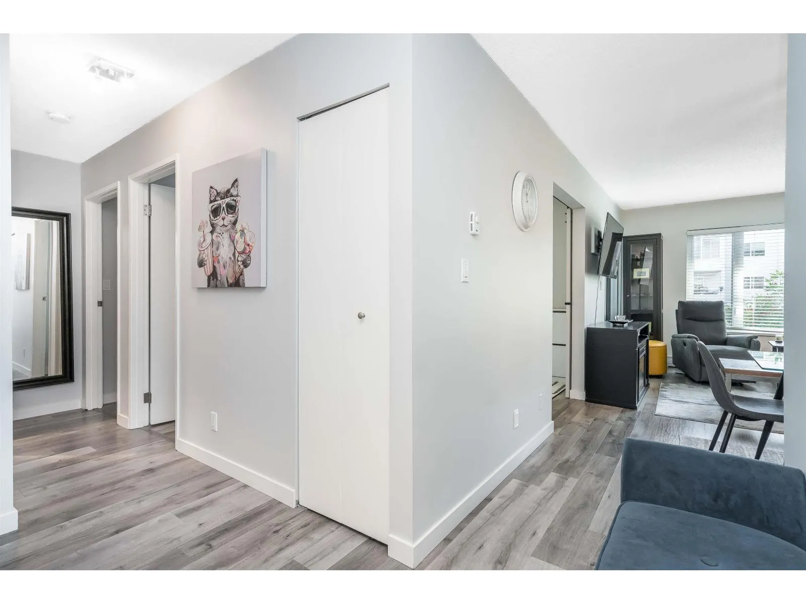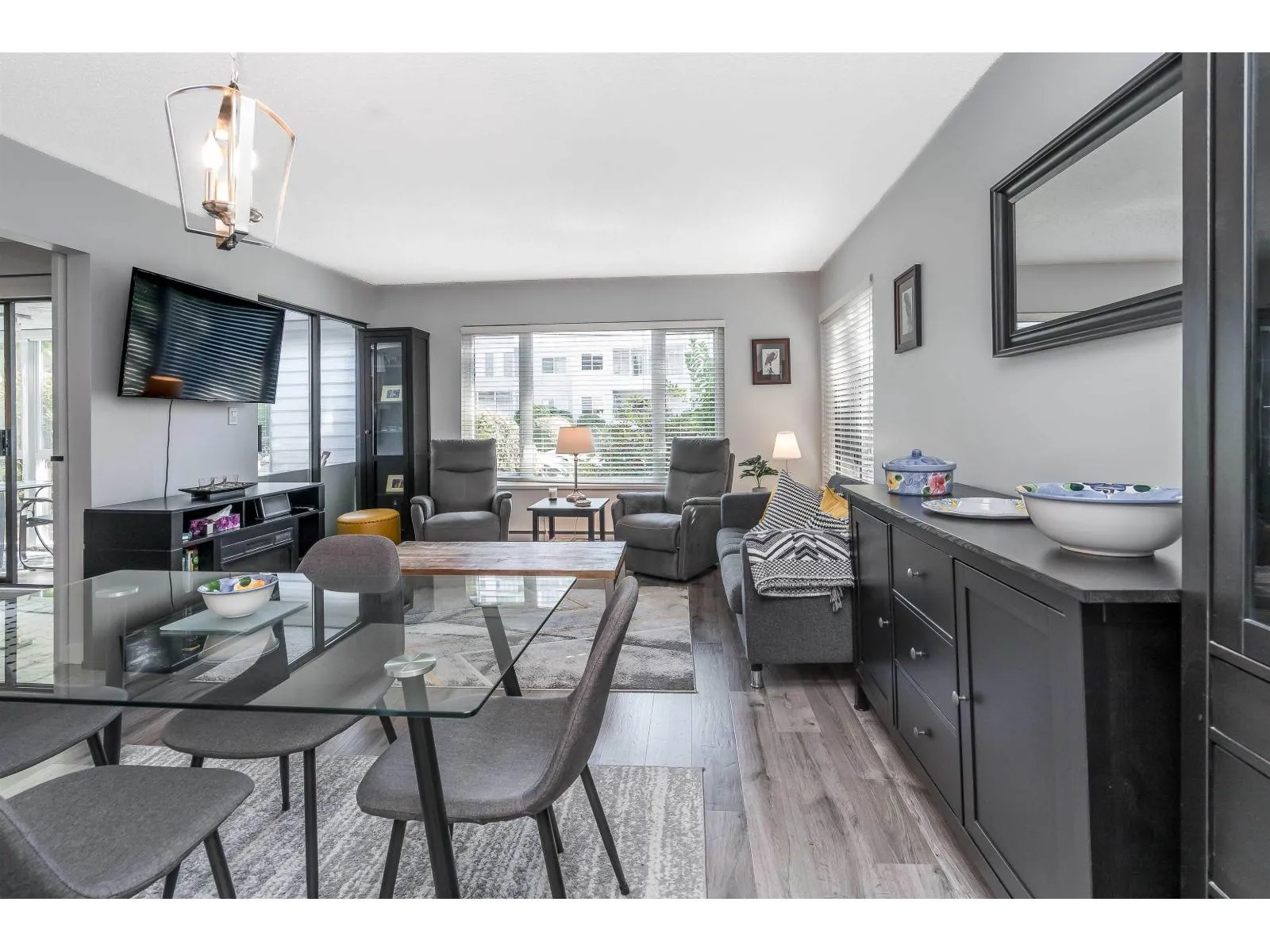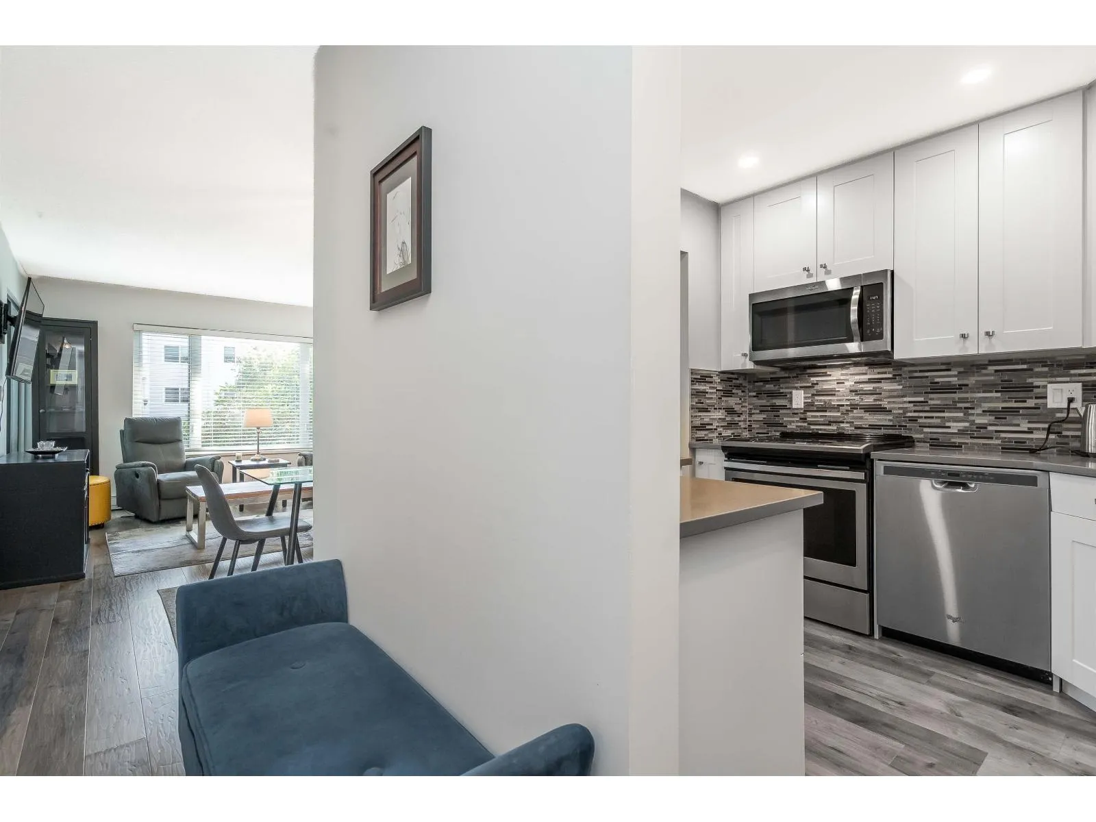 Summerhill. MOVE-IN READY! Furnished & beautifully updated 2 bed, 2 bath home in the heart of White Rock. Immaculate and well designed condo offers a modern kitchen with quartz countertops, white cabinetry, stainless steel appliances (new fridge) & double sinks. Designer colour scheme, stylish laminate flooring throughout with a bright spacious living room offering unique sliding barn doors leading into the 2nd bedroom. Primary bedroom has walk thru his/her closets & extra built in storages beside the bed. Enclosed sunroom (included in sq.ft.) with sliding glass doors & bonus storage! 1 parking stall & storage locker underground. Condo includes furniture. Centrally located within walking distance to White Rock town centre with its many shops & restaurants. 55+ age restriction & 1 cat ok. (id:27476)