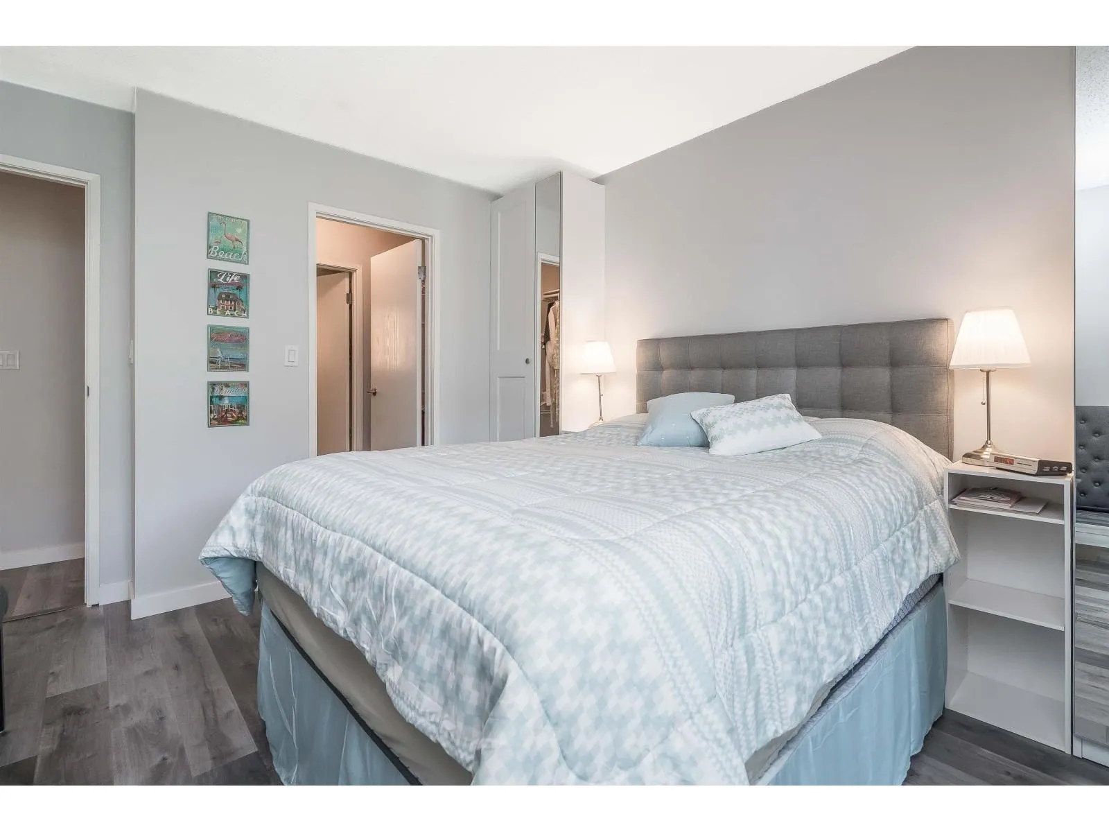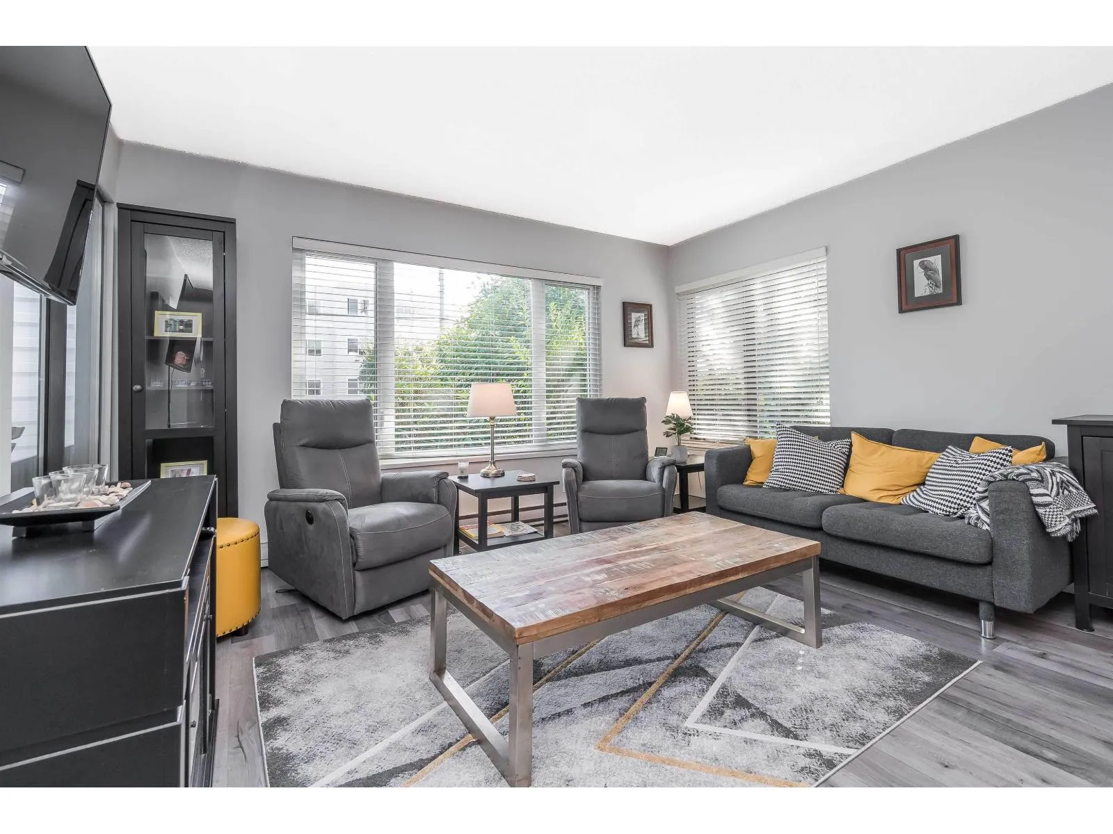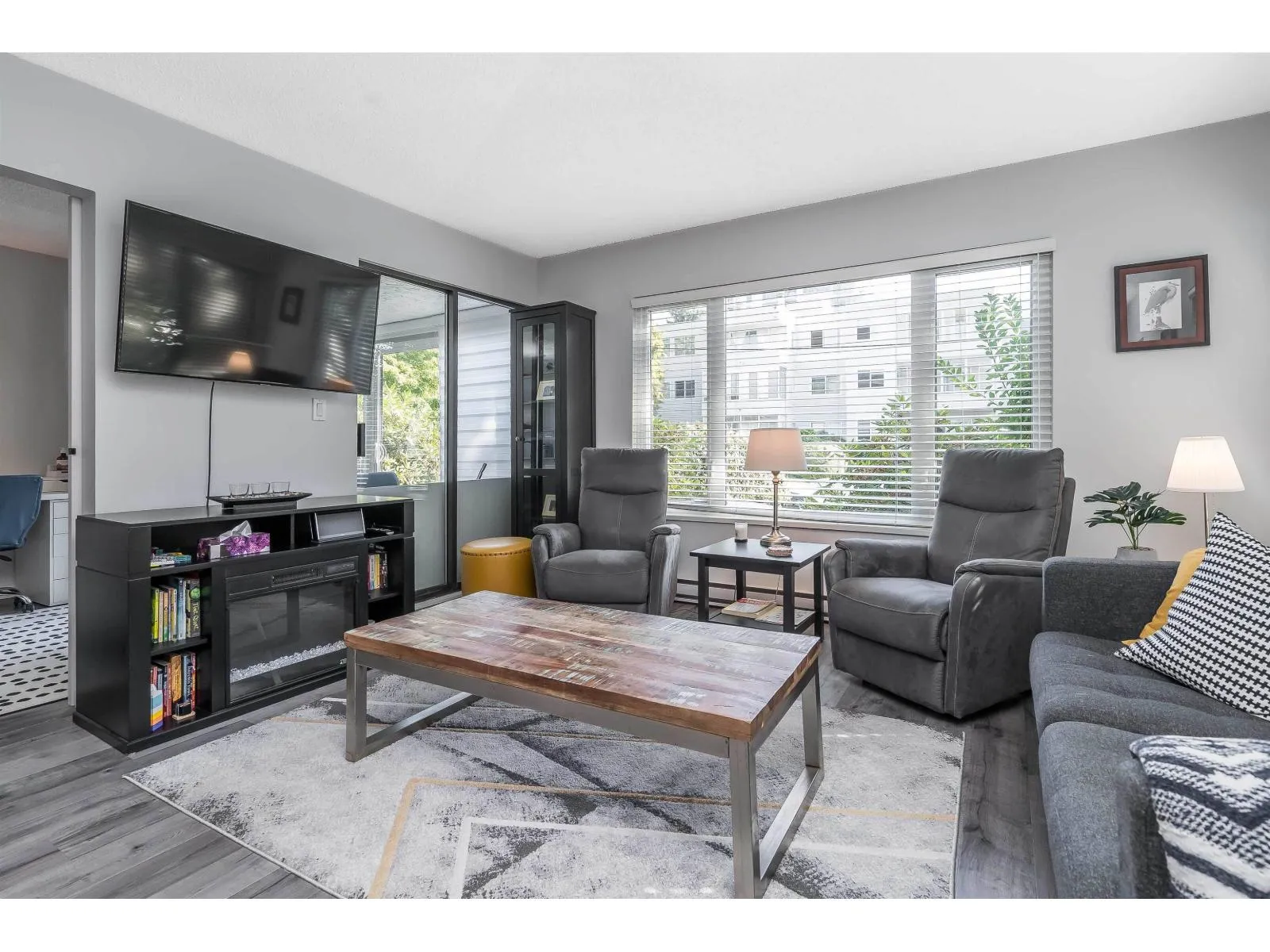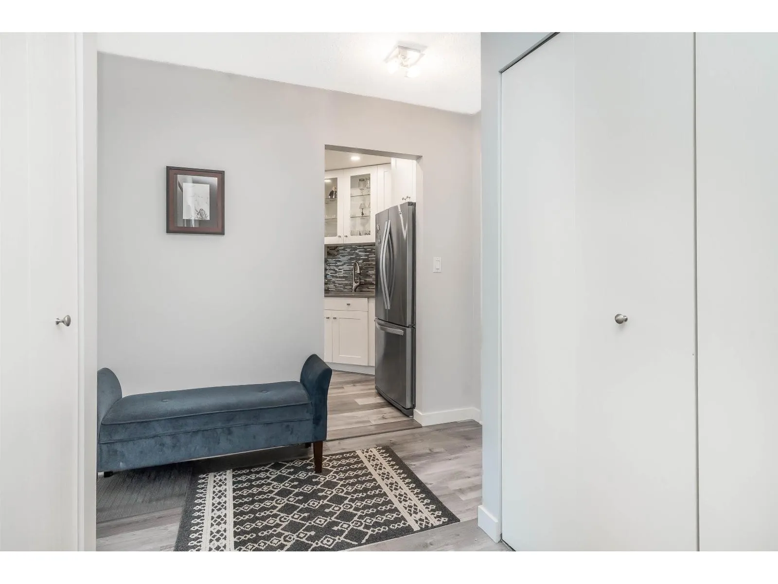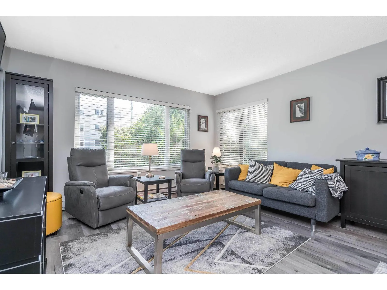 Summerhill. MOVE-IN READY! Furnished & beautifully updated 2 bed, 2 bath home in the heart of White Rock. Immaculate and well designed condo offers a modern kitchen with quartz countertops, white cabinetry, stainless steel appliances (new fridge) & double sinks. Designer colour scheme, stylish laminate flooring throughout with a bright spacious living room offering unique sliding barn doors leading into the 2nd bedroom. Primary bedroom has walk thru his/her closets & extra built in storages beside the bed. Enclosed sunroom (included in sq.ft.) with sliding glass doors & bonus storage! 1 parking stall & storage locker underground. Condo includes furniture. Centrally located within walking distance to White Rock town centre with its many shops & restaurants. 55+ age restriction & 1 cat ok. (id:27476)