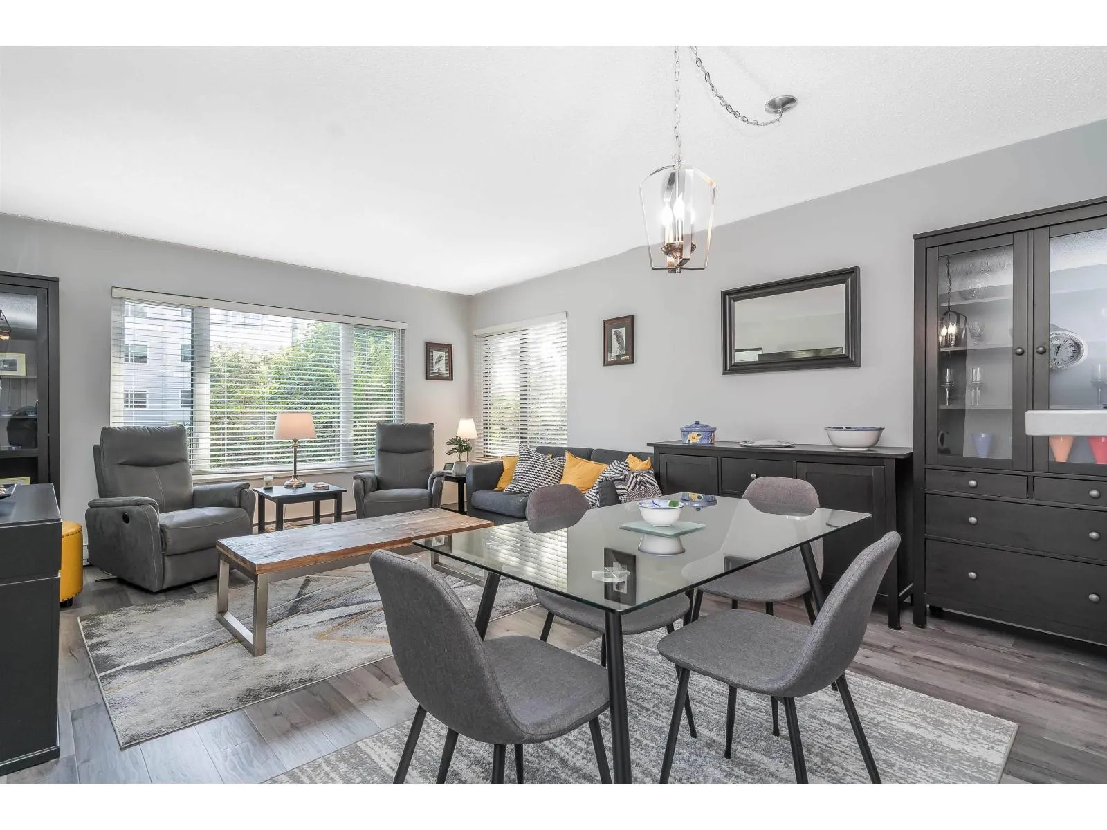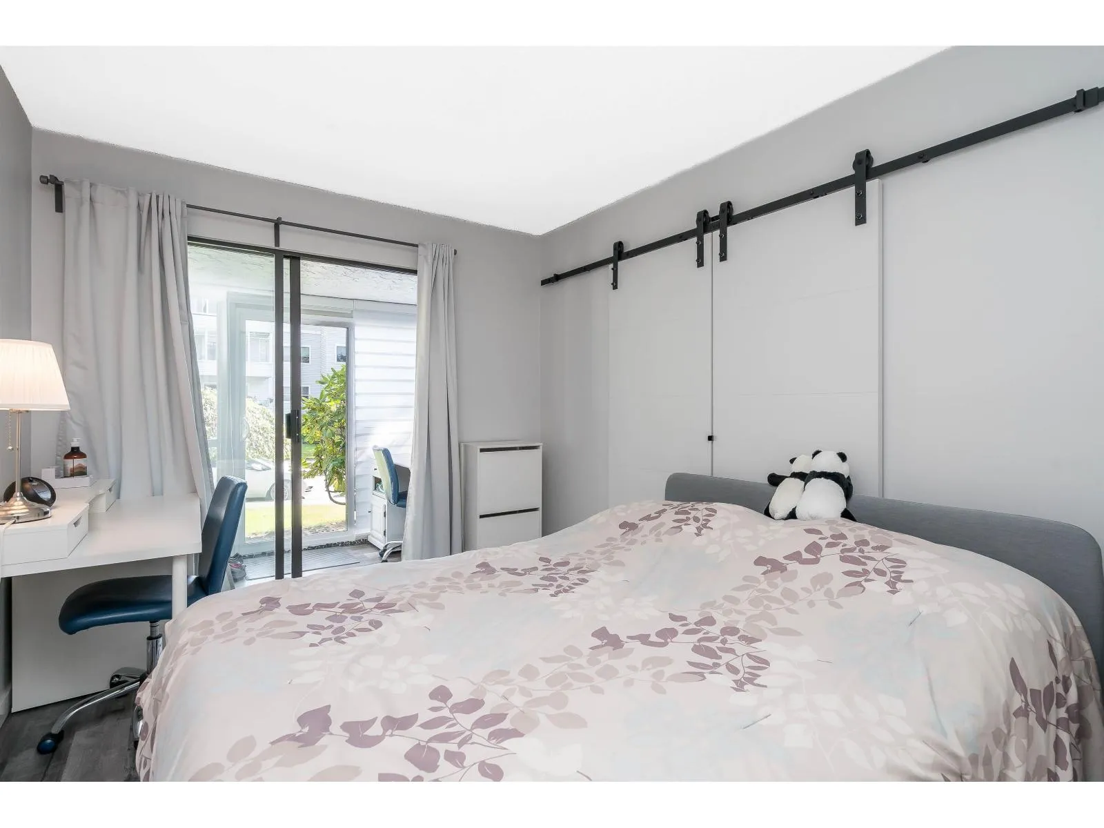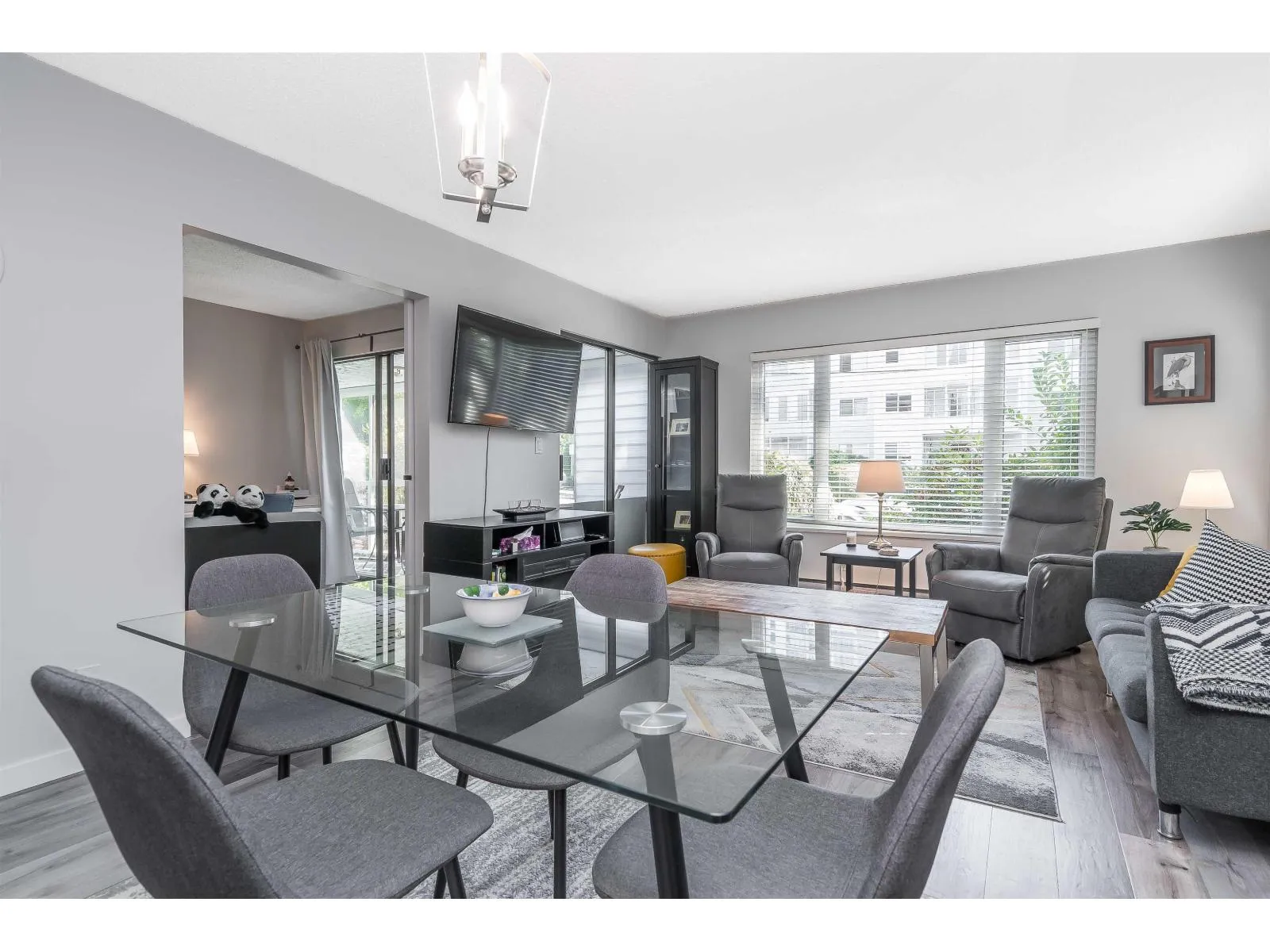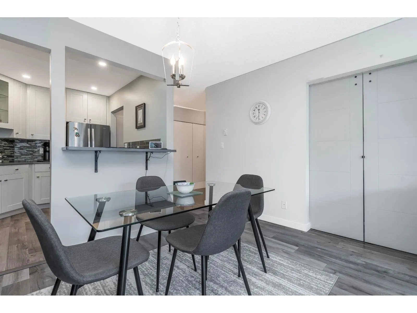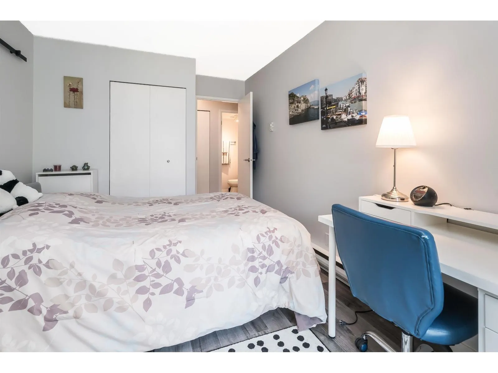 Summerhill. MOVE-IN READY! Furnished & beautifully updated 2 bed, 2 bath home in the heart of White Rock. Immaculate and well designed condo offers a modern kitchen with quartz countertops, white cabinetry, stainless steel appliances (new fridge) & double sinks. Designer colour scheme, stylish laminate flooring throughout with a bright spacious living room offering unique sliding barn doors leading into the 2nd bedroom. Primary bedroom has walk thru his/her closets & extra built in storages beside the bed. Enclosed sunroom (included in sq.ft.) with sliding glass doors & bonus storage! 1 parking stall & storage locker underground. Condo includes furniture. Centrally located within walking distance to White Rock town centre with its many shops & restaurants. 55+ age restriction & 1 cat ok. (id:27476)