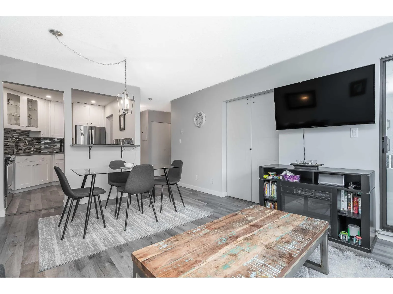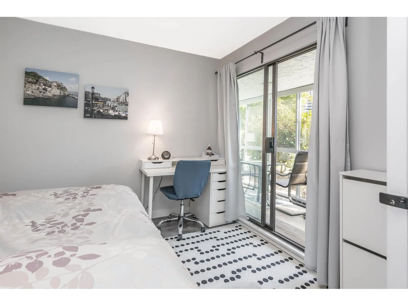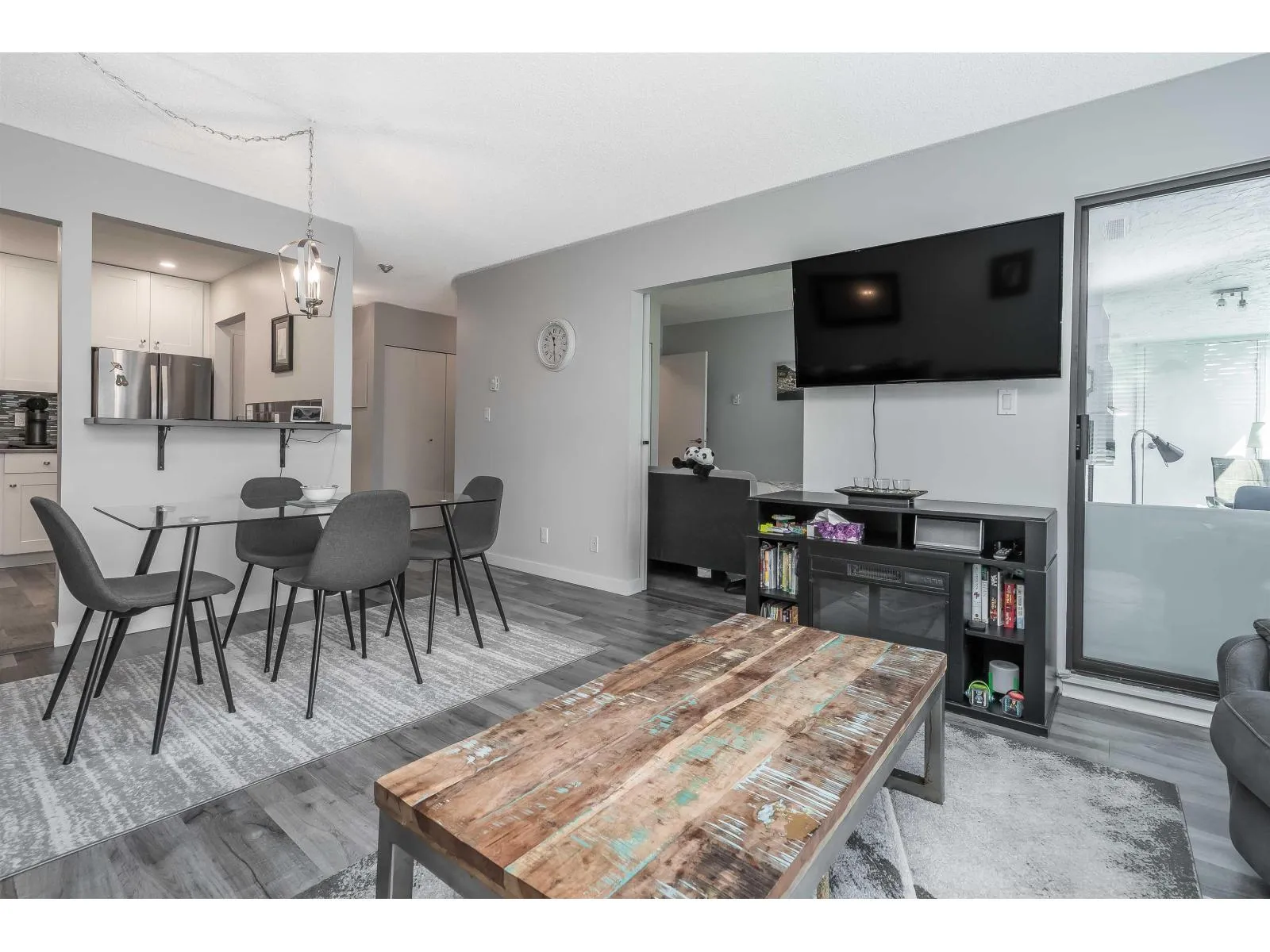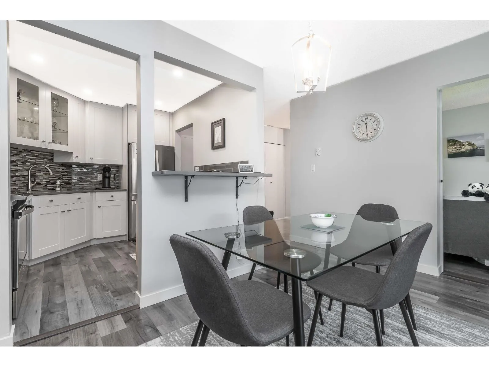 Summerhill. MOVE-IN READY! Furnished & beautifully updated 2 bed, 2 bath home in the heart of White Rock. Immaculate and well designed condo offers a modern kitchen with quartz countertops, white cabinetry, stainless steel appliances (new fridge) & double sinks. Designer colour scheme, stylish laminate flooring throughout with a bright spacious living room offering unique sliding barn doors leading into the 2nd bedroom. Primary bedroom has walk thru his/her closets & extra built in storages beside the bed. Enclosed sunroom (included in sq.ft.) with sliding glass doors & bonus storage! 1 parking stall & storage locker underground. Condo includes furniture. Centrally located within walking distance to White Rock town centre with its many shops & restaurants. 55+ age restriction & 1 cat ok. (id:27476)