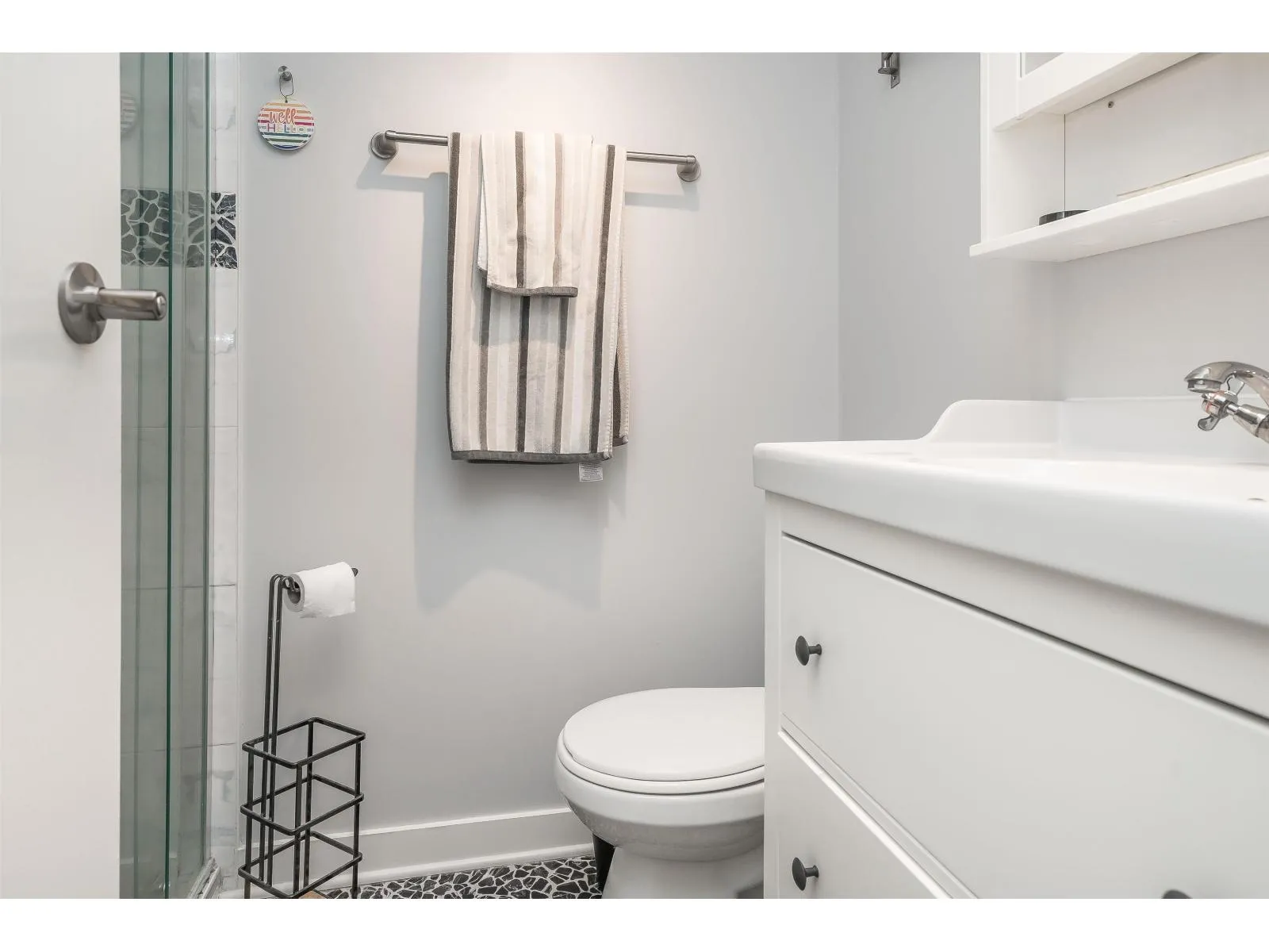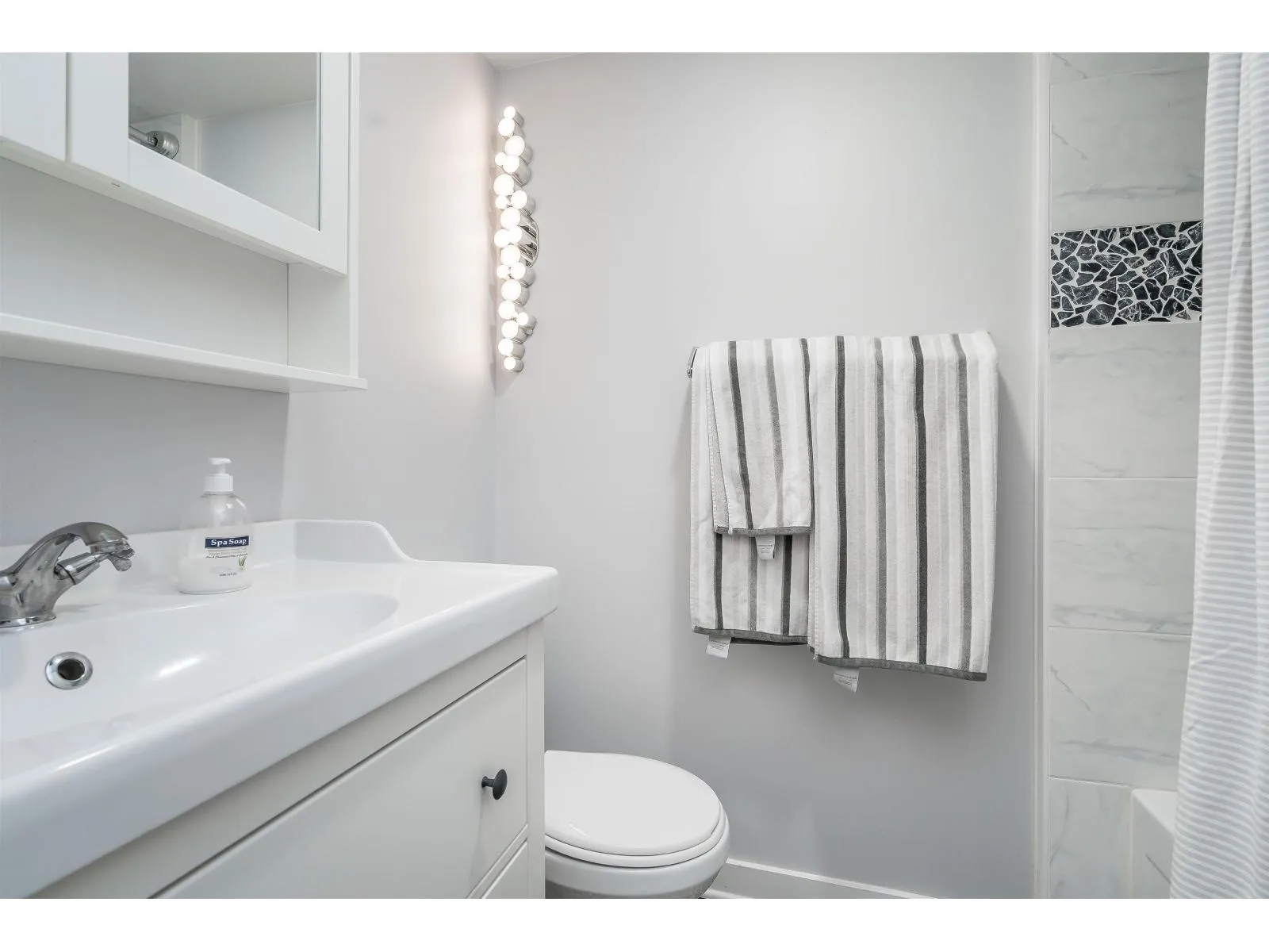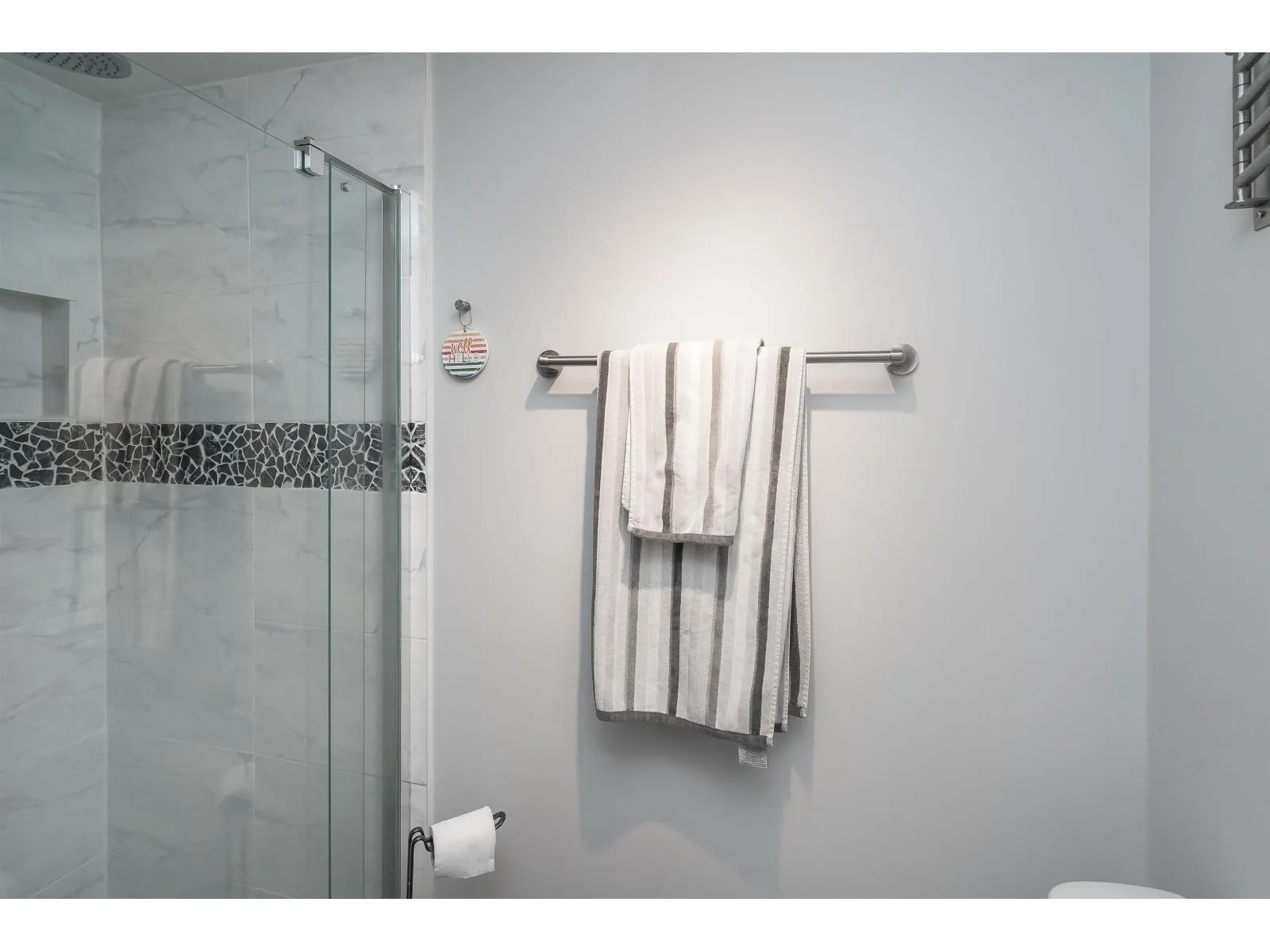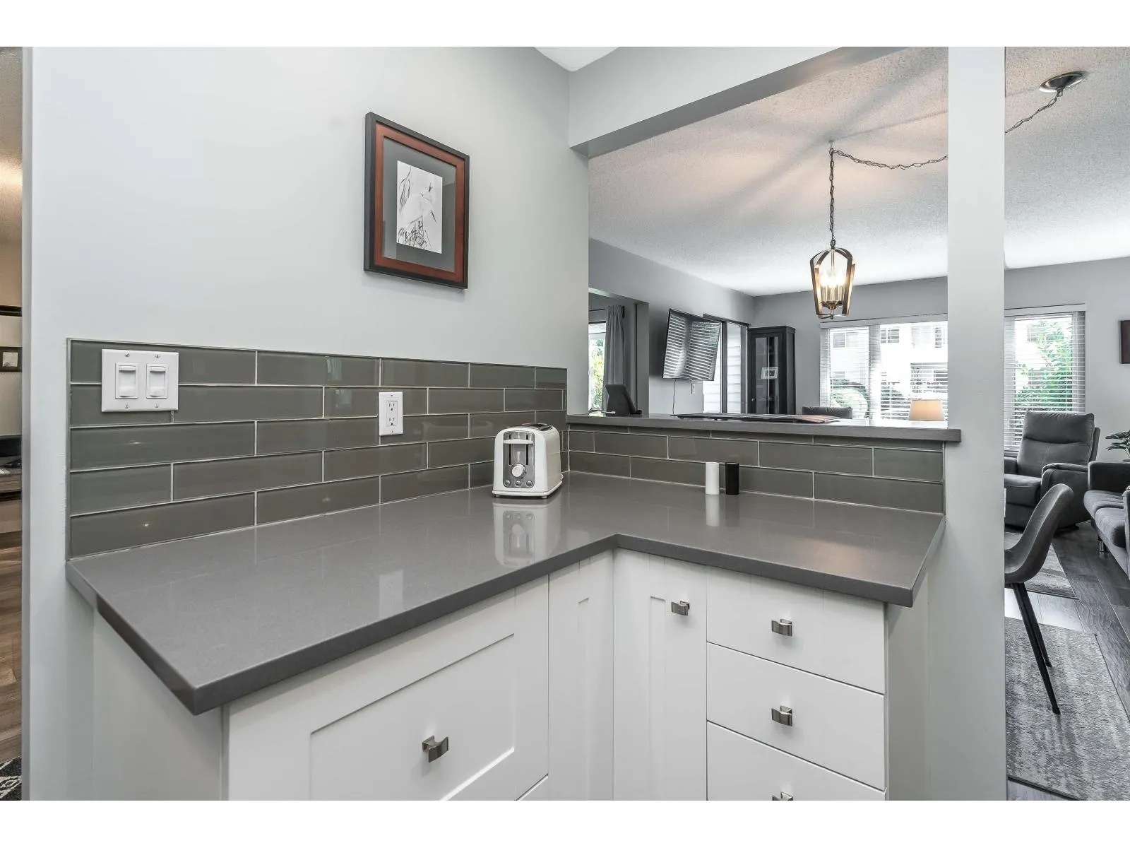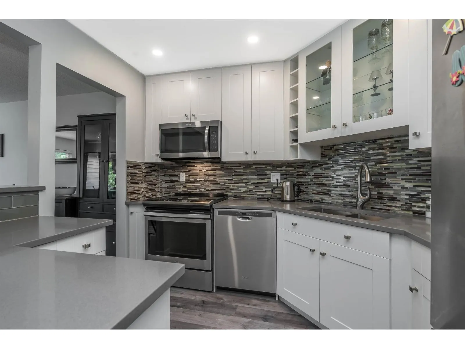 Summerhill. MOVE-IN READY! Furnished & beautifully updated 2 bed, 2 bath home in the heart of White Rock. Immaculate and well designed condo offers a modern kitchen with quartz countertops, white cabinetry, stainless steel appliances (new fridge) & double sinks. Designer colour scheme, stylish laminate flooring throughout with a bright spacious living room offering unique sliding barn doors leading into the 2nd bedroom. Primary bedroom has walk thru his/her closets & extra built in storages beside the bed. Enclosed sunroom (included in sq.ft.) with sliding glass doors & bonus storage! 1 parking stall & storage locker underground. Condo includes furniture. Centrally located within walking distance to White Rock town centre with its many shops & restaurants. 55+ age restriction & 1 cat ok. (id:27476)