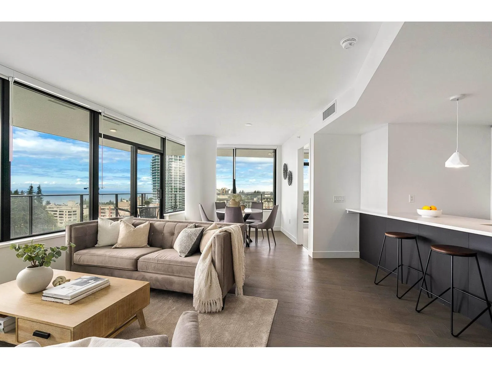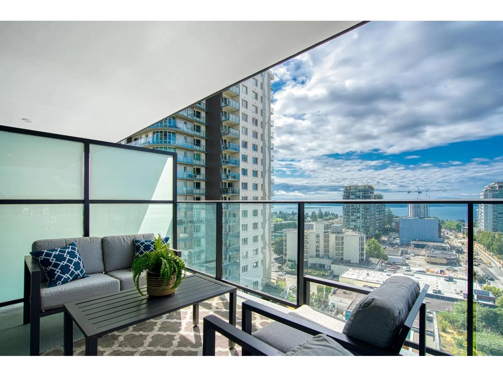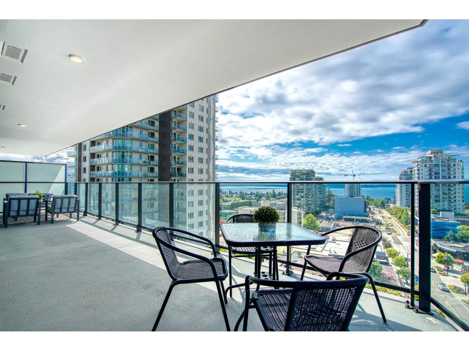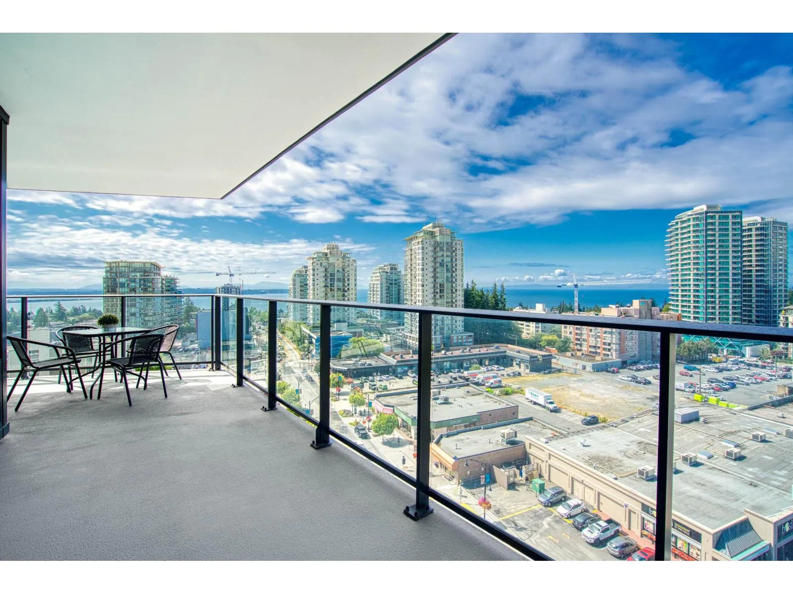 Brand new home exudes elegance and sophistication in the bustling heart of White Rock. This south- west corner 975 sf, 2 bdrm + den, 2 bath residence, with expansive 433 sf wrap-around balcony, boasts breathtaking 11th floor panoramic ocean and Gulf Island views. It showcases bright, open layouts, over-height ceilings, elegant finishes, air-conditioning and custom roller blinds. The modern kitchen features sleek, soft-close cabinetry, panelled Bosch stainless steel appliance package and a polished quartz, waterfall edge island, complemented by a contemporary color scheme and warm under-cabinet lighting. King-sized master bedroom has ensuite with quartz countertops, dual sinks and Grohe plumbing fixtures. Includes gas hook-up for BBQ, an EV-ready parking stall and storage locker. (id:27476)