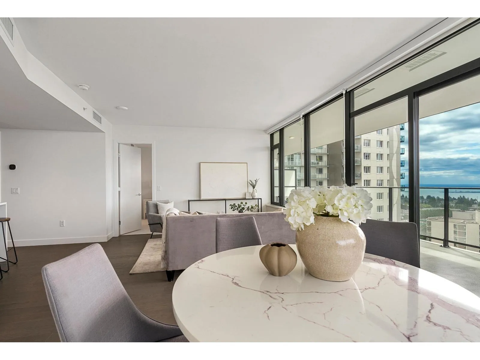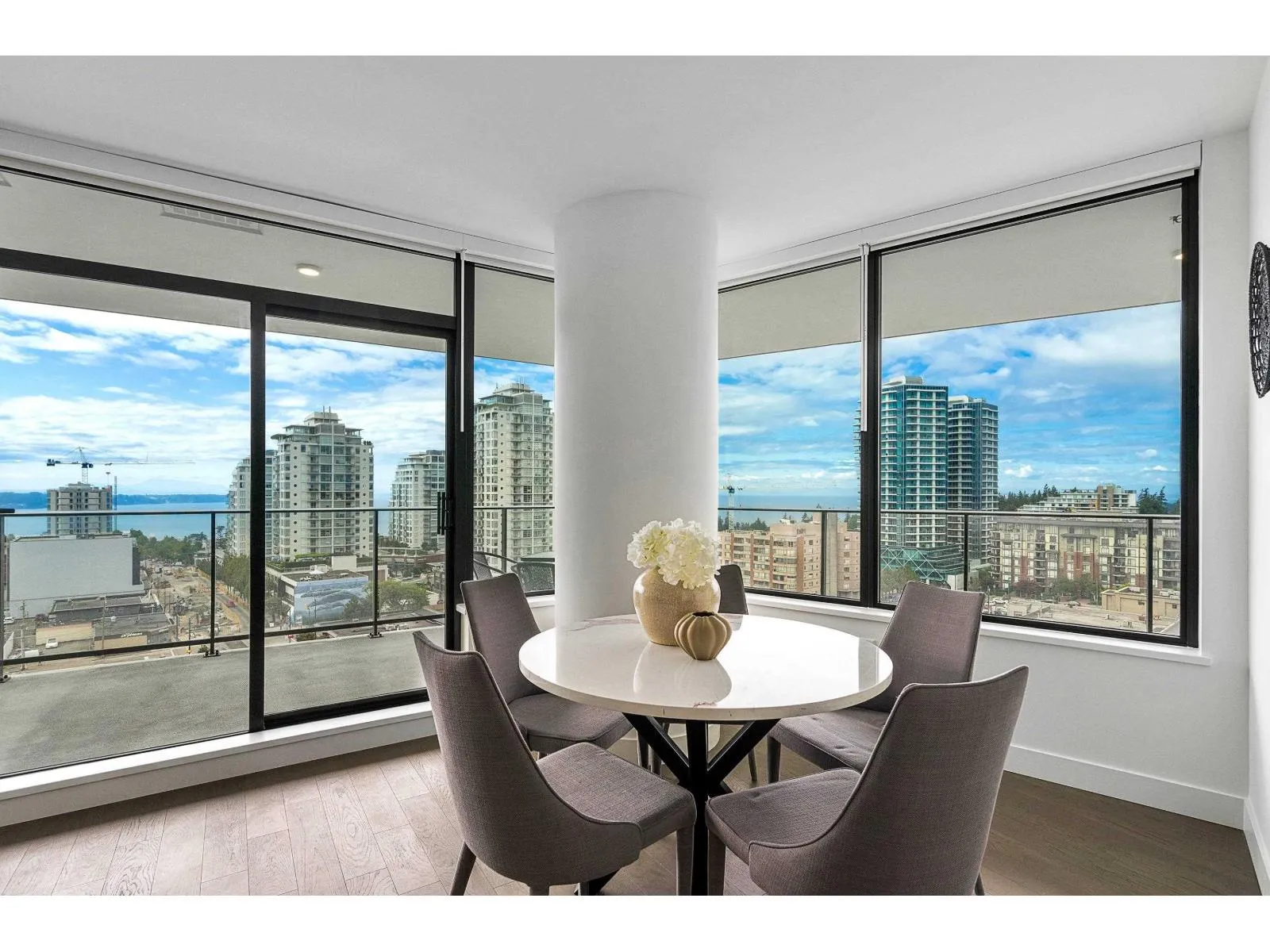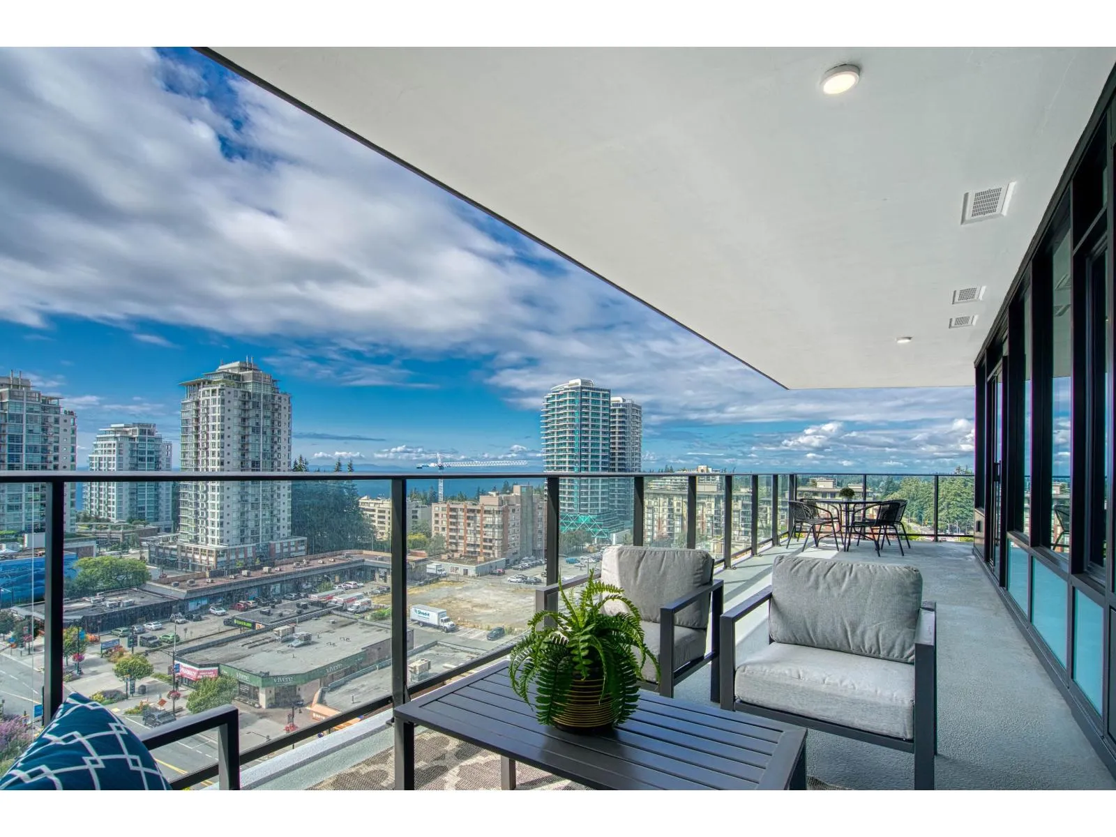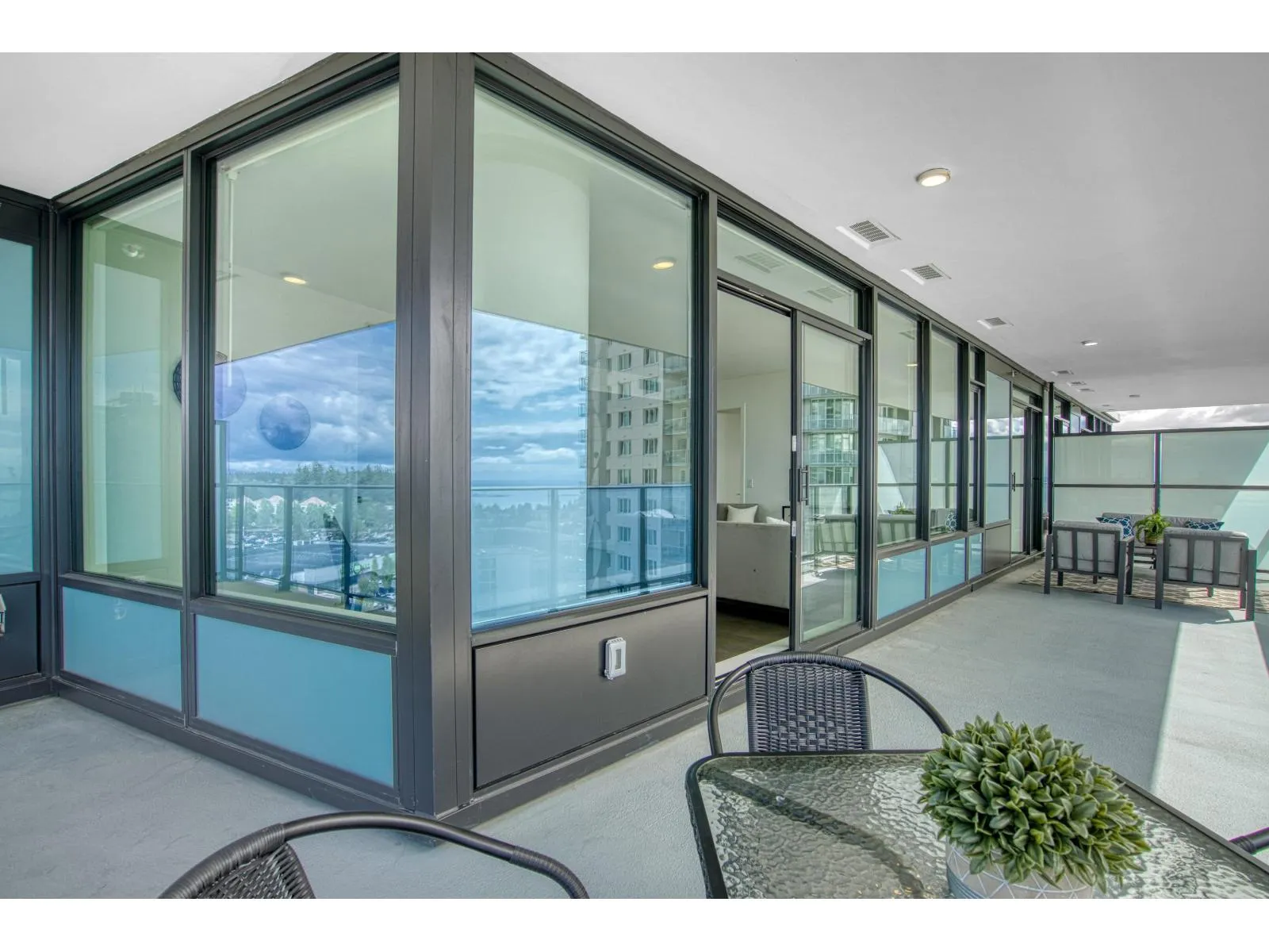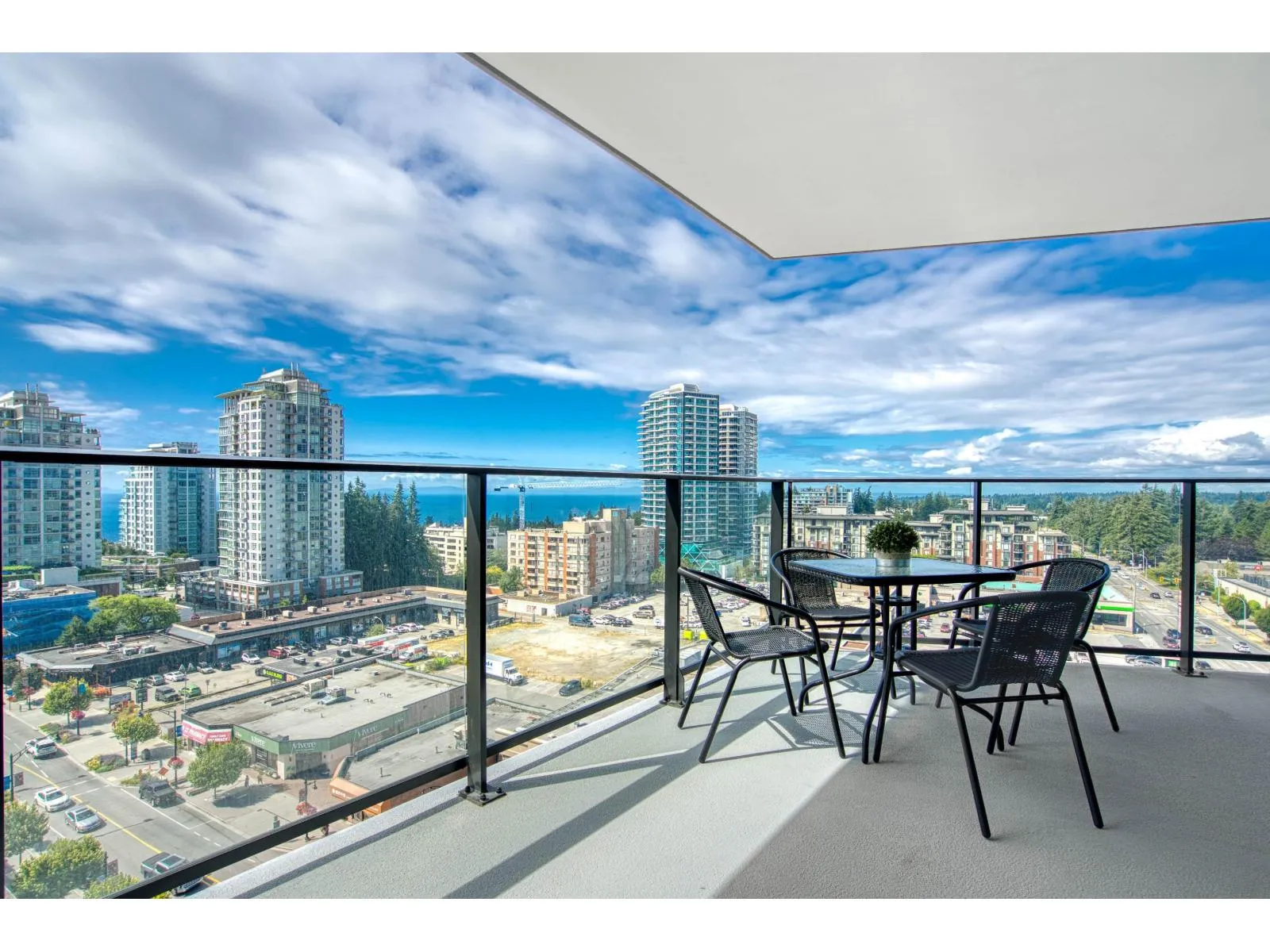 Brand new home exudes elegance and sophistication in the bustling heart of White Rock. This south- west corner 975 sf, 2 bdrm + den, 2 bath residence, with expansive 433 sf wrap-around balcony, boasts breathtaking 11th floor panoramic ocean and Gulf Island views. It showcases bright, open layouts, over-height ceilings, elegant finishes, air-conditioning and custom roller blinds. The modern kitchen features sleek, soft-close cabinetry, panelled Bosch stainless steel appliance package and a polished quartz, waterfall edge island, complemented by a contemporary color scheme and warm under-cabinet lighting. King-sized master bedroom has ensuite with quartz countertops, dual sinks and Grohe plumbing fixtures. Includes gas hook-up for BBQ, an EV-ready parking stall and storage locker. (id:27476)
