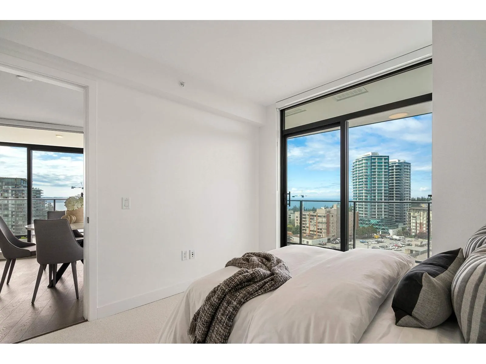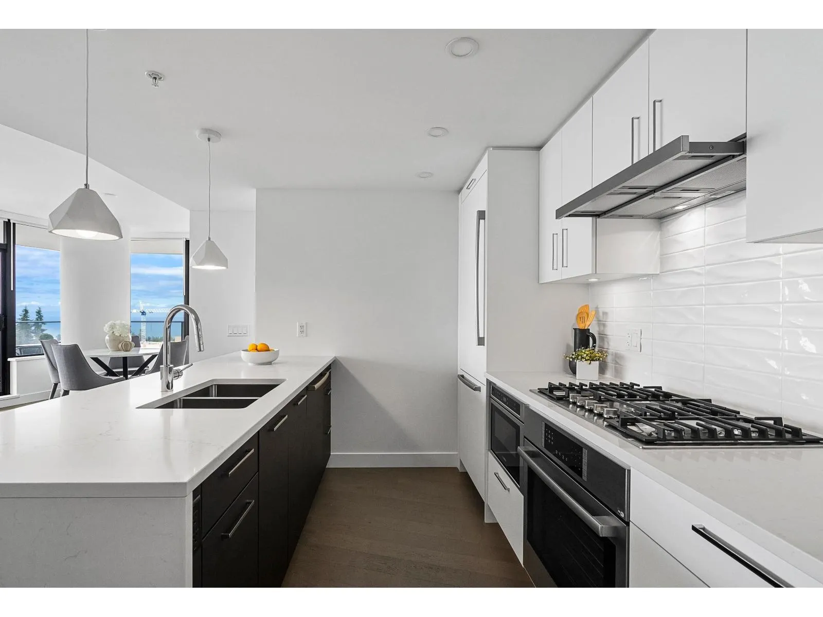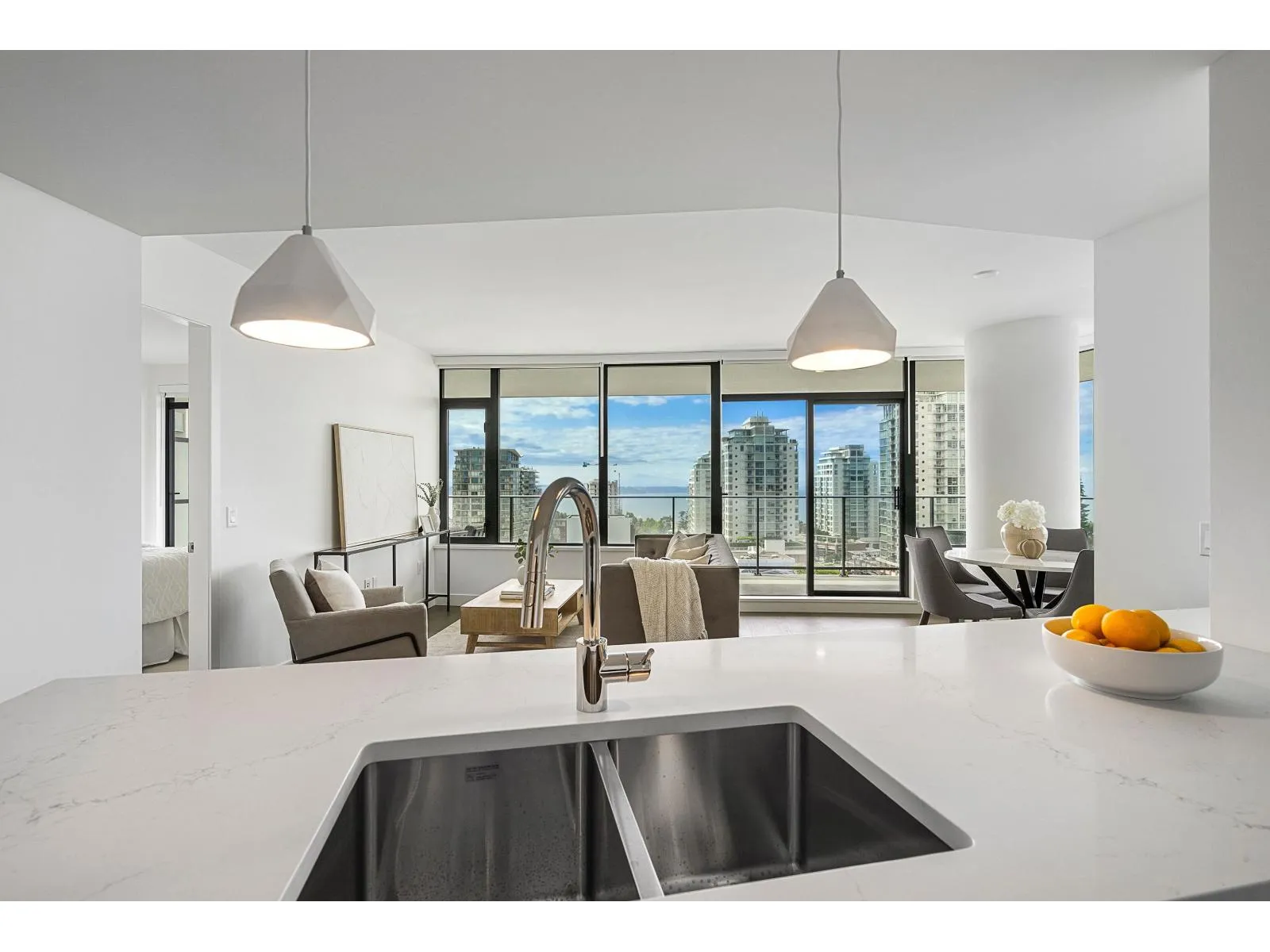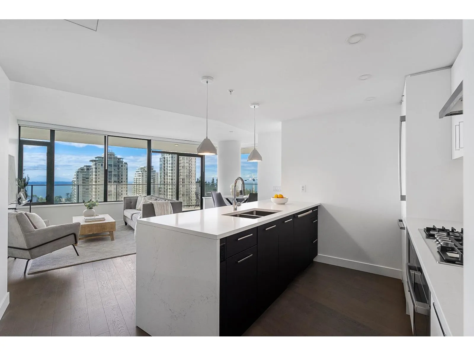 Brand new home exudes elegance and sophistication in the bustling heart of White Rock. This south- west corner 975 sf, 2 bdrm + den, 2 bath residence, with expansive 433 sf wrap-around balcony, boasts breathtaking 11th floor panoramic ocean and Gulf Island views. It showcases bright, open layouts, over-height ceilings, elegant finishes, air-conditioning and custom roller blinds. The modern kitchen features sleek, soft-close cabinetry, panelled Bosch stainless steel appliance package and a polished quartz, waterfall edge island, complemented by a contemporary color scheme and warm under-cabinet lighting. King-sized master bedroom has ensuite with quartz countertops, dual sinks and Grohe plumbing fixtures. Includes gas hook-up for BBQ, an EV-ready parking stall and storage locker. (id:27476)