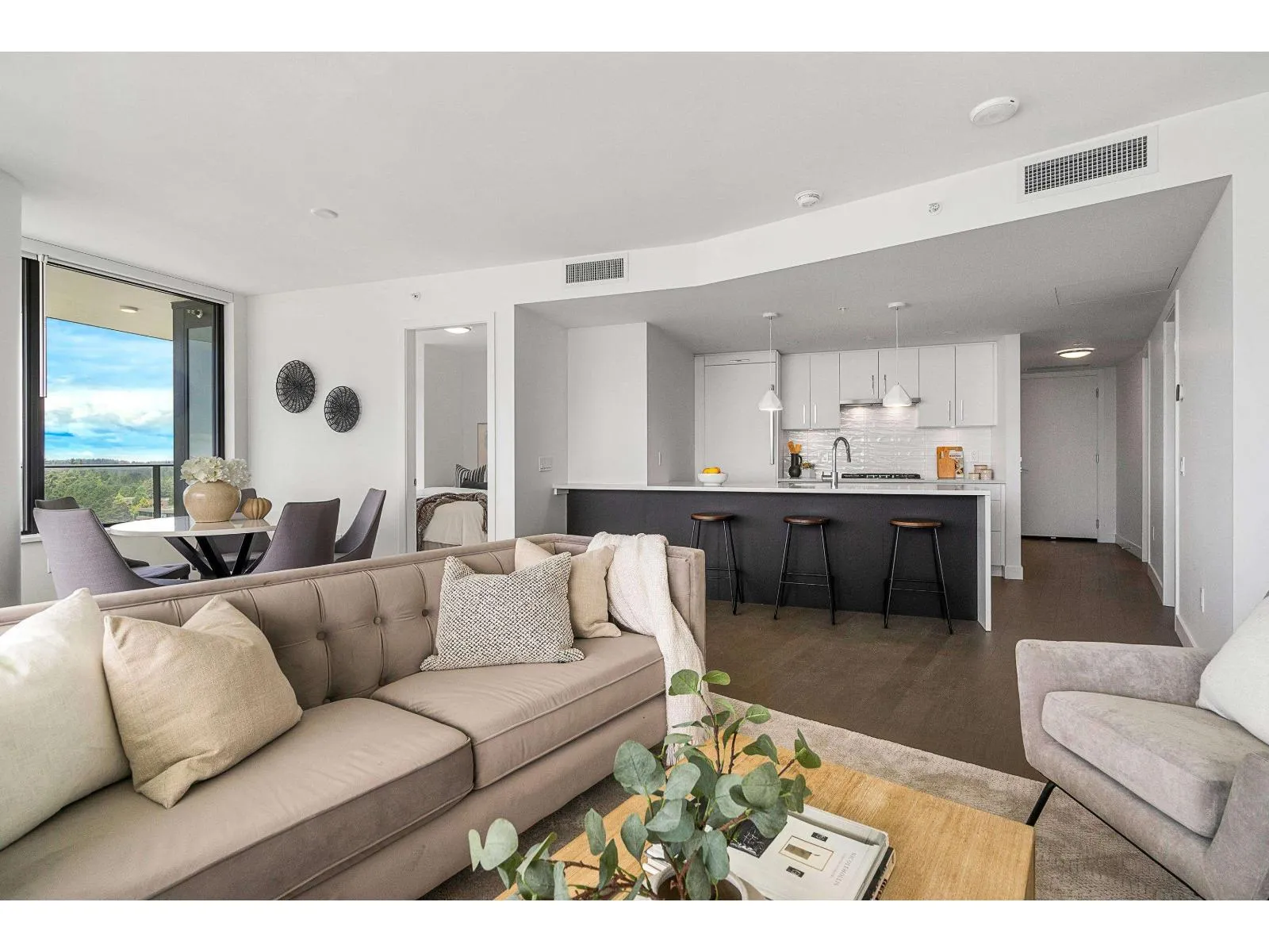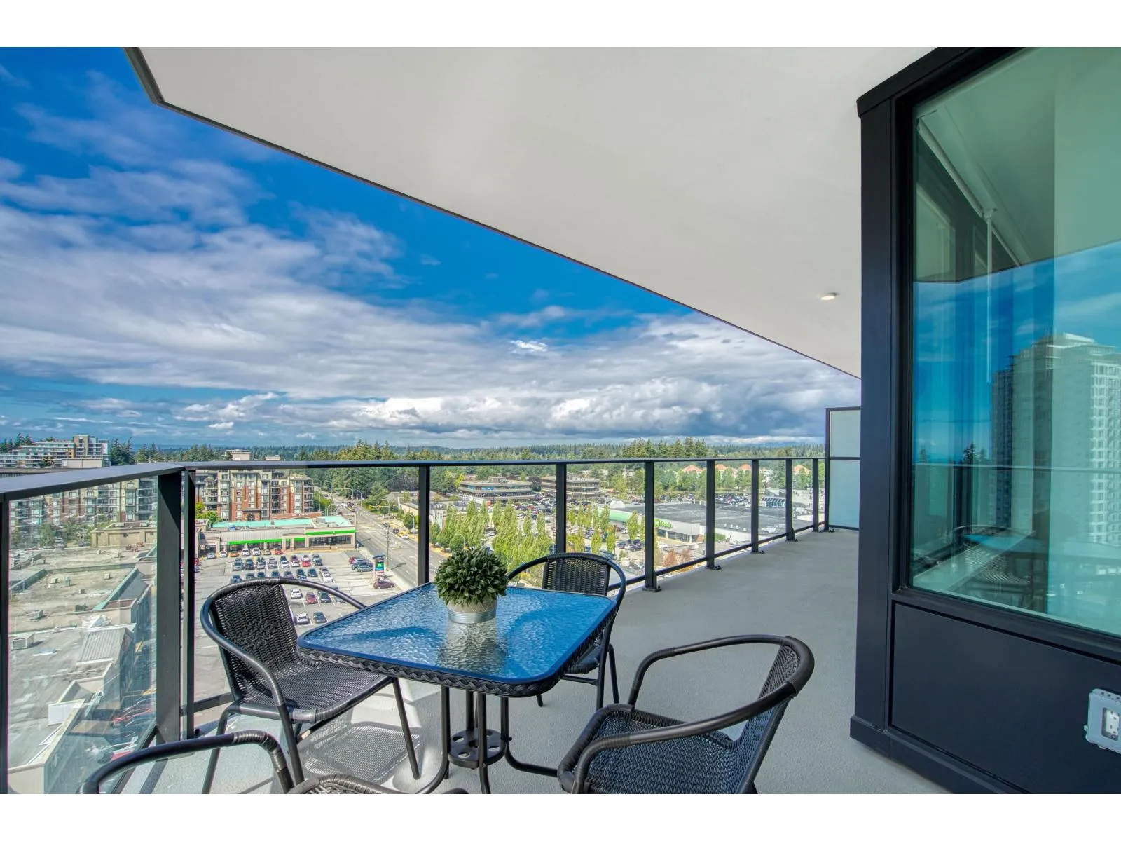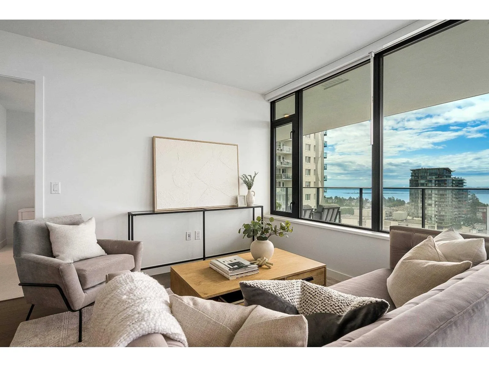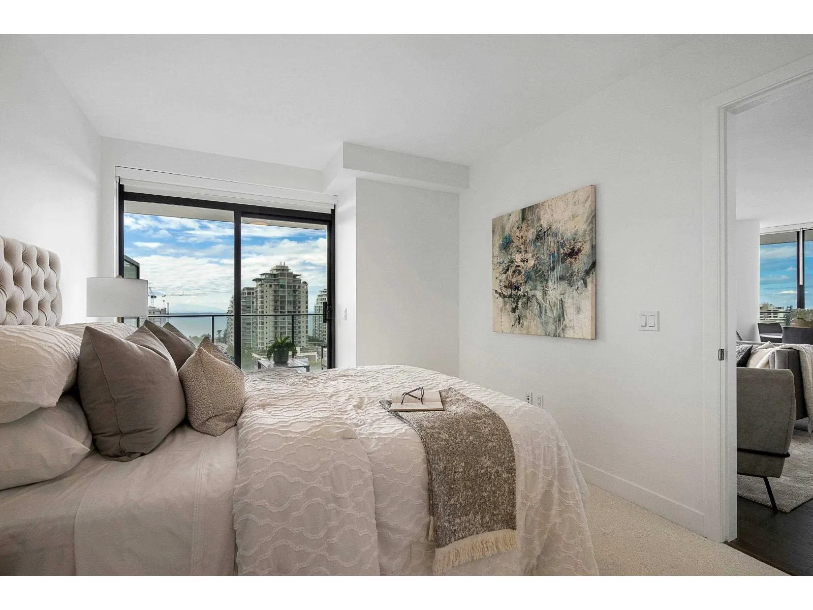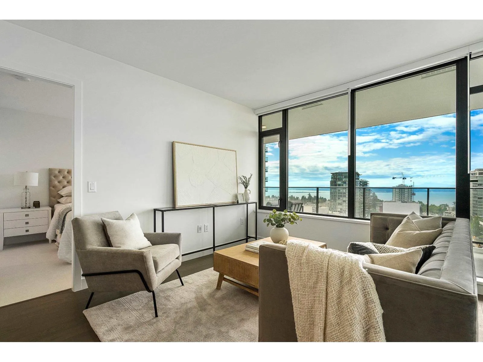Brand new home exudes elegance and sophistication in the bustling heart of White Rock. This south- west corner 975 sf, 2 bdrm + den, 2 bath residence, with expansive 433 sf wrap-around balcony, boasts breathtaking 11th floor panoramic ocean and Gulf Island views. It showcases bright, open layouts, over-height ceilings, elegant finishes, air-conditioning and custom roller blinds. The modern kitchen features sleek, soft-close cabinetry, panelled Bosch stainless steel appliance package and a polished quartz, waterfall edge island, complemented by a contemporary color scheme and warm under-cabinet lighting. King-sized master bedroom has ensuite with quartz countertops, dual sinks and Grohe plumbing fixtures. Includes gas hook-up for BBQ, an EV-ready parking stall and storage locker. (id:27476)