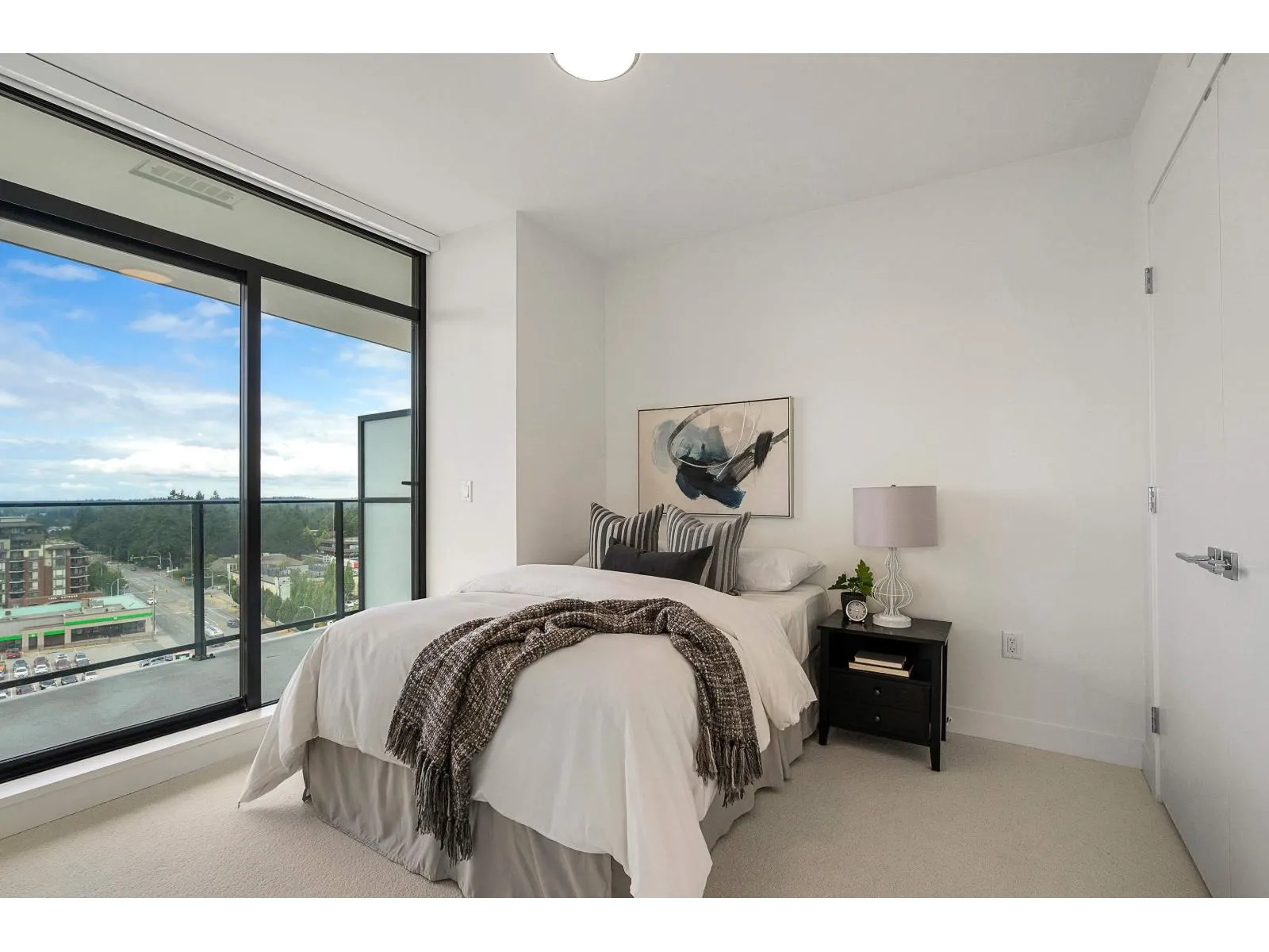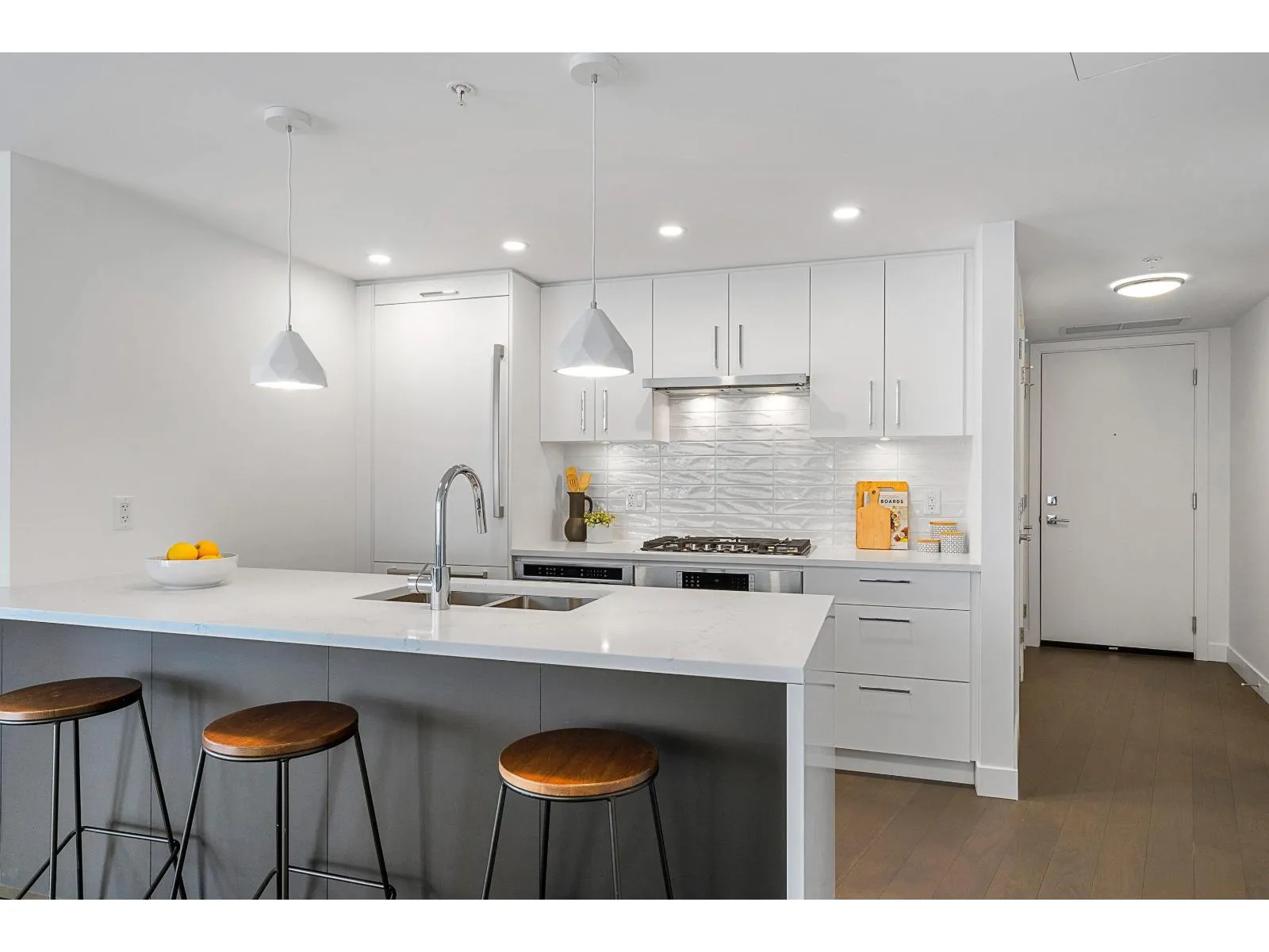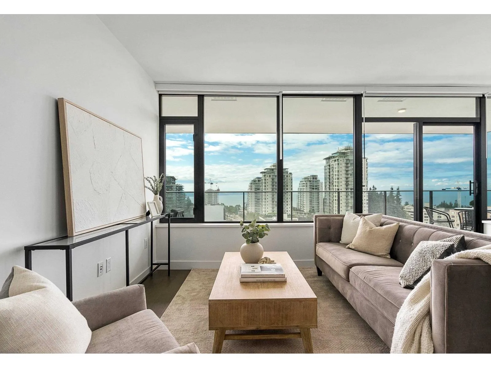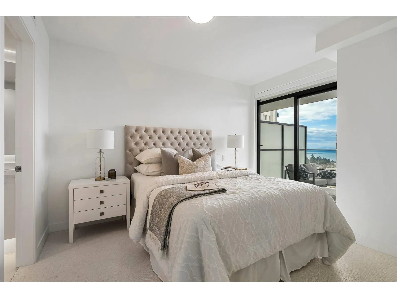 Brand new home exudes elegance and sophistication in the bustling heart of White Rock. This south- west corner 975 sf, 2 bdrm + den, 2 bath residence, with expansive 433 sf wrap-around balcony, boasts breathtaking 11th floor panoramic ocean and Gulf Island views. It showcases bright, open layouts, over-height ceilings, elegant finishes, air-conditioning and custom roller blinds. The modern kitchen features sleek, soft-close cabinetry, panelled Bosch stainless steel appliance package and a polished quartz, waterfall edge island, complemented by a contemporary color scheme and warm under-cabinet lighting. King-sized master bedroom has ensuite with quartz countertops, dual sinks and Grohe plumbing fixtures. Includes gas hook-up for BBQ, an EV-ready parking stall and storage locker. (id:27476)