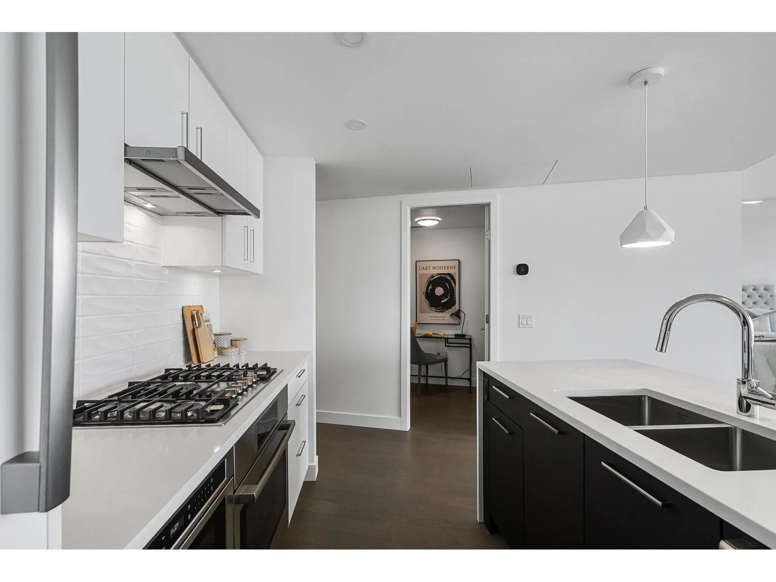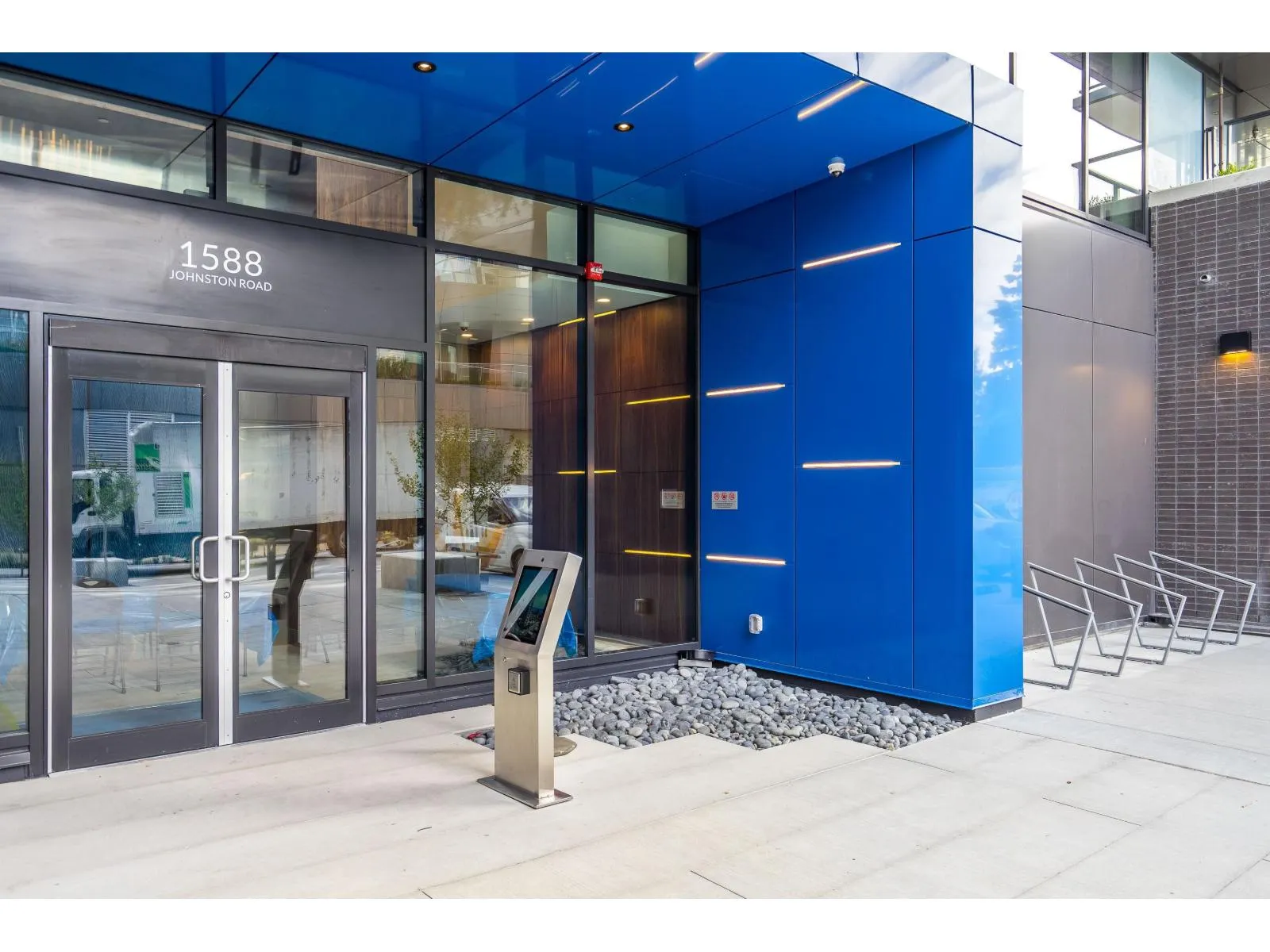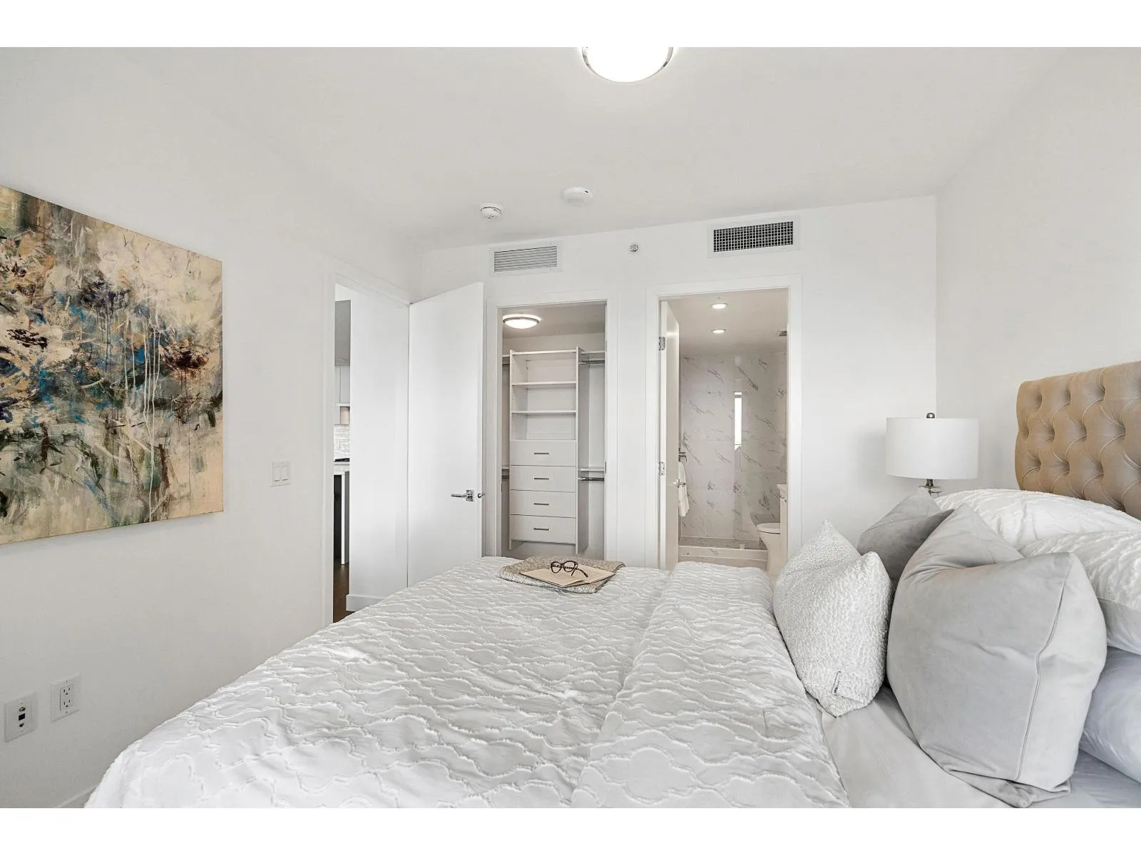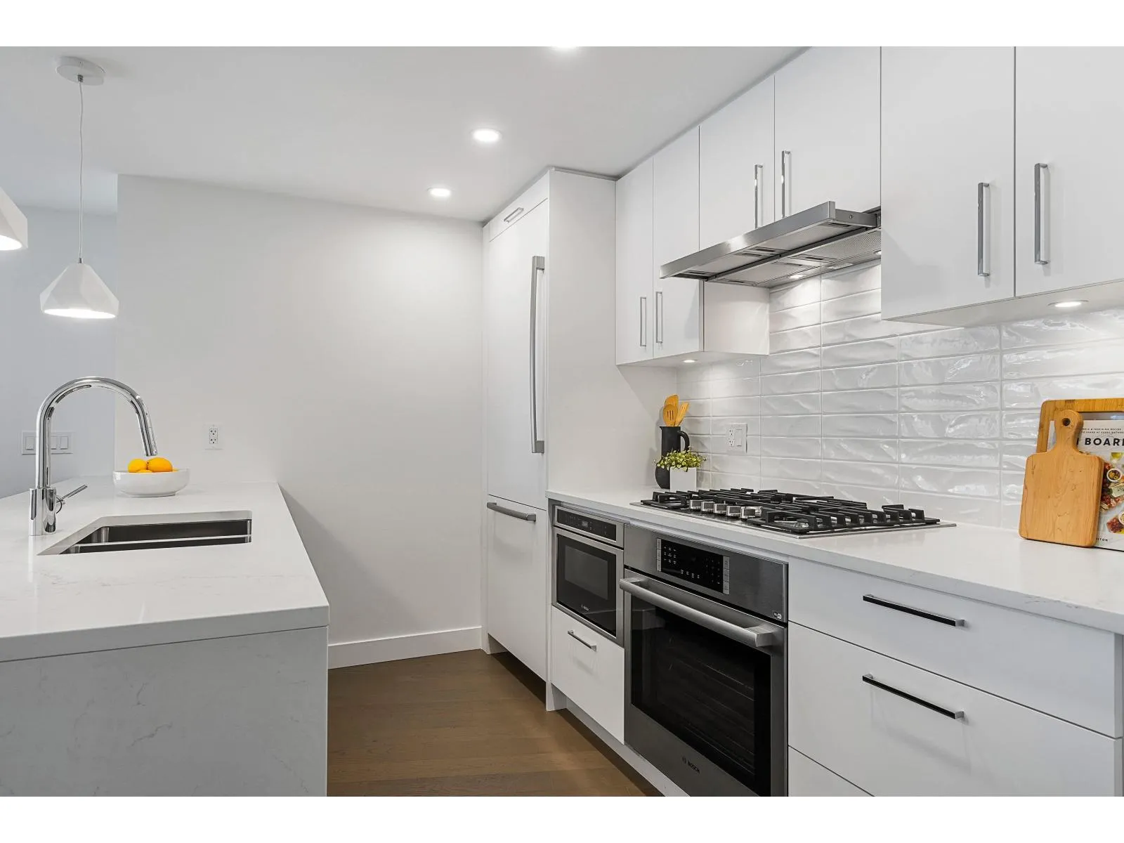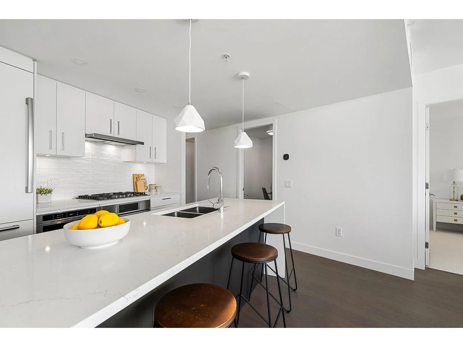 Brand new home exudes elegance and sophistication in the bustling heart of White Rock. This south- west corner 975 sf, 2 bdrm + den, 2 bath residence, with expansive 433 sf wrap-around balcony, boasts breathtaking 11th floor panoramic ocean and Gulf Island views. It showcases bright, open layouts, over-height ceilings, elegant finishes, air-conditioning and custom roller blinds. The modern kitchen features sleek, soft-close cabinetry, panelled Bosch stainless steel appliance package and a polished quartz, waterfall edge island, complemented by a contemporary color scheme and warm under-cabinet lighting. King-sized master bedroom has ensuite with quartz countertops, dual sinks and Grohe plumbing fixtures. Includes gas hook-up for BBQ, an EV-ready parking stall and storage locker. (id:27476)