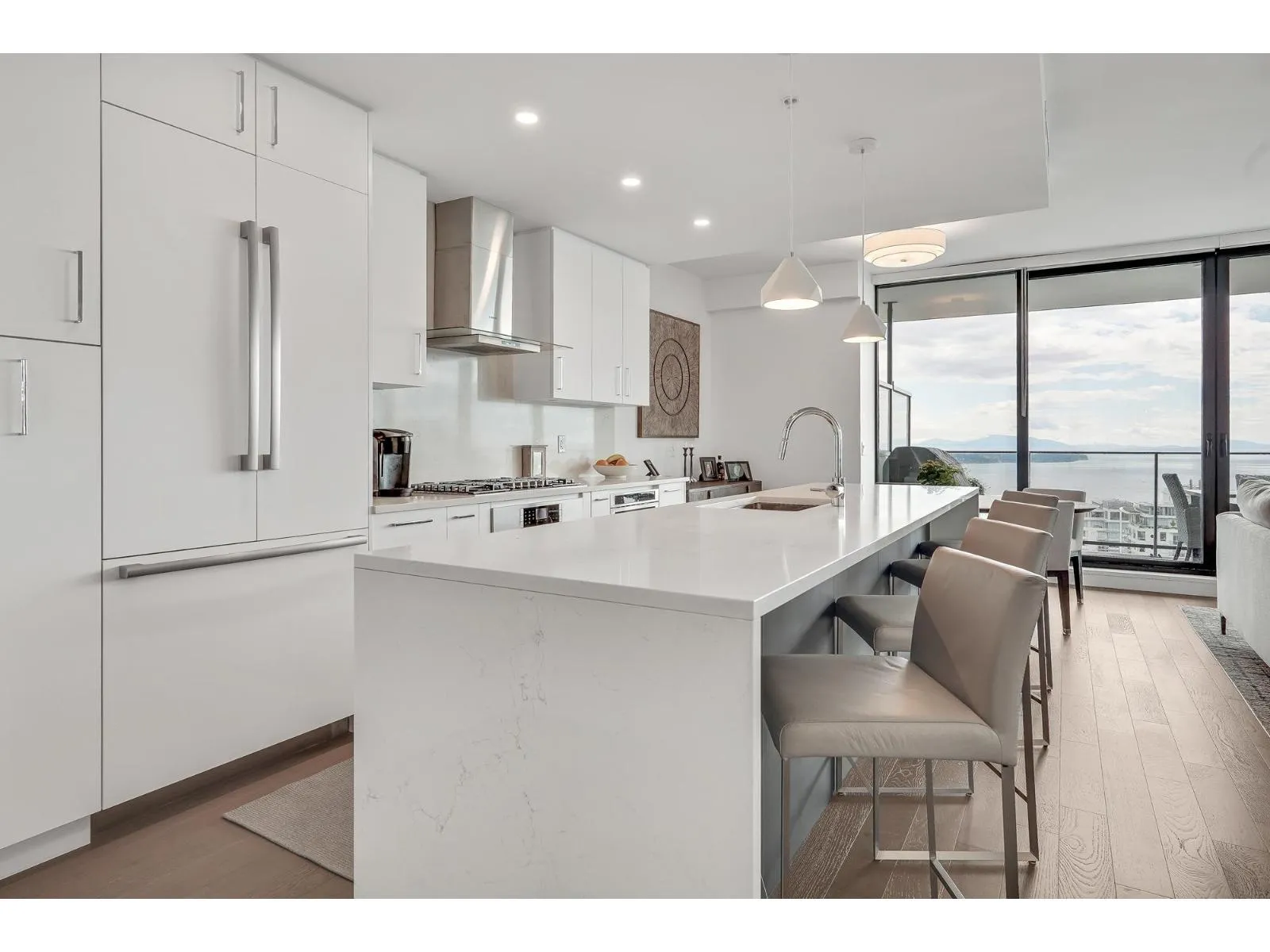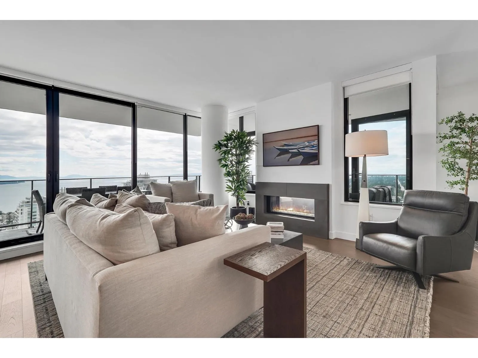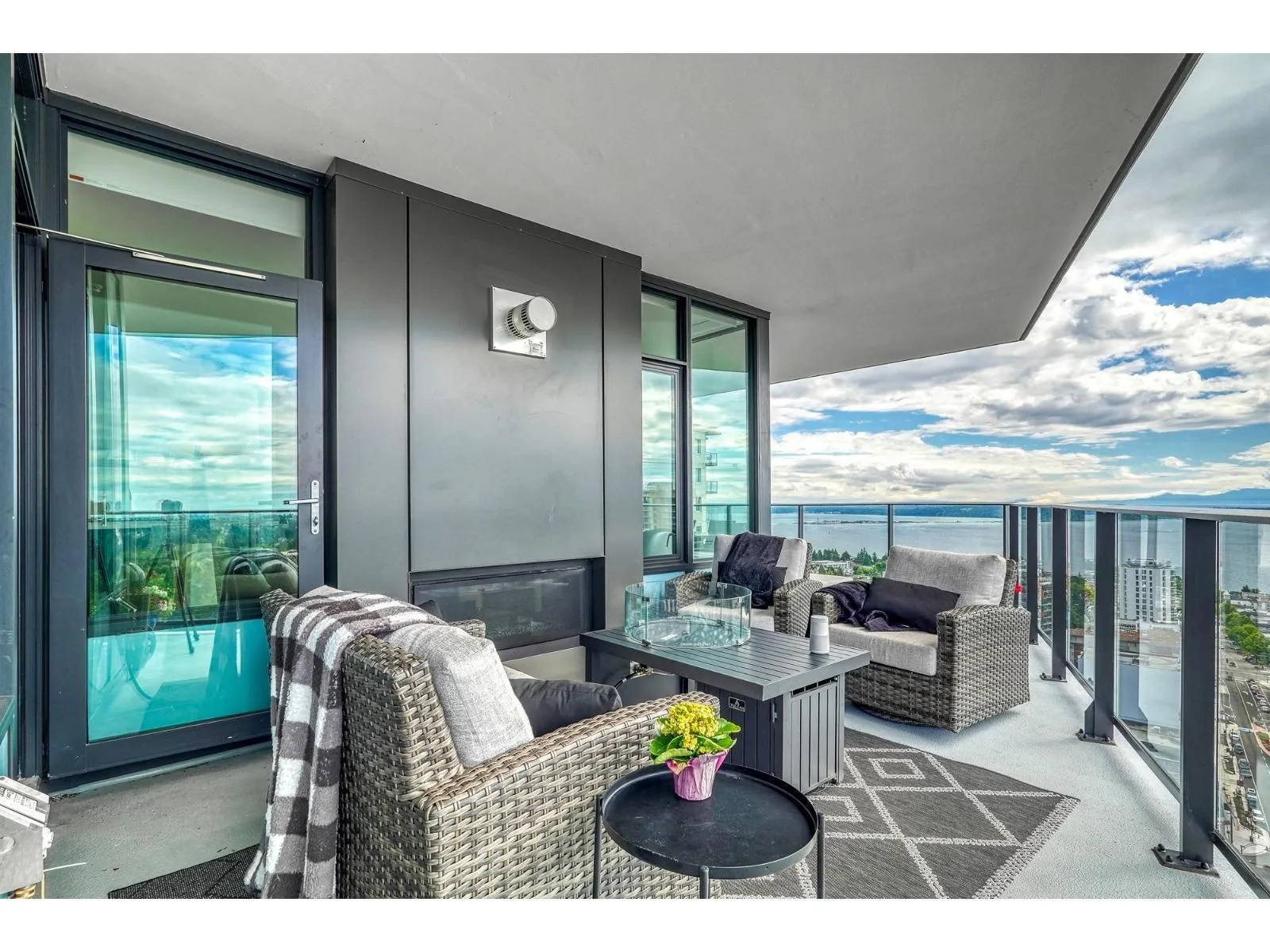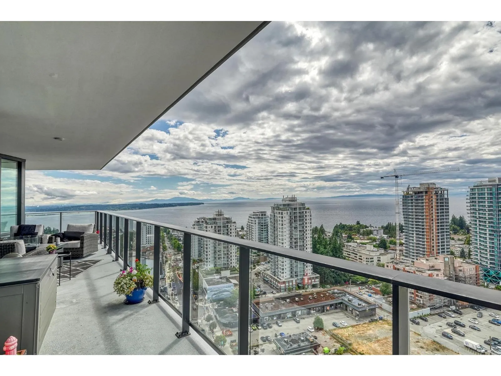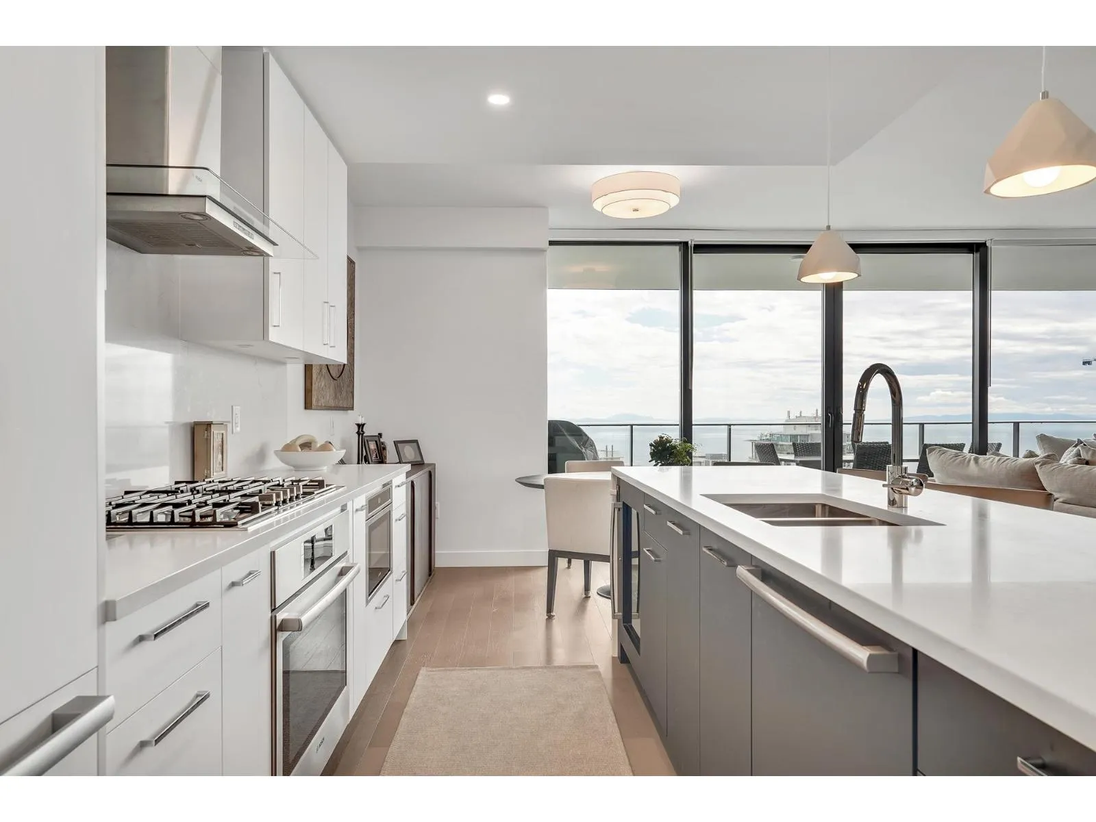 Exquisite Southwest - facing residence with panoramic ocean & mountain vistas. The Gourmet kitchen features quartz surfaces & premium Bosch appliances. 1428 Sq ft of sophisticated living with 2 generously sized bedrooms, each with ensuites, plus elegant powder room. Indoor-outdoor fireplace enhances seamless entertaining from the 549 Sq ft wrap around deck with stunning views. Comfort is elevated with climate-controlled air throughout, 3 rare side-by-side parking stalls with EV charging and resort-style amenities complete this premier White Rock offering. Walk to beaches, pier, groceries, restaurants and cafes - only 40 minutes to Vancouver. Experience unparalleled coastal luxury at its finest. (id:27476)