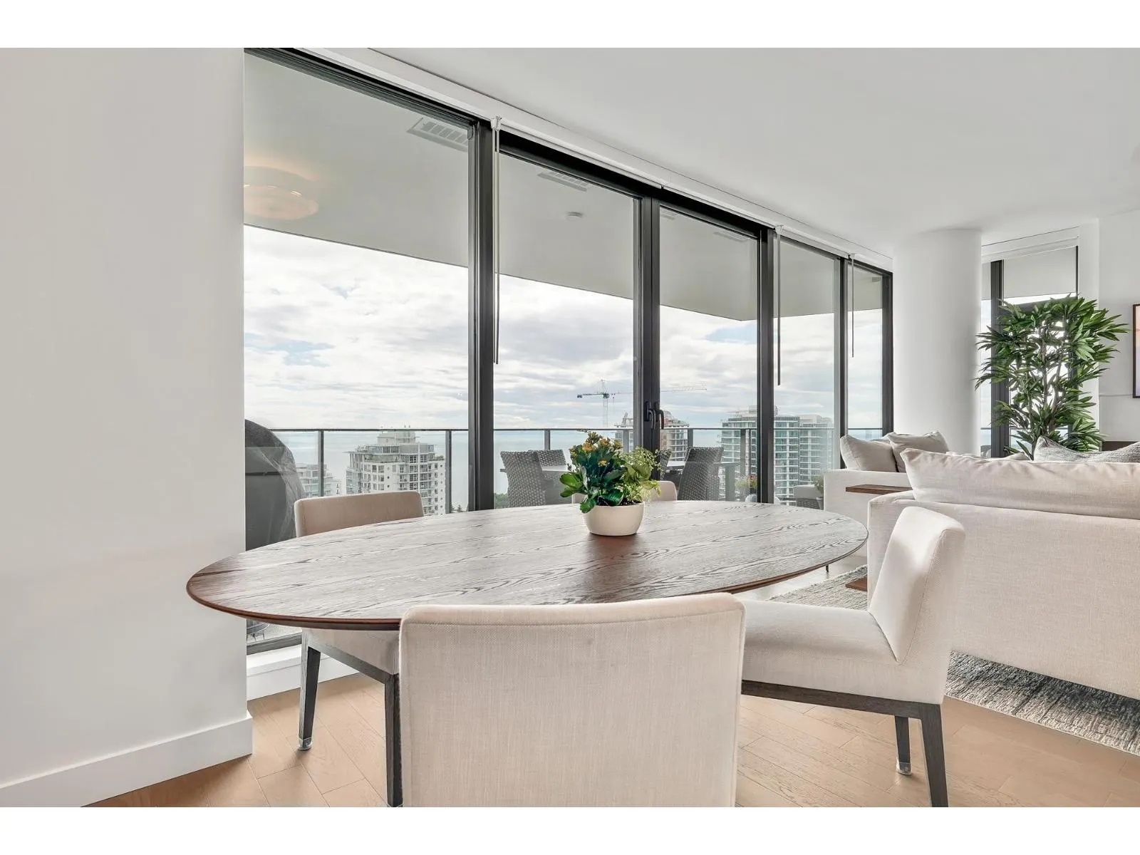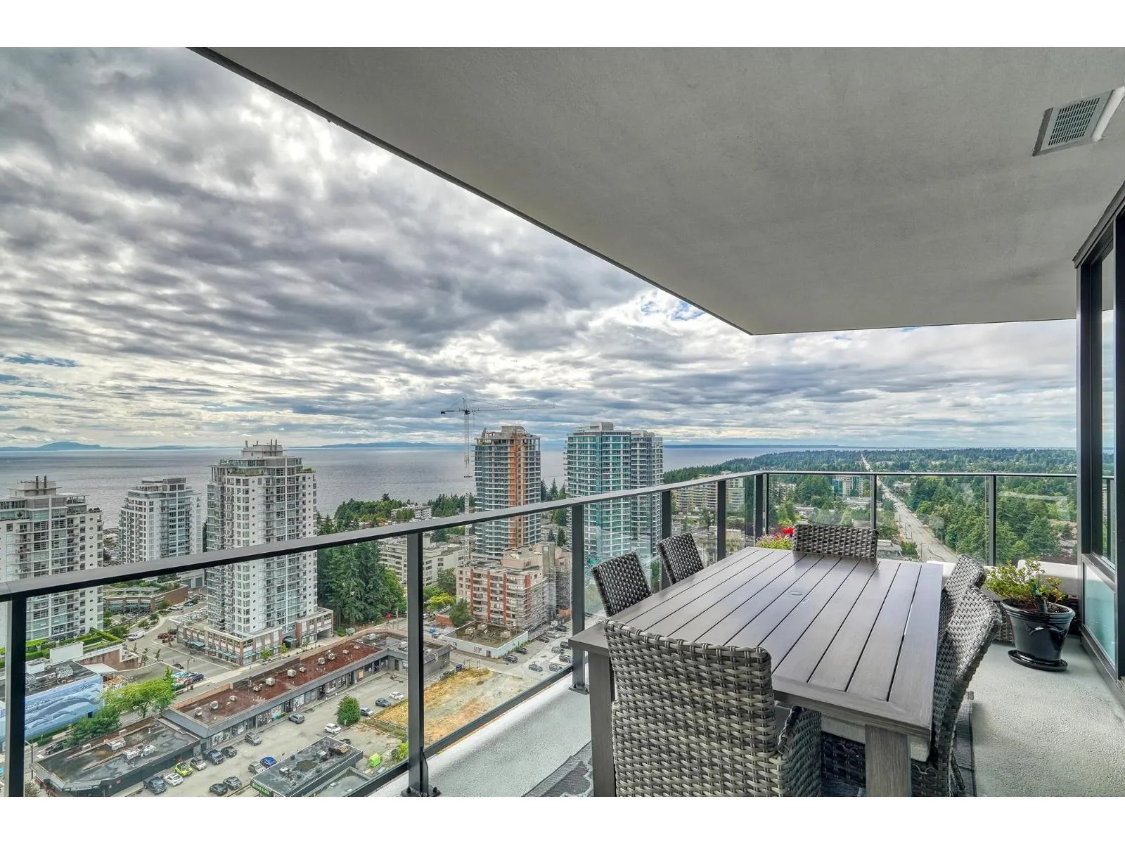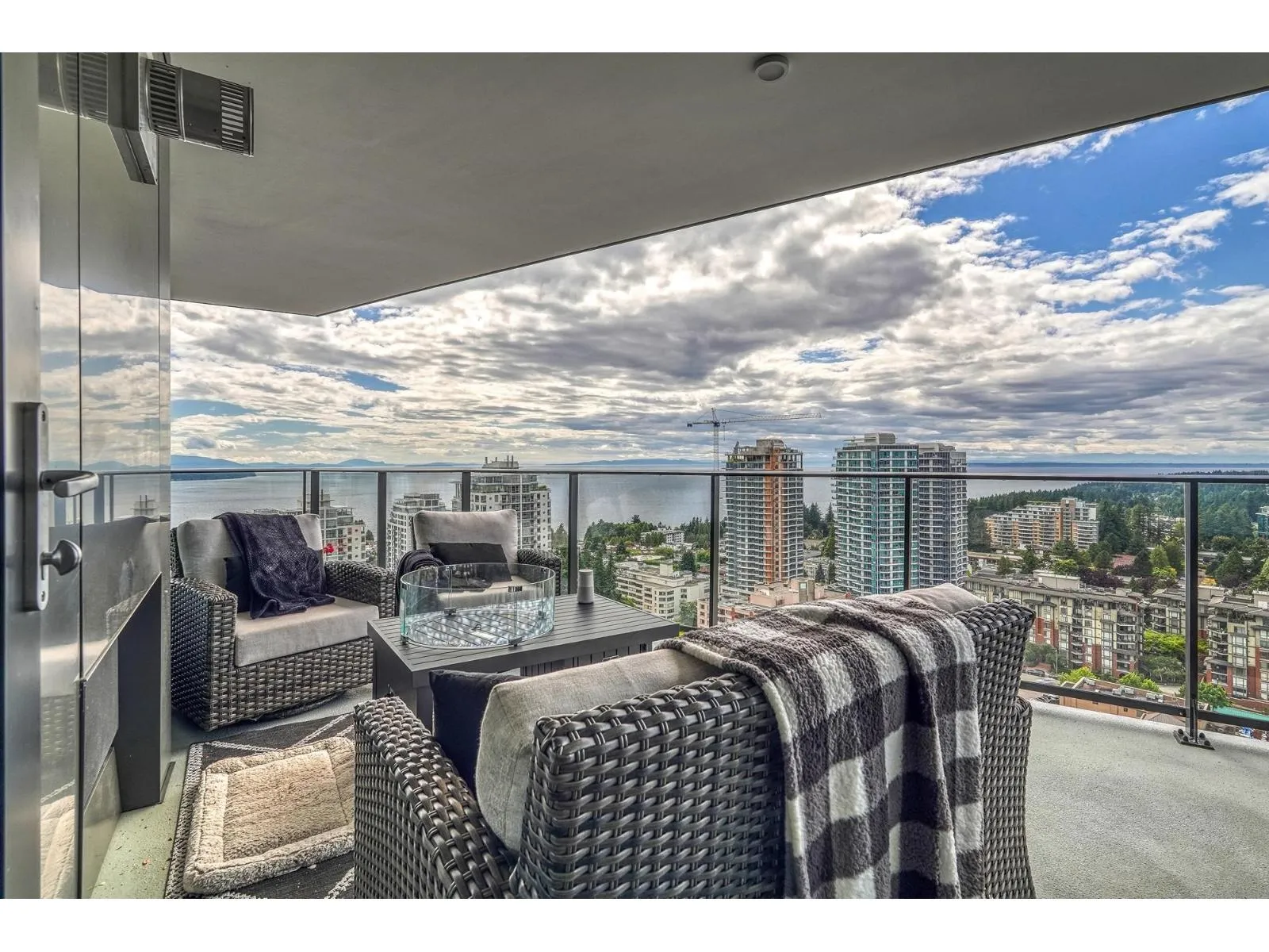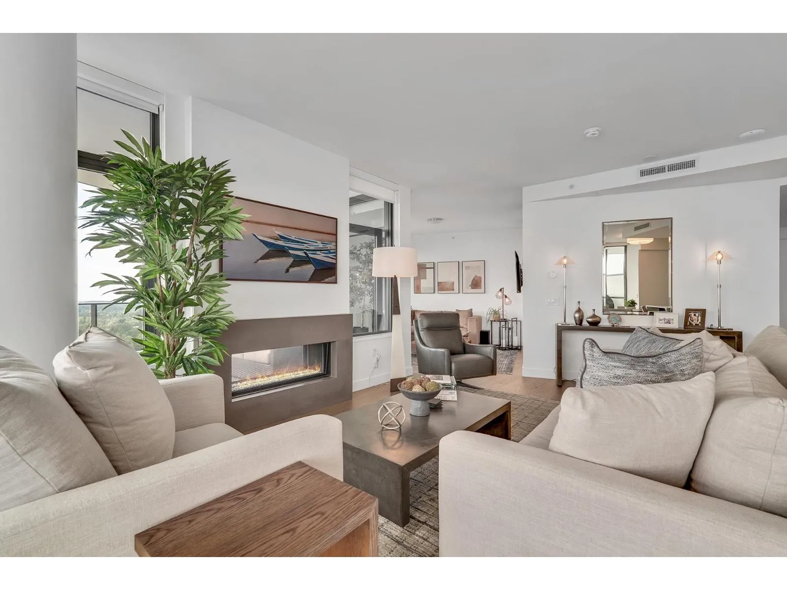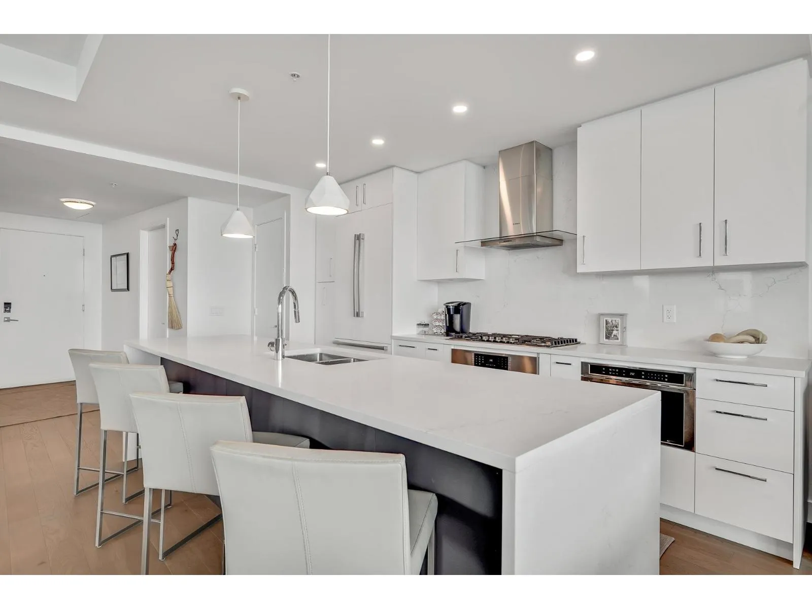 Exquisite Southwest - facing residence with panoramic ocean & mountain vistas. The Gourmet kitchen features quartz surfaces & premium Bosch appliances. 1428 Sq ft of sophisticated living with 2 generously sized bedrooms, each with ensuites, plus elegant powder room. Indoor-outdoor fireplace enhances seamless entertaining from the 549 Sq ft wrap around deck with stunning views. Comfort is elevated with climate-controlled air throughout, 3 rare side-by-side parking stalls with EV charging and resort-style amenities complete this premier White Rock offering. Walk to beaches, pier, groceries, restaurants and cafes - only 40 minutes to Vancouver. Experience unparalleled coastal luxury at its finest. (id:27476)