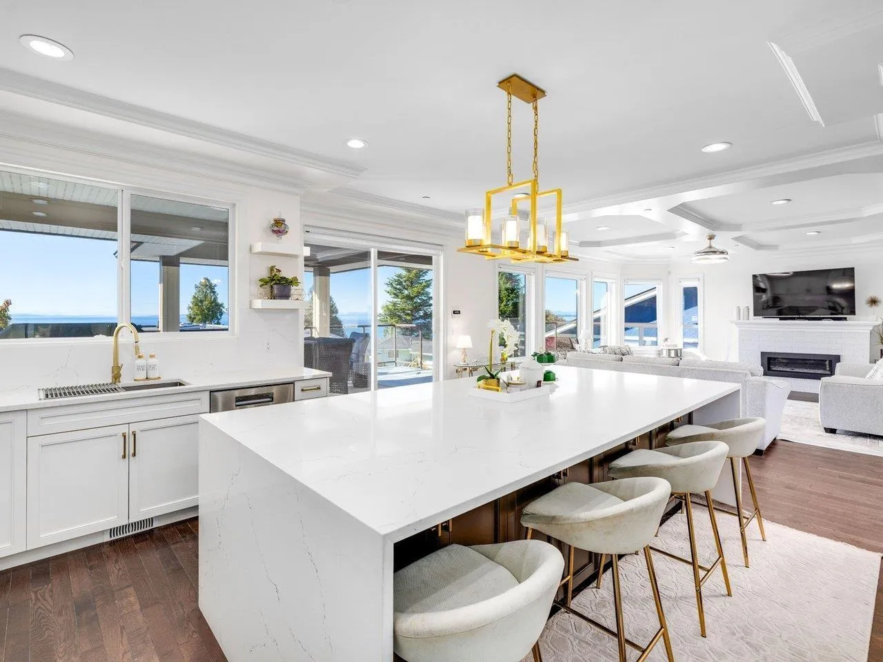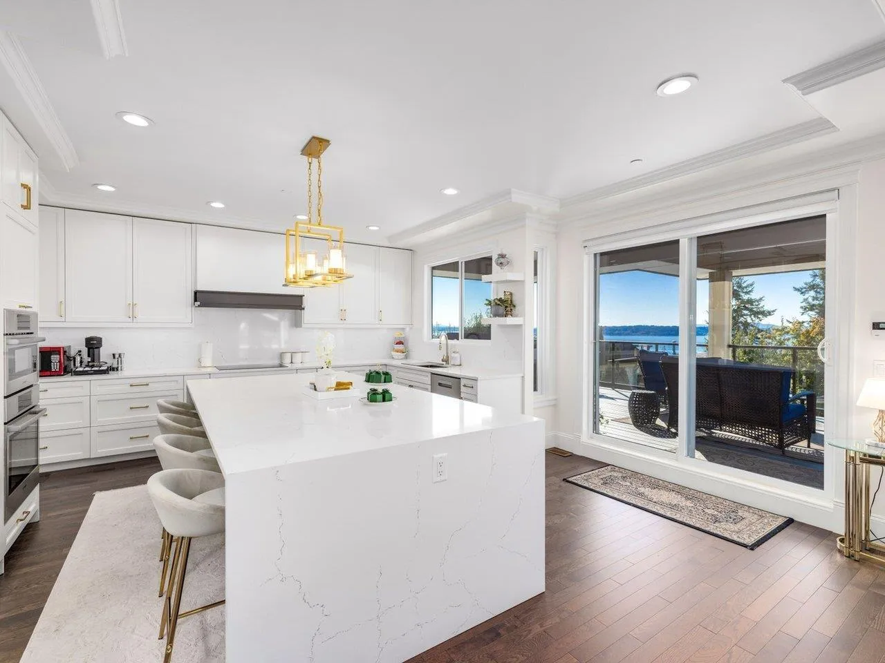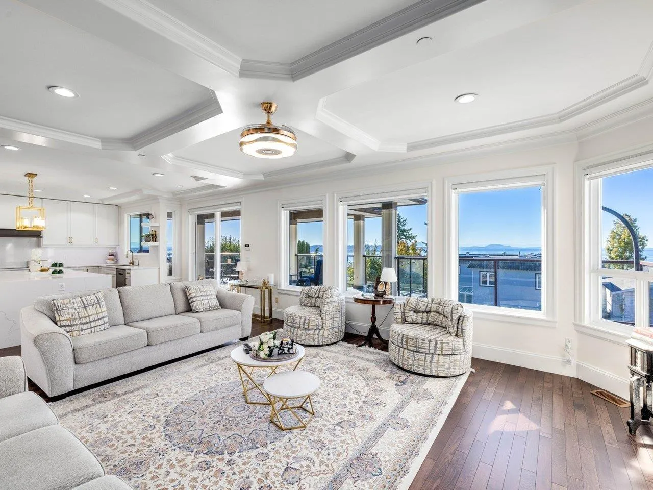 Panoramic Ocean View Home in Prime White Rock Location! Situated on a large 50' lot with lane access on the south side of Royal Avenue, this exceptional residence is just steps from shops, restaurants, and the beach. The home's inviting two-storey open-plan design features rich hardwood flooring throughout. The main level offers 3 spacious bedrooms, two of which include walk-in closets and ensuite bathrooms. Upstairs, stunning hardwood floors flow through the expansive living area and gourmet kitchen, highlighted by full granite countertops and spectacular ocean-view decks. The main deck, nearly 500 sq. ft., includes a large covered section for year-round outdoor enjoyment. The lower level features a large media room, an additional bedroom, and the 2 BDRM suite with a grade-level garage. (id:27476)