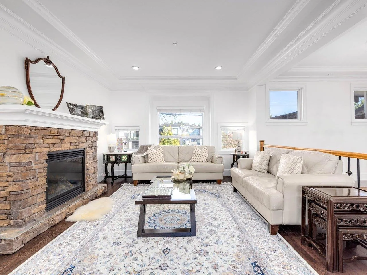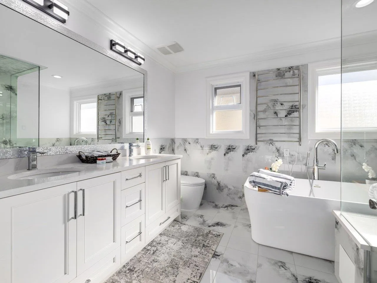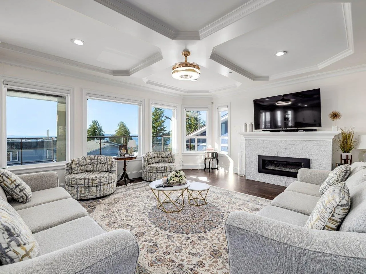 Panoramic Ocean View Home in Prime White Rock Location! Situated on a large 50' lot with lane access on the south side of Royal Avenue, this exceptional residence is just steps from shops, restaurants, and the beach. The home's inviting two-storey open-plan design features rich hardwood flooring throughout. The main level offers 3 spacious bedrooms, two of which include walk-in closets and ensuite bathrooms. Upstairs, stunning hardwood floors flow through the expansive living area and gourmet kitchen, highlighted by full granite countertops and spectacular ocean-view decks. The main deck, nearly 500 sq. ft., includes a large covered section for year-round outdoor enjoyment. The lower level features a large media room, an additional bedroom, and the 2 BDRM suite with a grade-level garage. (id:27476)