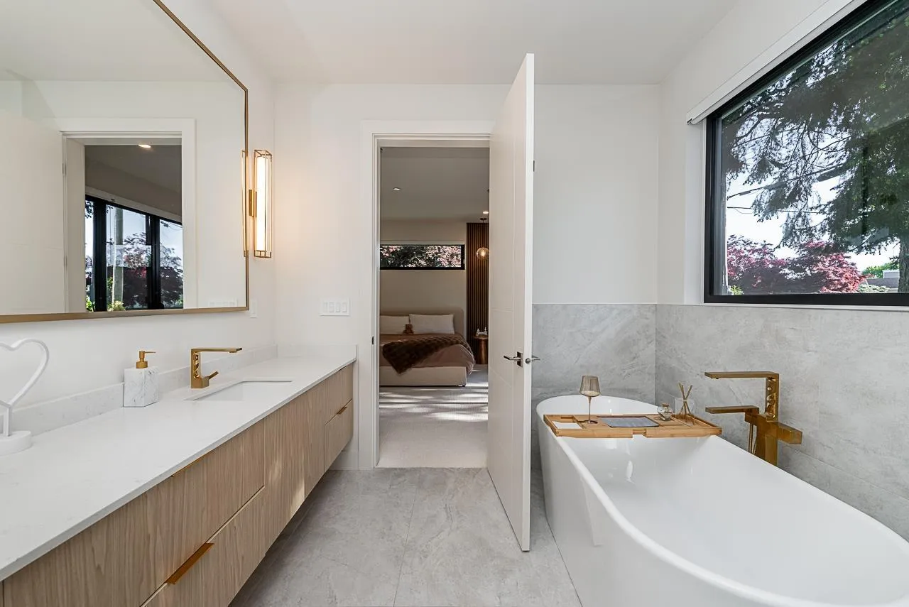 Welcome home! Perched on a south facing lot, this California-inspired home offers a perfect blend of coastal living with striking architecture. Experience open concept living designed for comfort and entertaining. Featuring high ceiling glass walls that flood the space with natural light, a rooftop terrace, expansive patios and spa-like primary suites with soaker tubs. The chef's dream kitchen features PREMIUM appliances, a stunning 12-ft waterfall island, and a double entry wok kitchen that seamlessly connects to a spacious living area and formal dining space equipped with a wine cellar and coffee nook. Featuring bedrooms on the main floor, the lower level transforms into the ultimate entertainment zone- distinguished bar, rec room, theatre room, flex living space and a legal suite. (id:27476)