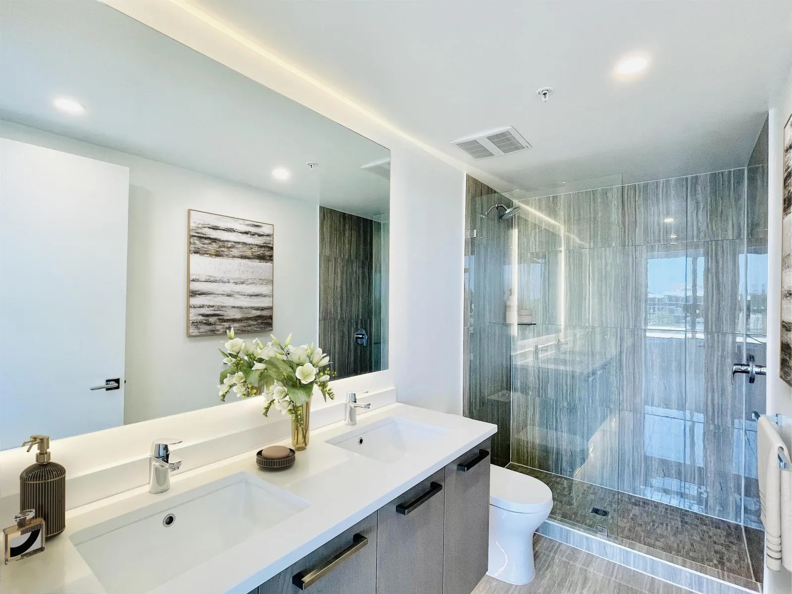 SOLEIL @ White Rock By Award-winning Cicozzi located right across Semiahmoo Shopping Centre; Almost NEW Air Conditioned 8ft6 ceiling CORNER 2 bed 2 Bath & DEN Excellent layout w/ a LARGE 333sf wrap-around Balcony. High End finishing; BOSCH 800 Series Stainless Steel appliance package (fridge, gas cooktop, oven, Microwave & hoodfan), Quartz countertops & backsplash, Soft-close cabinetry, Hardwood flooring & Roller blinds. Amenities: Building duty manager, Club house on the 2nd Floor provides outdoor patio, outdoor Hot tub, large fitness room, yoga studio, Steam & Sauna. Steps to Local stores such as Sungiven Grocery, all major banks, and over 75 stores across the Semiahmoo mall w/ dining & entertainment. TALLEST Building in White Rock. Remain 2-5-10 NHW. Please CALL now as this Wont Last. (id:27476)