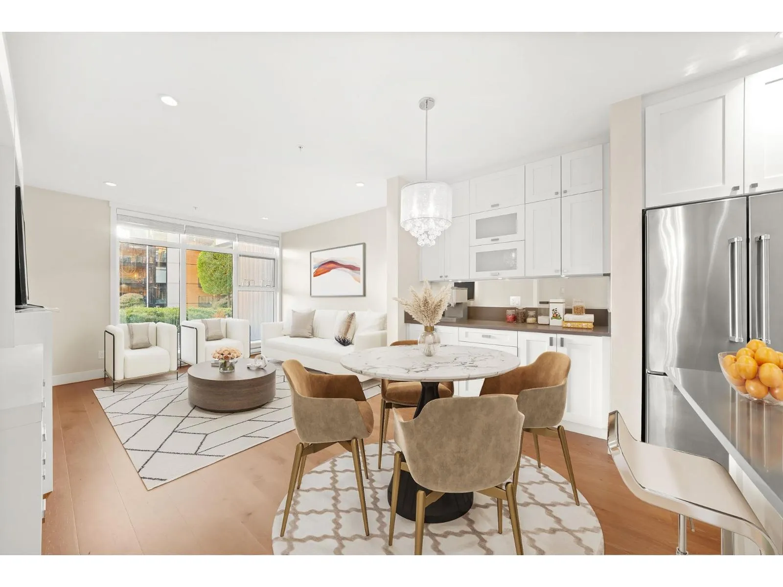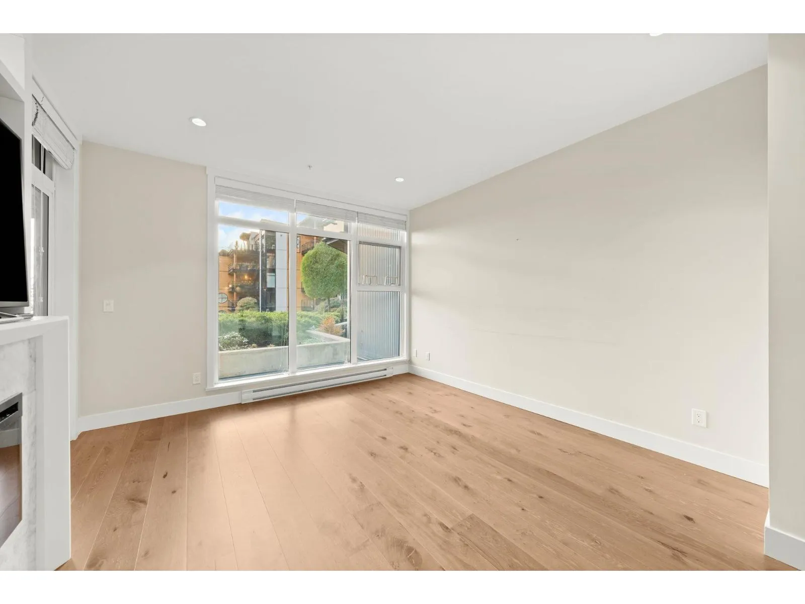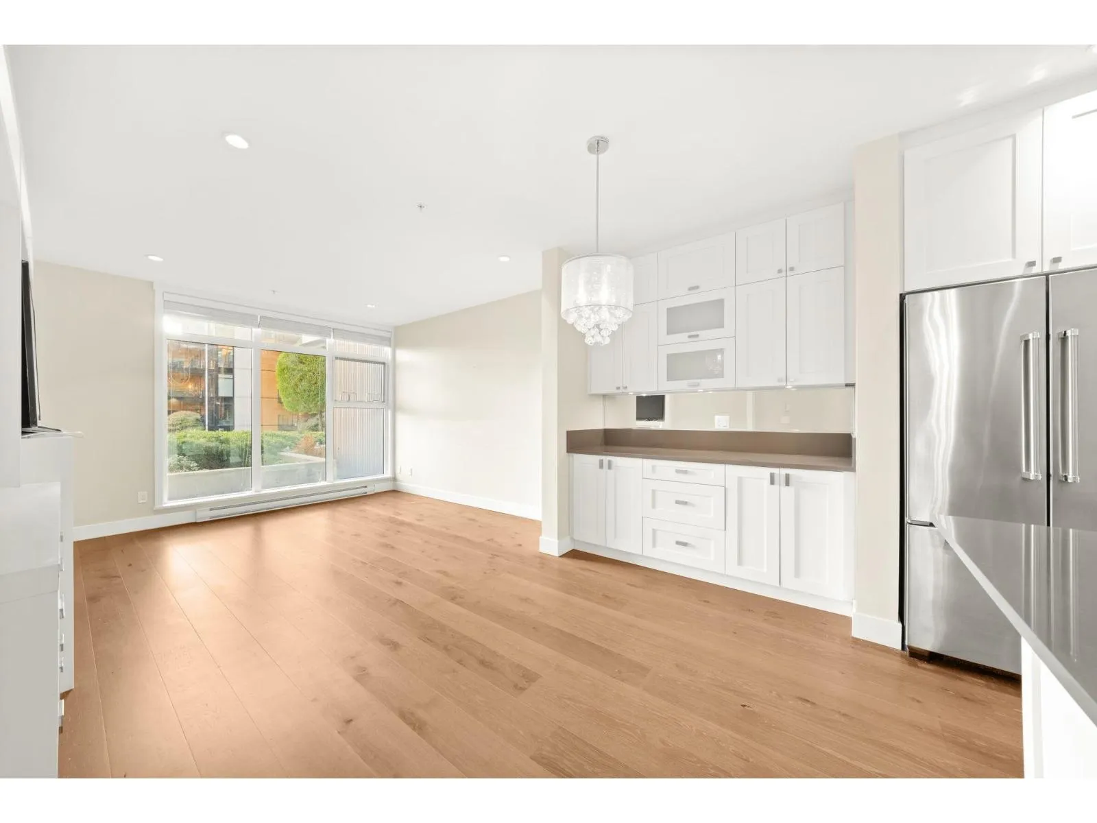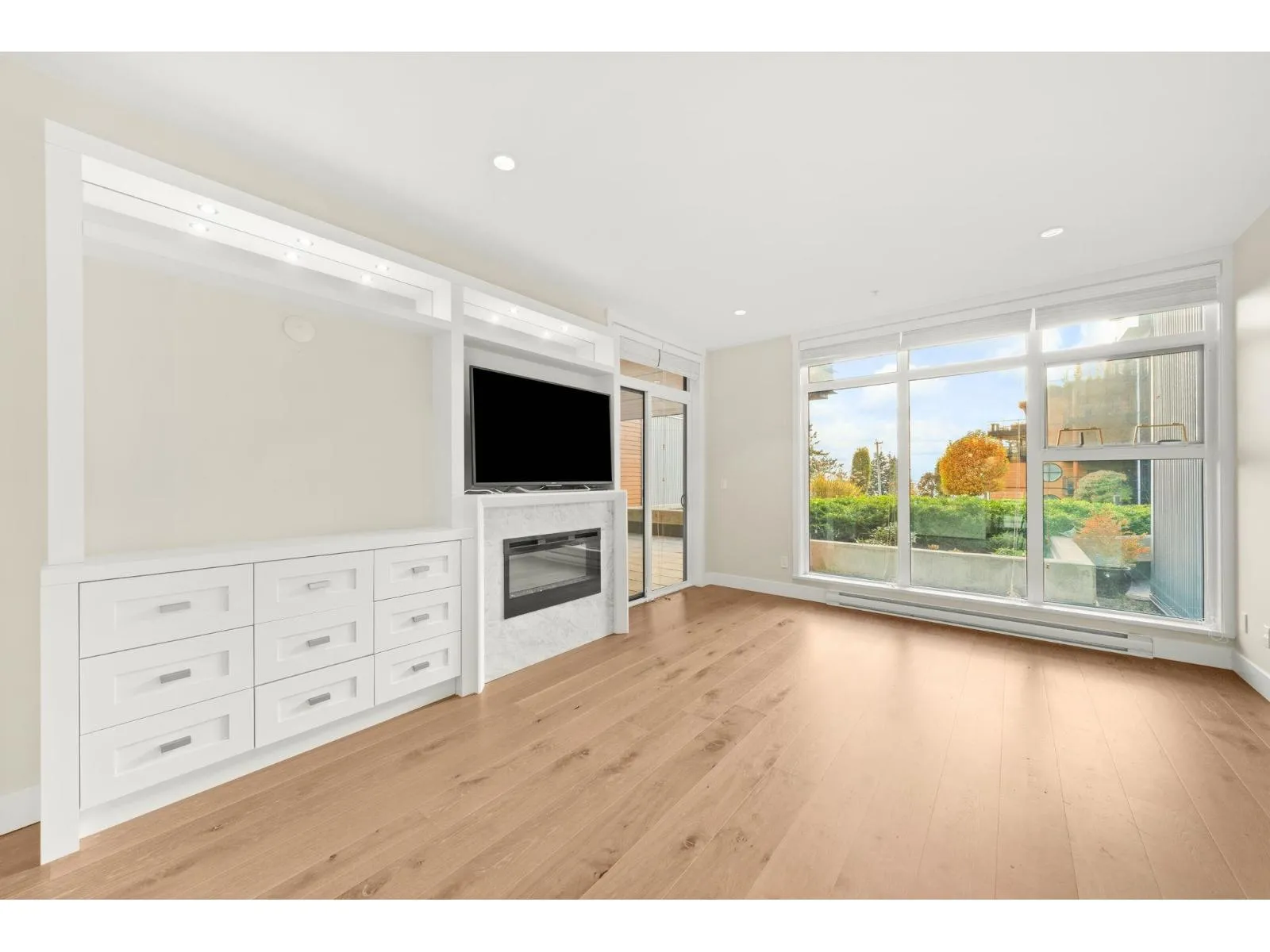White Rock's award winning ROYCE. Luxurious 1,135 sq.ft. 2 bedroom/2 bath + den ground floor condo with a distant ocean view! Spacious covered patio overlooks lush gardens. Many upgrades include gorgeous wide plank h/w floors, large windows, B/I closet organizers thru-out, A/C and gas BBQ hook up. Great room plan, 9' ceilings and gourmet kitchen with Viking appliances, stone counters, sleek white cabinets, and ample storage. Lovely sitting room with crystal fireplace, custom mantle millwork, hutch and curio cabinet. Large primary bedroom with luxurious ensuite with a double rain shower. Decent sized Den/3rd bedroom. Fireside lounge and gym just steps away. Fantastic location, walk to shopping, restaurants and the beach. No age restriction and pets allowed. (id:27476)