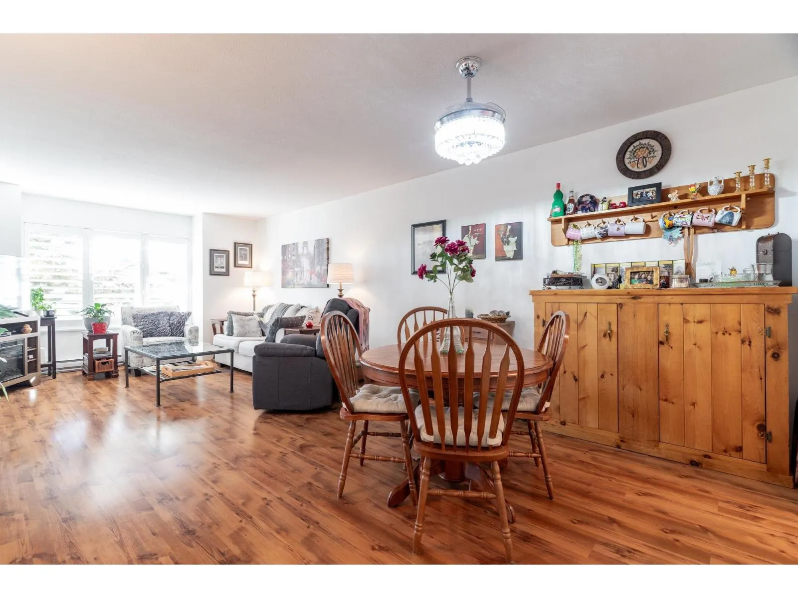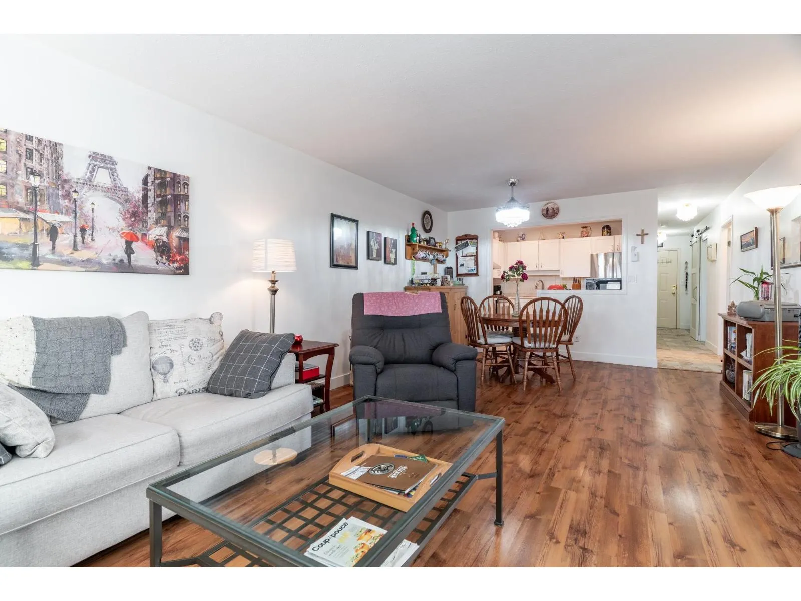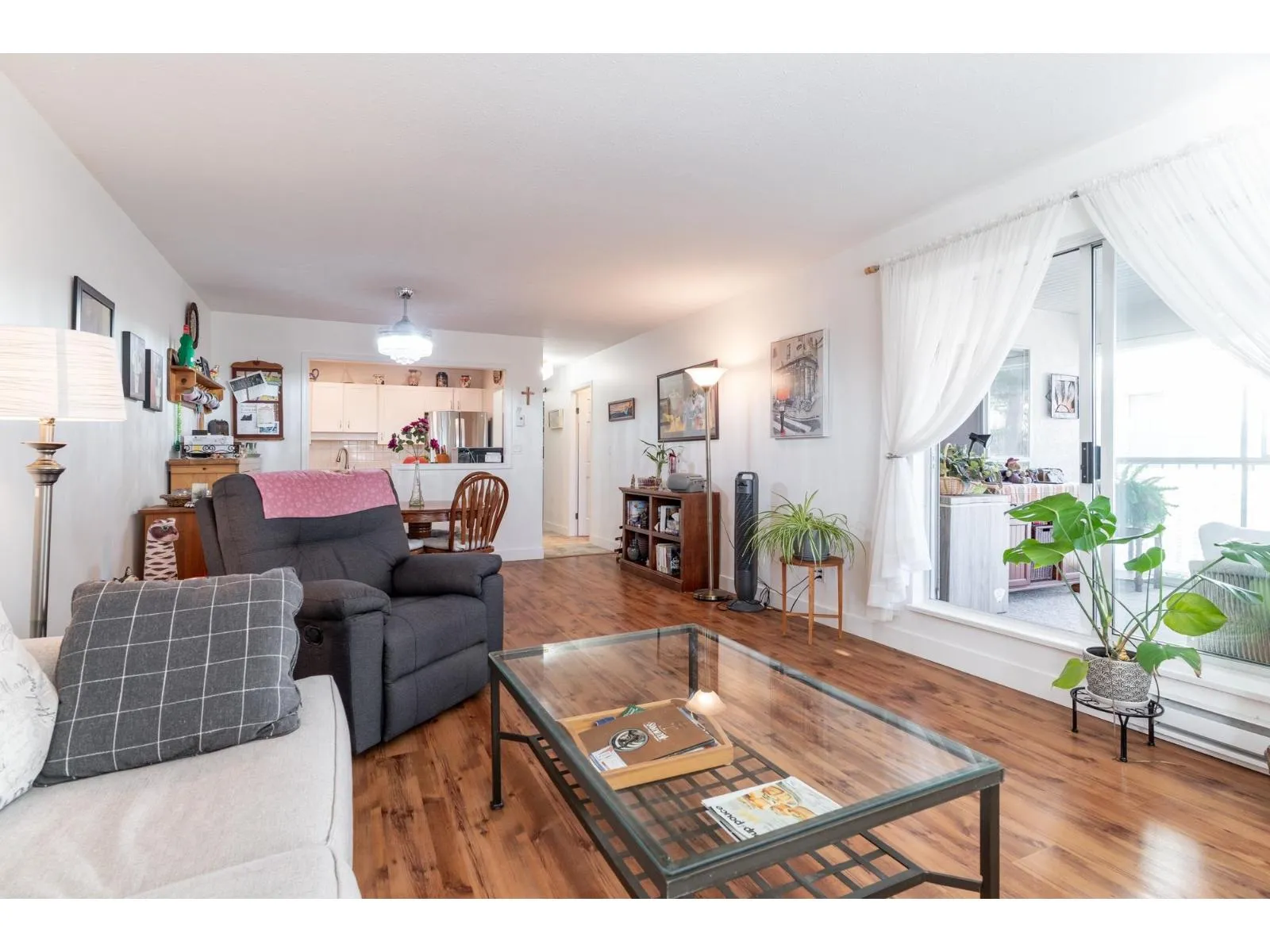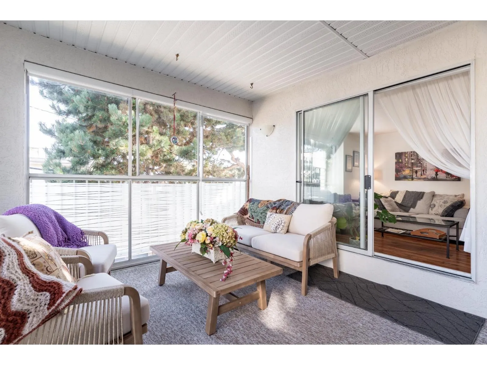 Welcome to The Carrington in Uptown White Rock! This beautifully updated 2-bedroom, 2-bathroom home offers 1,143 sq.ft. of bright, functional living space, + additional 154 sq.ft. of enclosed solarium-style space-perfect for a home office, reading nook, or extra lounging area. Newer laminate flooring in both bedrooms. Kitchen & bathrooms nicely updated w/modern new white cabinet doors and new tile flooring. South-facing windows flood the home with natural light, offering a warm, inviting atmosphere & even a small peek-a-boo ocean view! A full-sized laundry room adds everyday convenience. The well-maintained building features secure underground parking, a workshop, and a rec/party room. One resident must 55 and one cat allowed. Fantastic location close to all amenities! (id:27476)