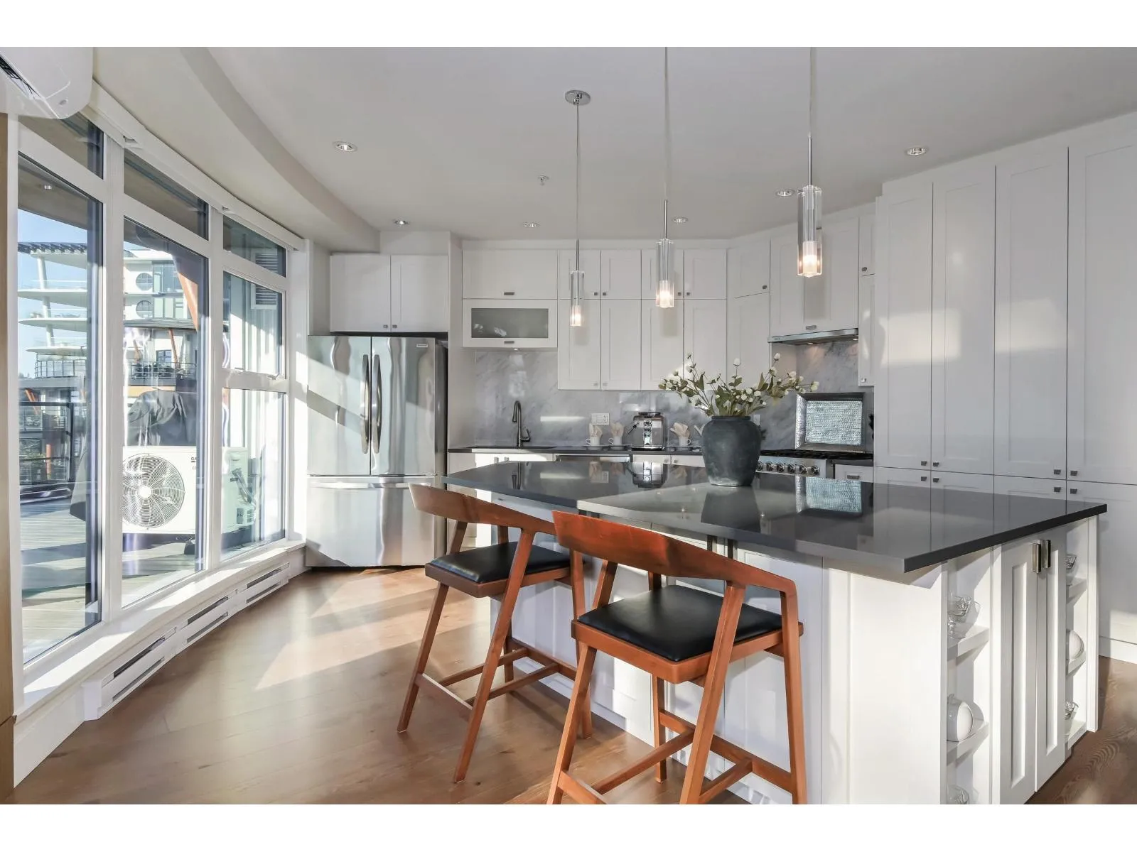 True luxury living awaits in this one-of-a-kind sub-penthouse at the award-winning Royce in White Rock. Enjoy breathtaking, south-facing panoramic ocean views and over 1,527sq. ft. of expansive patio space, perfect for outdoor entertaining or quiet relaxation. This beautifully designed open floor plan is thoughtfully laid out to maximize natural light and ocean views from nearly every room. The bright white kitchen showcases Viking appliances, custom quartz countertops, a seamless marble backsplash, and a massive island ideal for entertaining, complemented by a private dining room, heat pump with Air Conditioning. Building amenities include a large fitness centre and an elegant residents' lounge for hosting gatherings. Includes 5 parking stalls and 2 storage lockers. (id:27476)