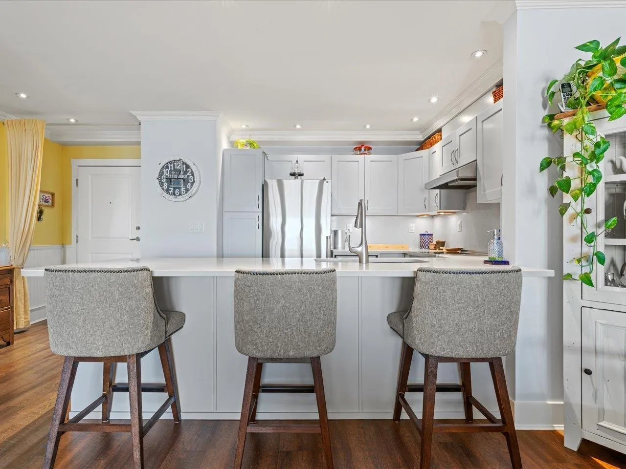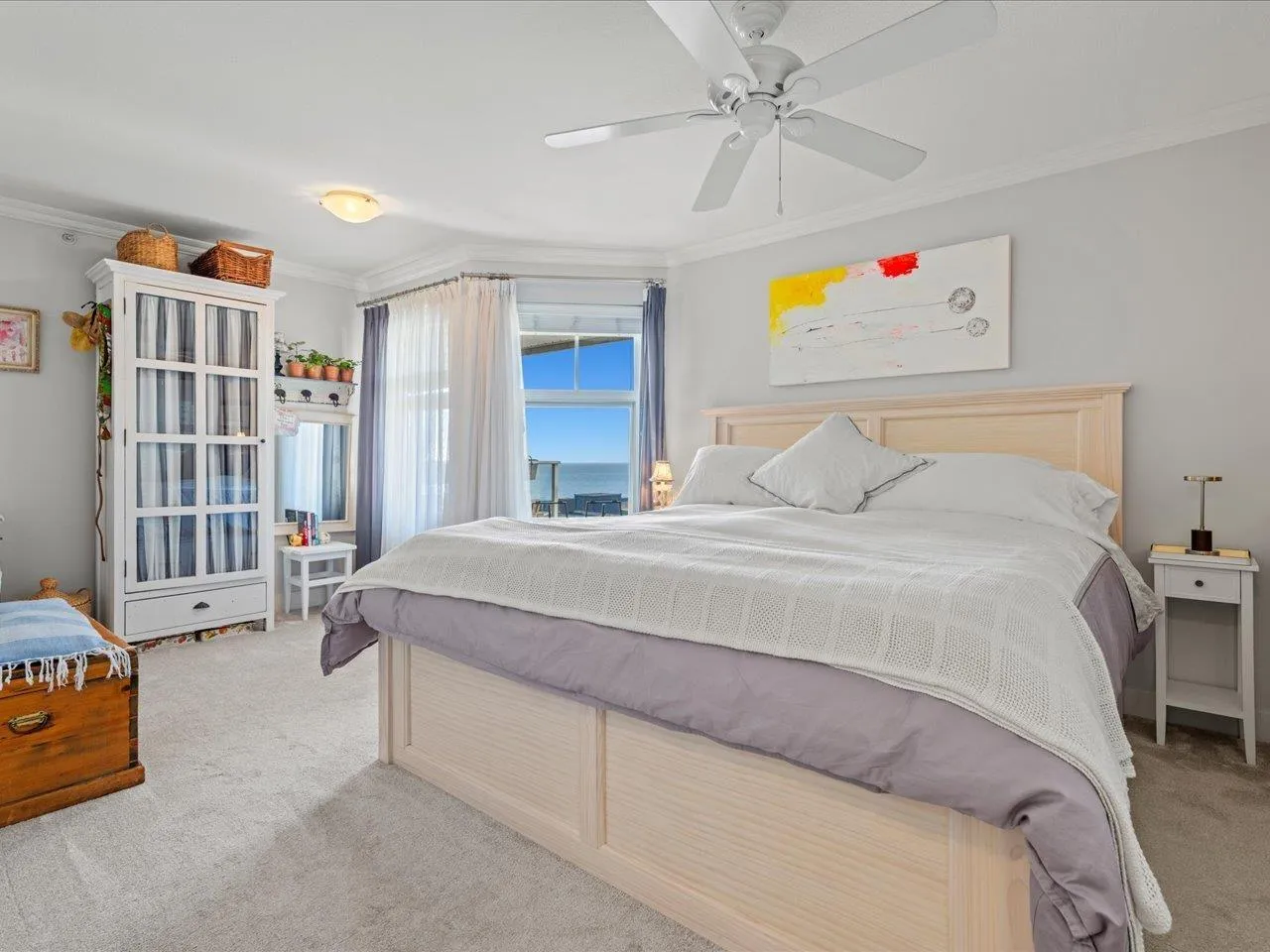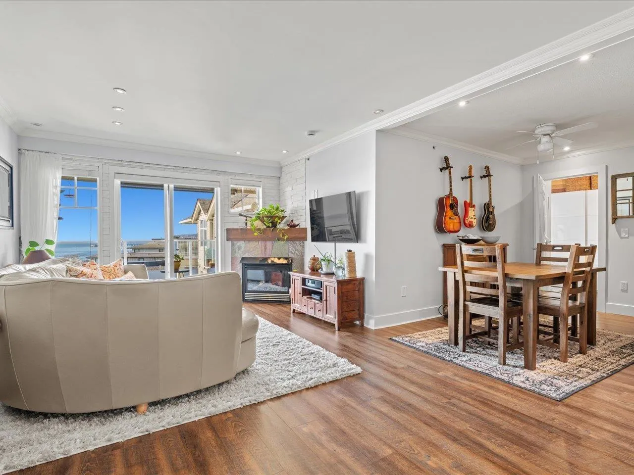 Life looks a little different from the top! Stunning southwest ocean views take centre stage in this top-floor 1 bed + den, 2 bath home, filling the space with light and calm. Designed to feel elevated and welcoming, the flowing layout maximizes comfort and connection to the view. The updated kitchen features quartz finishes and premium appliances, blending style and function. A refined wood fireplace mantle adds warmth, while smart storage and custom wardrobes keep the home organized. The bedroom is a quiet retreat with plush carpeting and spa-inspired bathroom. Recent building upgrades include a new roof, gutters and air handling unit, plus refreshed interior common areas with new paint, carpets and furniture. Two parking stalls and a storage locker complete this elevated coastal home! (id:27476)