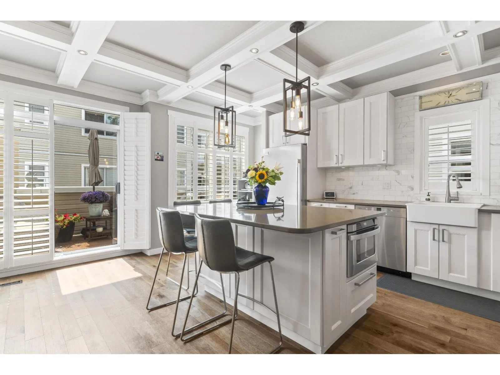 Executive-quality duplex townhome offering a true lock-and-leave lifestyle in an exclusive gated complex, steps from White Rock's Promenade, sandy beach, shops & dining. Beautifully updated, this 2026 sq.ft., 3-level home features newer hardwood floors on main & upper, newer carpets, furnace & HWT (2017), plus A/C (2022). Bright open-plan main boasts a chef's kitchen with quartz island, s/s appliances & 2 gas f/ps, along with a living room featuring custom built-ins. Private decks front & back extend living outdoors. Upstairs offers 3 bdrms incl. a primary with spa ensuite & California closet, plus one with Murphy bed. Lower level adds family/games or 4th bdrm with full bath & storage room. Extras: Roof 2022, ample storage inside & out & 2-car garage. Pets Ok some breeds restricted. (id:27476)