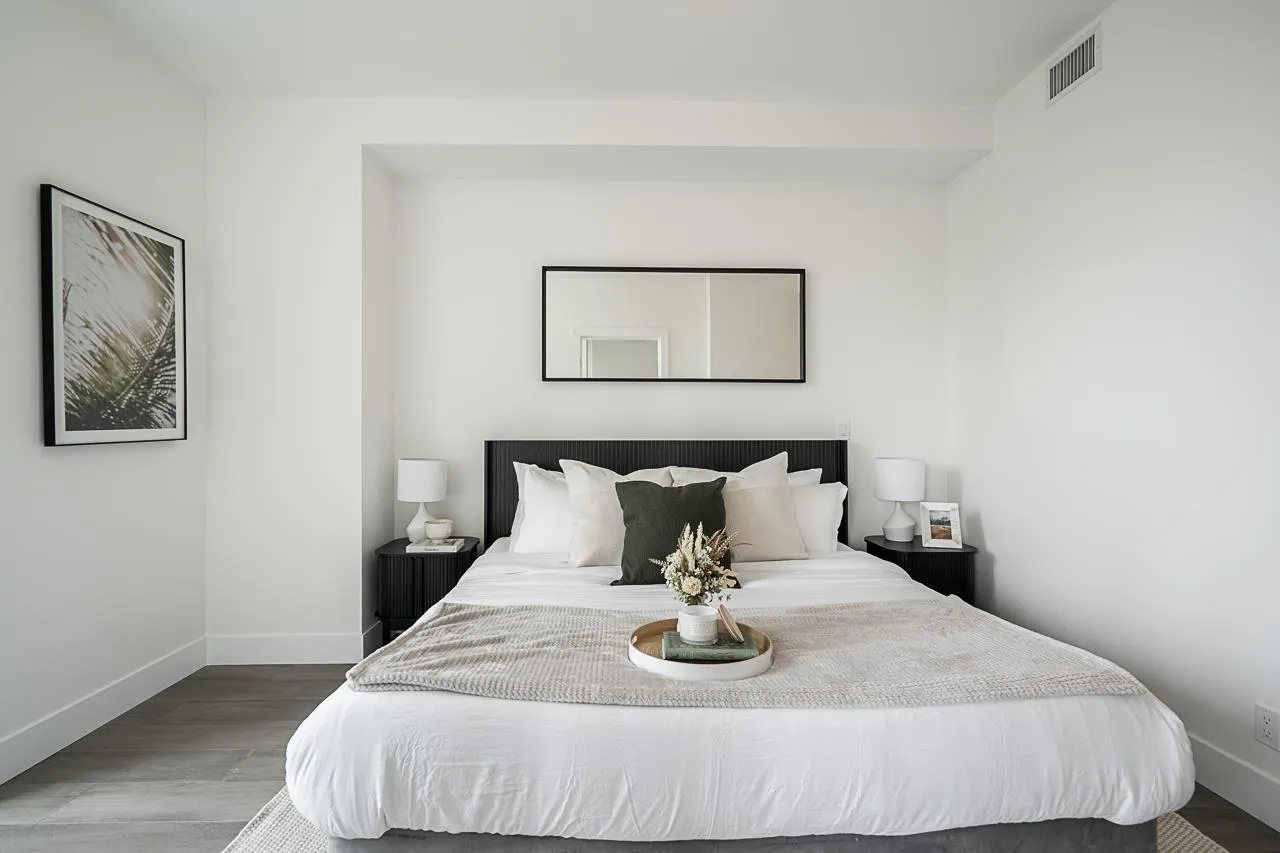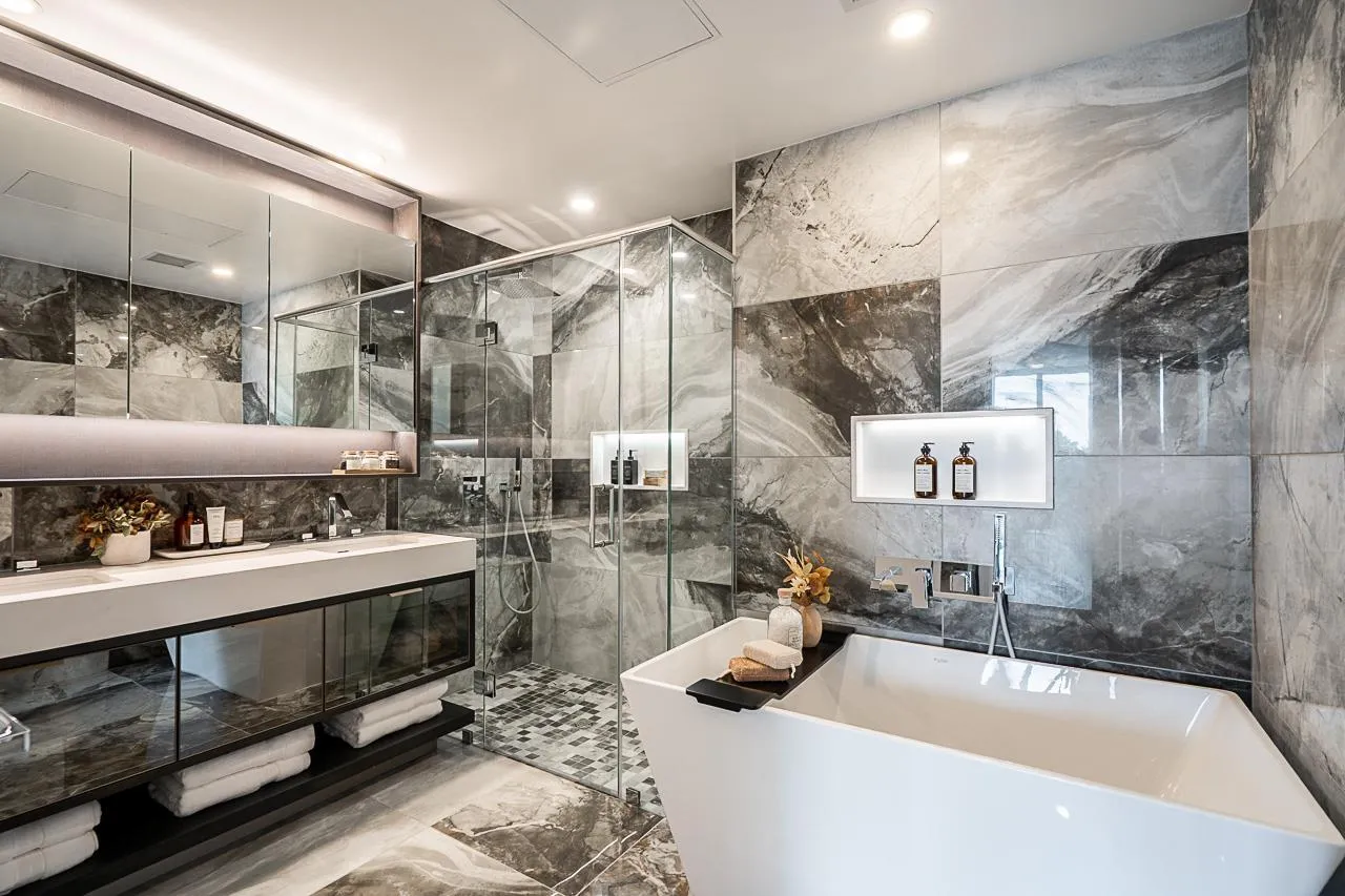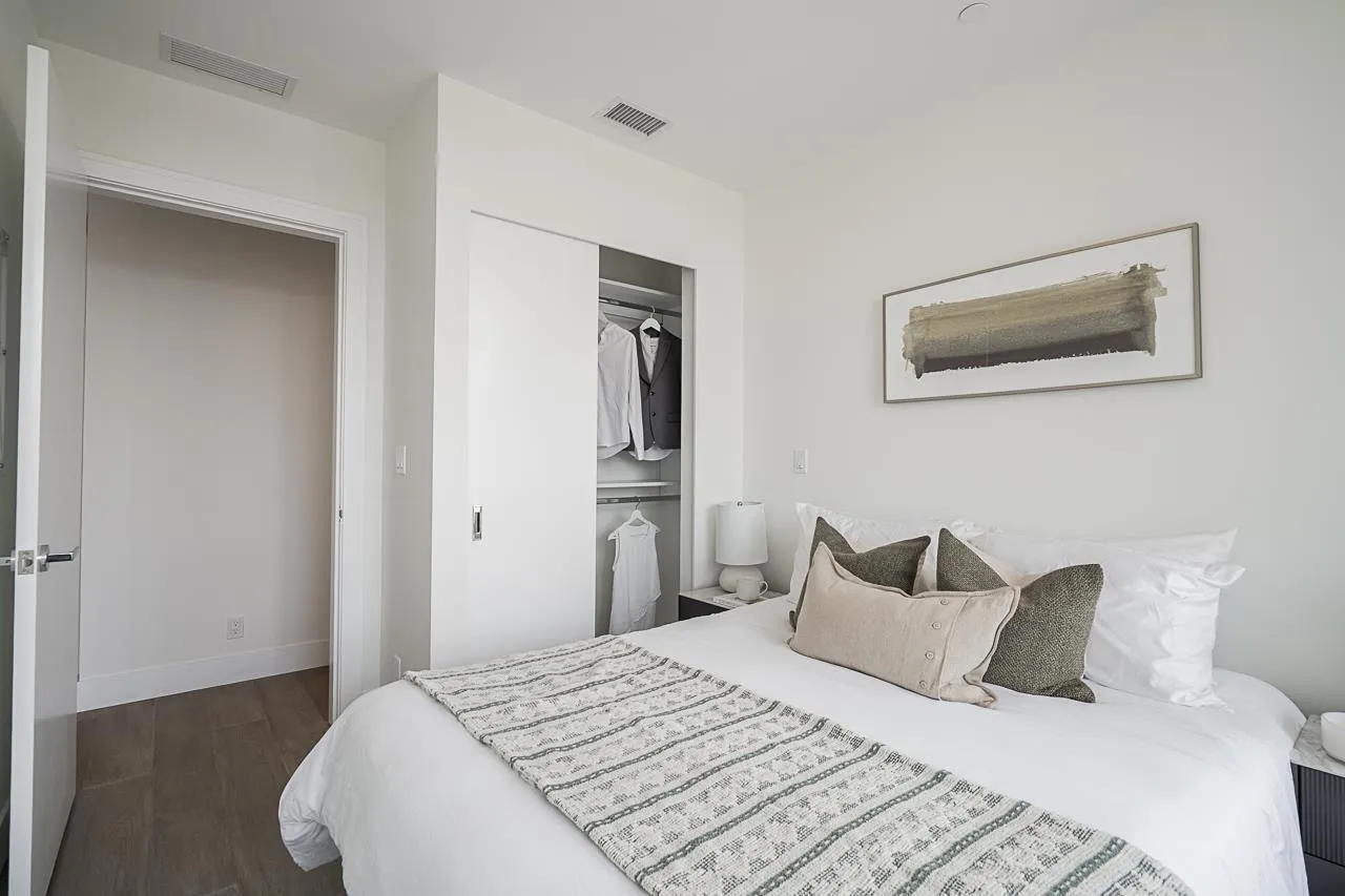 Monaco by Solterra - Elevated living in White Rock. 13 story concrete fully air conditioned, luxury boutique building located just South of Thrift Avenue. Two bedroom plus flex with 2 full bathrooms. Thermador appliances including a 36" fully integrated fridge, wifi enabled convection wall oven, 5 burner gas cooktop, and drawer microwave. Also included is a 24" integrated beverage fridge. Stunning custom kitchen made and designed in Italy and includes a single slab quartz backsplash and quartz hood fan cover. Do you love having a large luxurious ensuite bathroom? This home was made for you! Double vanity, heated tile floors, free standing soaker tub, separate water closet and large stand up shower. (id:27476)